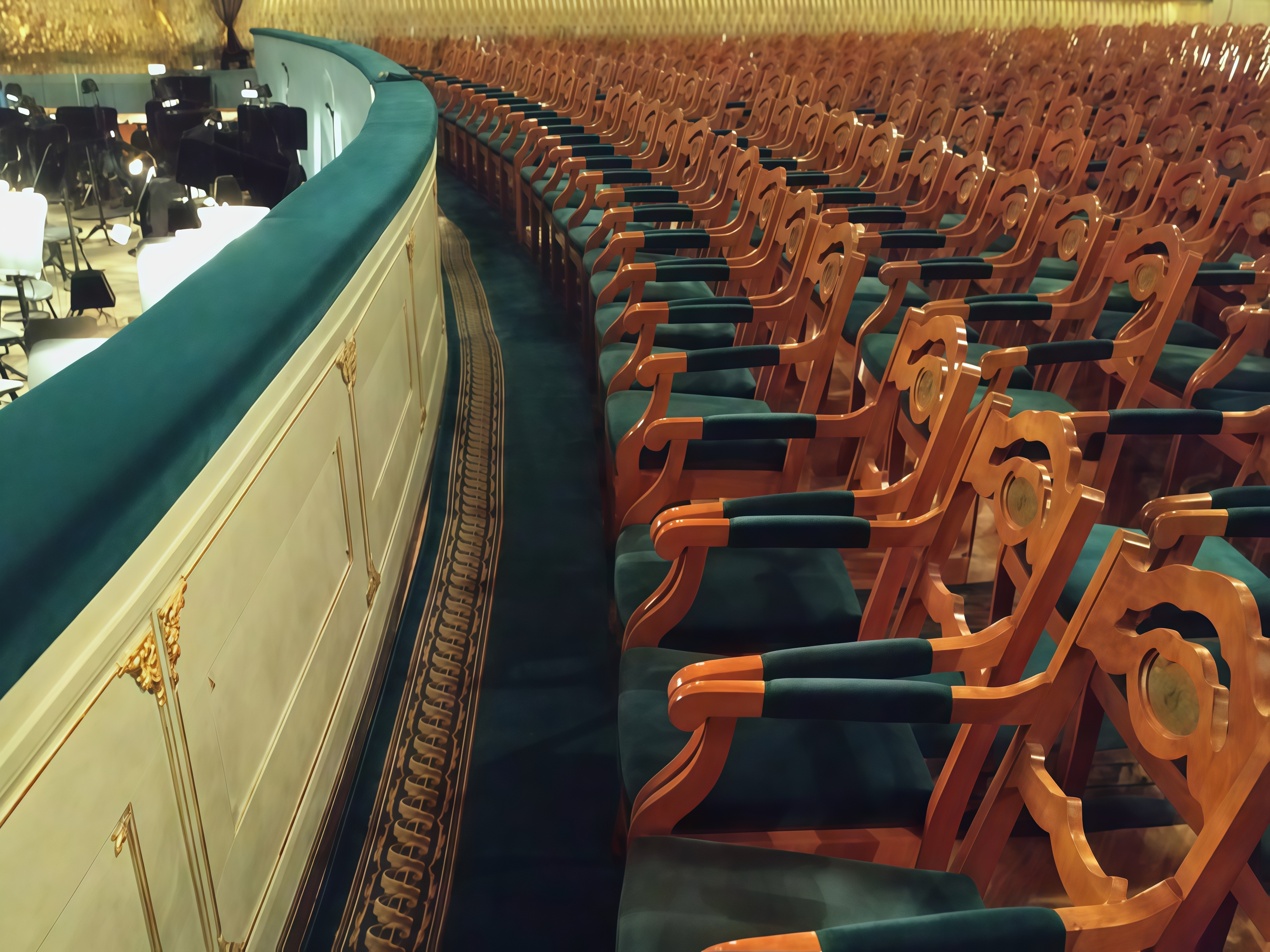 Места в концертном зале расположены вокруг сцены: акустика прекрасная в любой точке, будь то партер, амфитеатр, бенуар, бельэтаж или балкон. Всего здесь 1100 сидений и, строго говоря, слушать концерт можно с любого. Но лучше выбрать партер, бенуар или балкон, если не хотите, чтобы артист стоял к вам спиной.