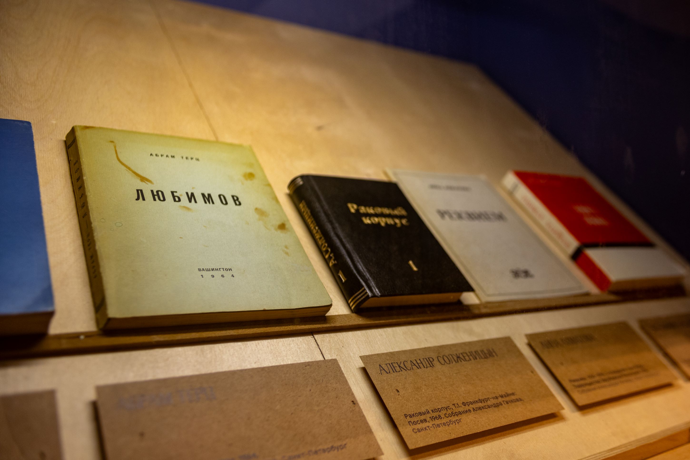 Литературная часть экспозиции начинается в условной «парадной». На лестнчном пролёте создали мини-библиотеку, в которую вошли значимые для оттепели произведения. Большинство из них легко встретить в любой советской квартире — несколько томов Тургенева, Чехов, Толстой, Горький, Жюль Верн, та самая «Оттепель» Эренбурга и сборник Олеши с иллюстрациями Збарского (Довлатов говорил, что именно эти рисунки открыли оттепель). За стеклом — ценный тамиздат: «Реквием» Ахматовой, «Раковый корпус» Солженицына, «Защита Лужина» Набокова, проза Цветаевой, «Дублинцы» Джойса.