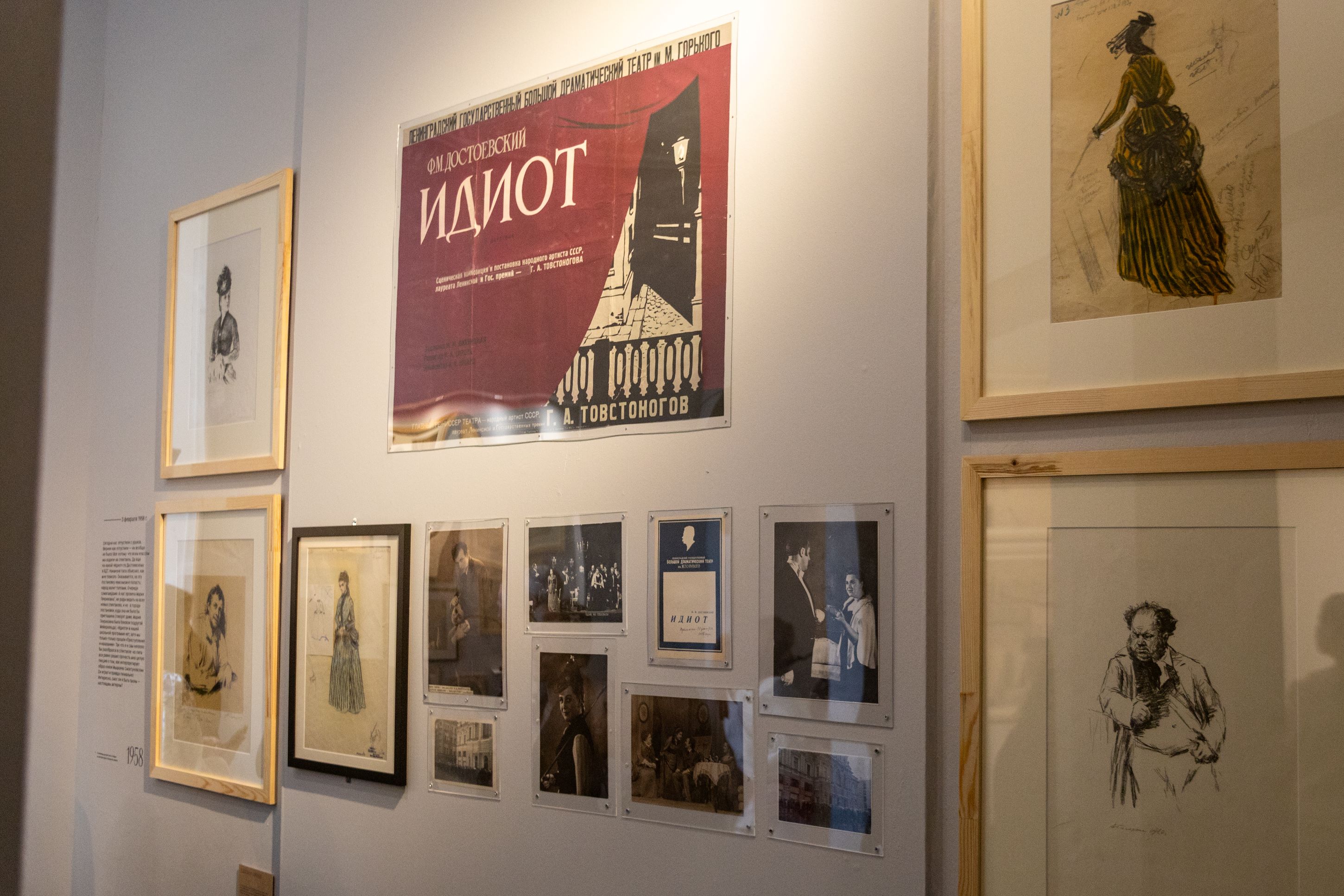 Главное событие оттепельной театральной жизни Ленинграда — премьера «Идиота» Георгия Товстоногова. Из БДТ и музея Достоевского на выставку передали связанные со спектаклем предметы. Например, фотографии очередей, которые выстраивались за билетами в кассу. А также афишу, программку, кадры с артистами, рисунки и литографии Александра Галеркина. Среди них особенно выделяется портрет Смоктуновского в роли князя Мышкина.