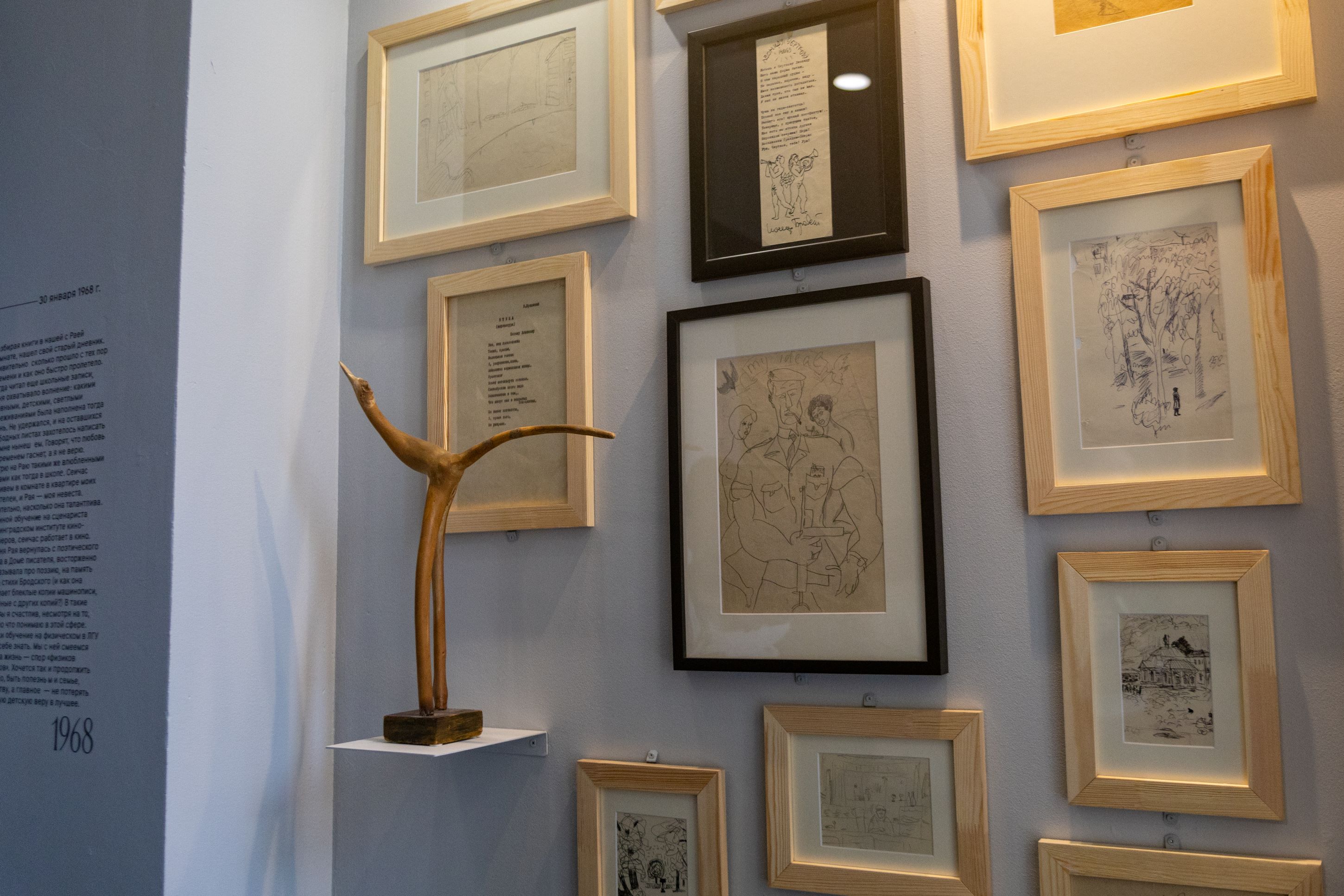 Далее речь идёт о «Вечере творческой молодёжи Ленинграда», который прошёл в Доме писателя в 1968 году. Там выступали Иосиф Бродский, Сергей Довлатов, Александр Городницкий, Татьяна Галушко, Валерий Попов. Правда эпохальный момент не был задокументирован. Поэтому посвящённый ему раздел иллюстрируют, в основном, рисунки Бродского из фондов музея «Полторы комнаты». Три работы, включая посвящение Леониду Черткову и ироничную «Мой идеал» (My Ideal), показывают публике впервые. Можно также прочитать стихотворение Бродского «Птица», посвящённое Натану Альтману — вот зримая связь между 1910-ми и 1960-ми.