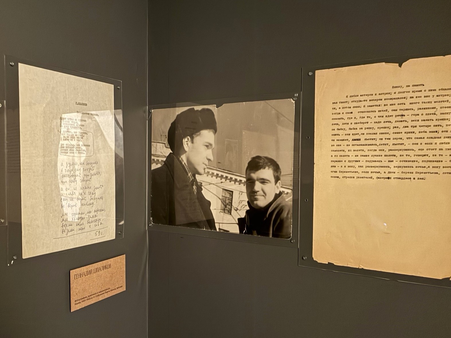 Предметы на выставку поступили из Эрмитажа, центра «Прожито» Европейского университета, букинистического магазина «Академия», музея «Полторы комнаты», музея БДТ, музея Достоевского, музея Анны Ахматовой в Фонтанном доме и частных коллекций. Рукописи и машинописи стихов Геннадия Шпаликова на выставку передал его друг, киновед, историк кино Наум Клейман. Они познакомились во время обучения во ВГИКе, а на занятиях по военному делу вели тетрадь «безмолвных разговоров».