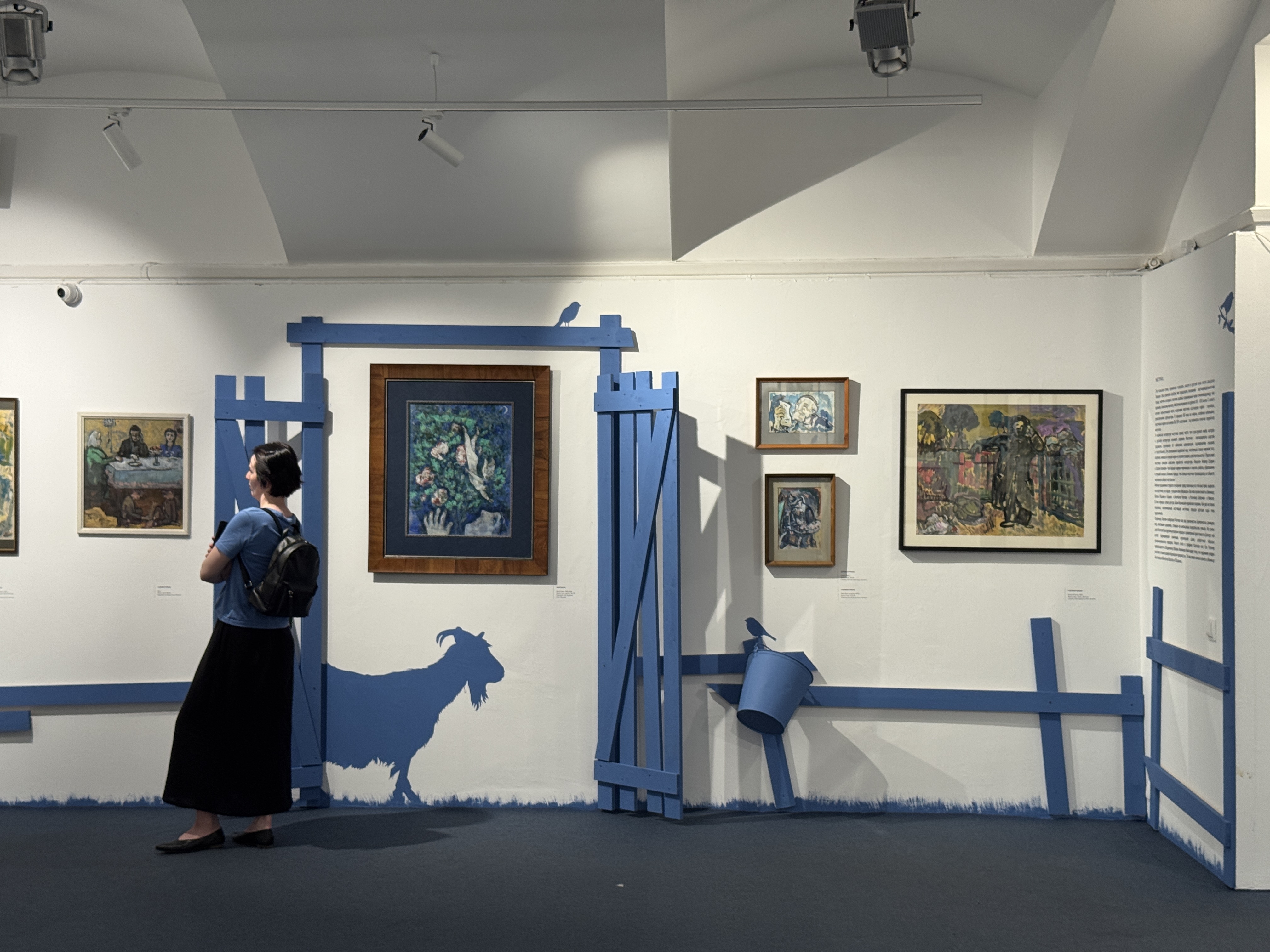 Выставка организована вместе с центром «Петербургская иудаика» Европейского университета и хороша по многим причинам. Во-первых, здесь много известных имён — Марк Шагал, Натан Альтман, Исаак Бродский, Исаак Аскназий, Анатолий Каплан, Соломон Гершов и многие другие. Во-вторых, наряду с известными произведениями (как «Еврейская свадьба» из собрания Русского музея) выставляются интересные и неочевидные работы — живопись, графика, скульптура — которые редко увидишь в едином пространстве, в том числе произведения из личных коллекций современных художников — Эмиля Капелюша и не только. Наконец, проект подкупает обаятельным оформлением: в залах «пасутся» чудные синие козы, летают диковинные птицы.