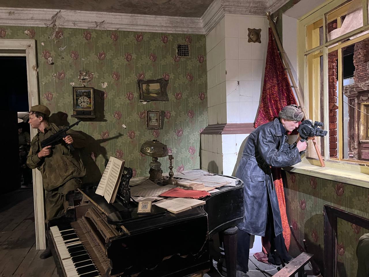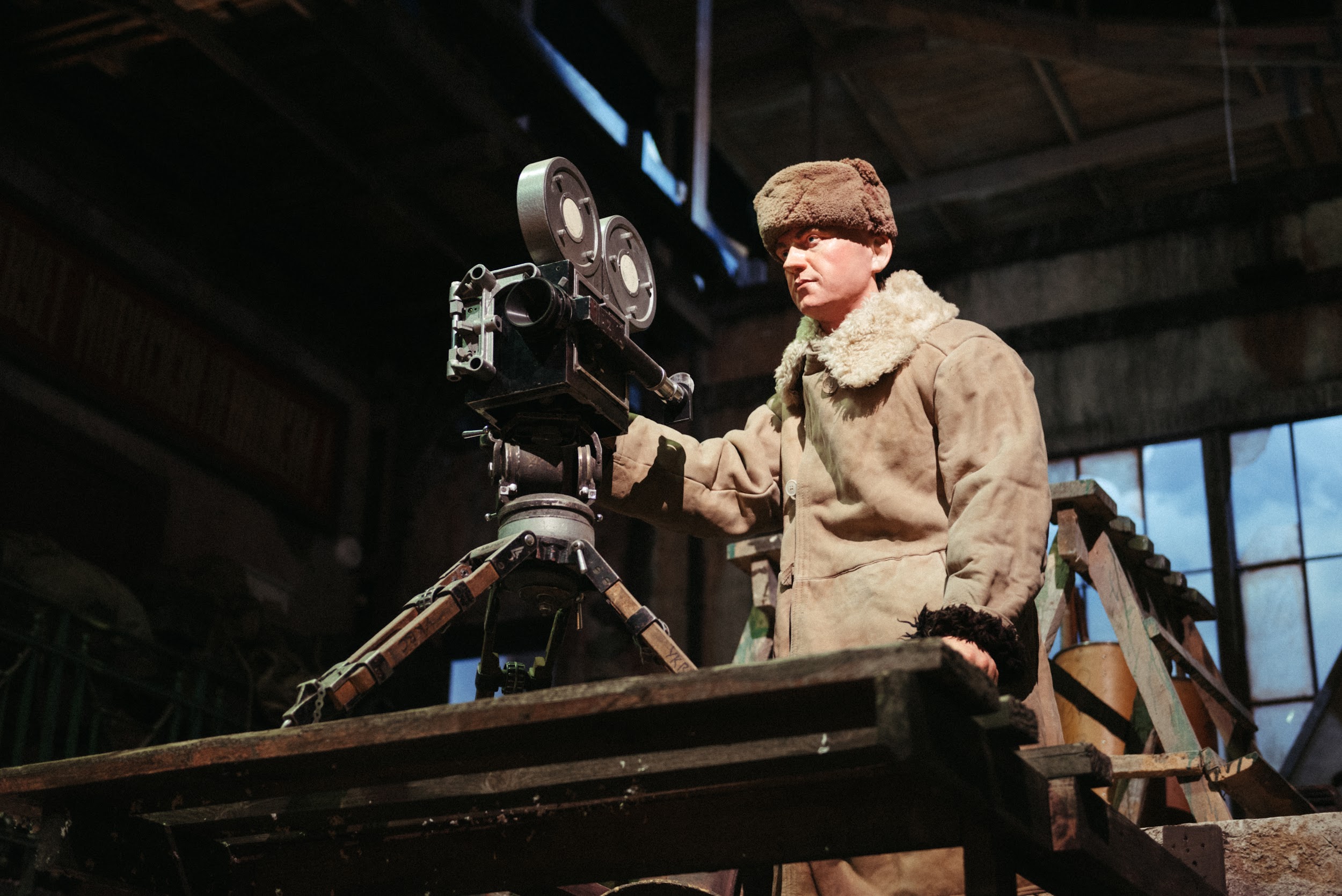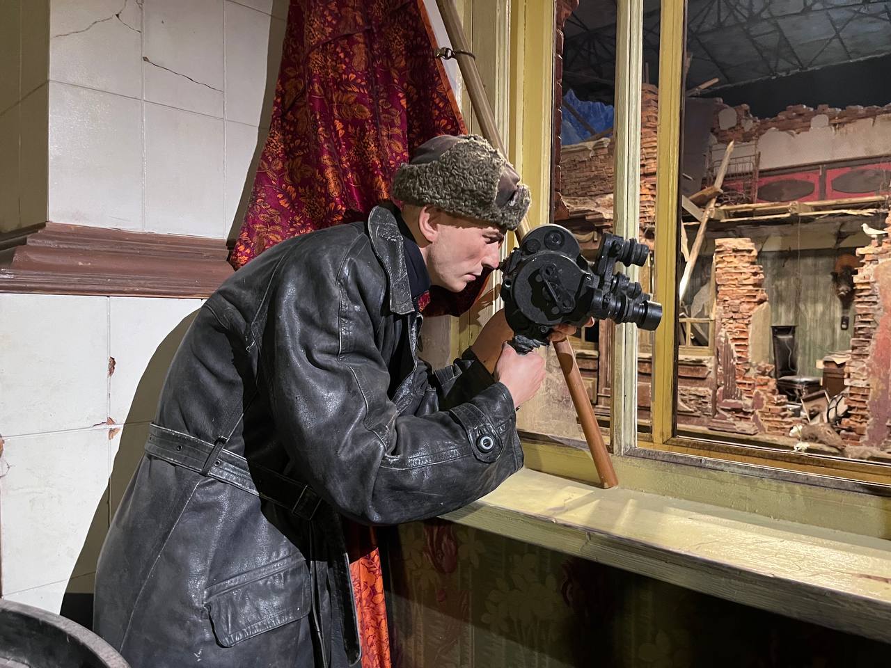 Отдельного внимания заслуживает Сталинградская битва 1942-1943 годов, которая переломила ход войны. Здесь создатели сделали акцент не на разрушении города, а на сражениях, что проходили на переправе через Волгу. Даже в такие моменты съёмки не прекращались — наперевес с ружьём и кинокамерой. Запечатлённый на выставке образ списан с реального героя — кинооператора Валентина Орлянкина, который снимал Сталинград, постоянно рискуя жизнью.