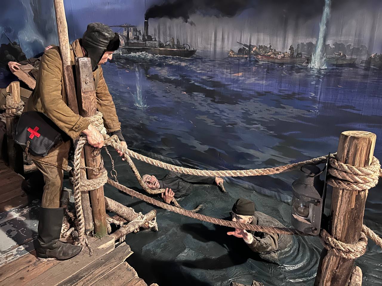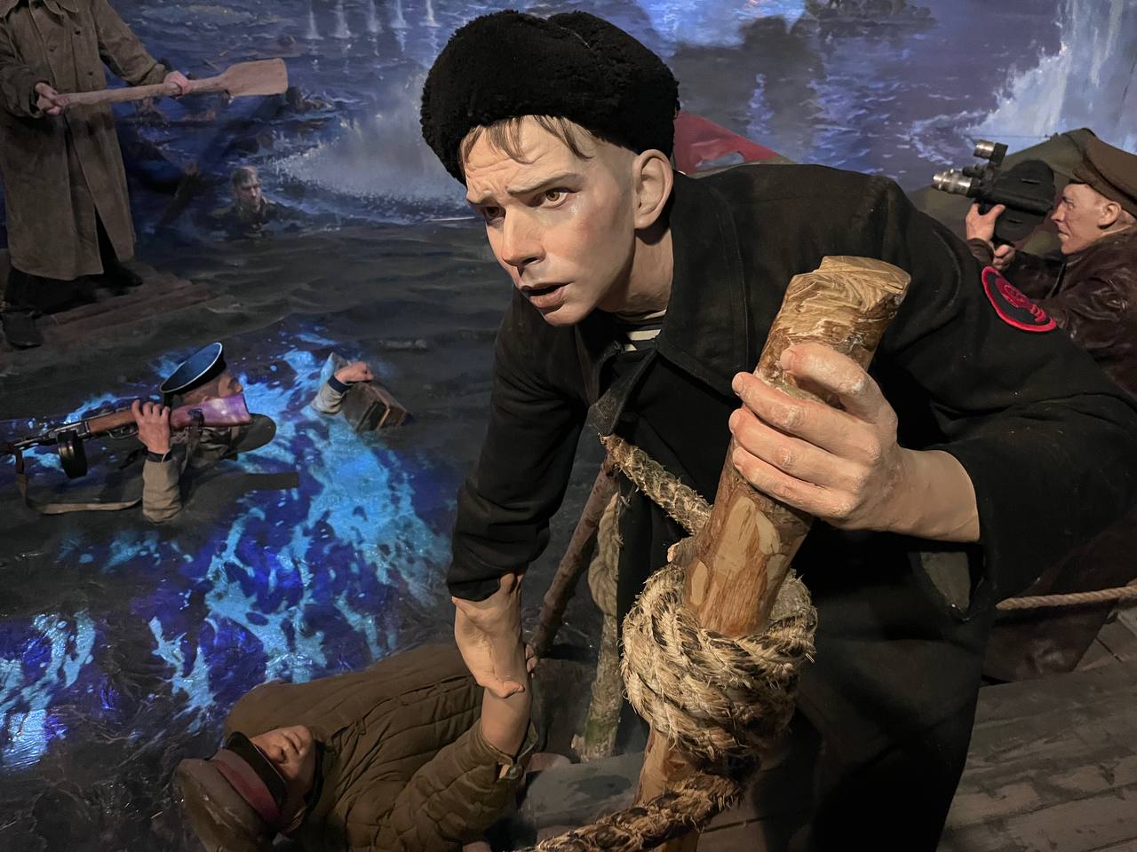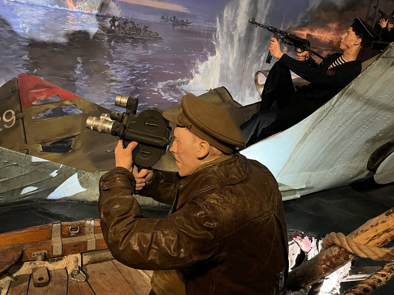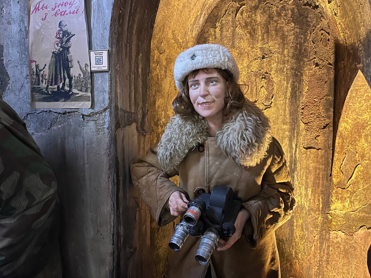 Отдельного внимания заслуживает Сталинградская битва 1942-1943 годов, которая переломила ход войны. Здесь создатели сделали акцент не на разрушении города, а на сражениях, что проходили на переправе через Волгу. Даже в такие моменты съёмки не прекращались — наперевес с ружьём и кинокамерой. Запечатлённый на выставке образ списан с реального героя — кинооператора Валентина Орлянкина, который снимал Сталинград, постоянно рискуя жизнью.