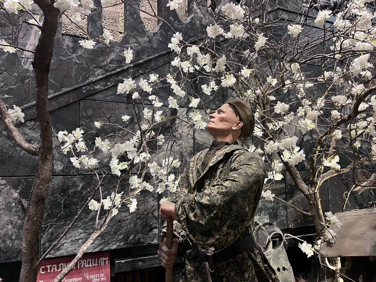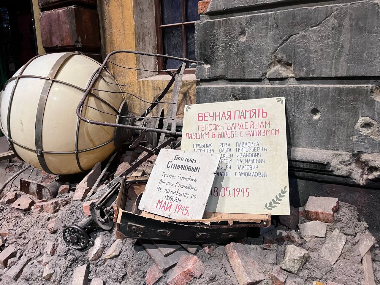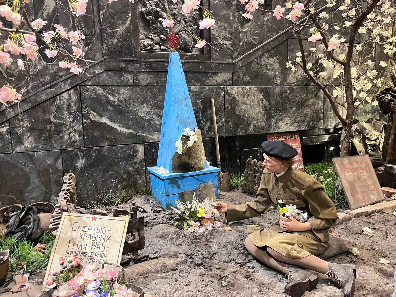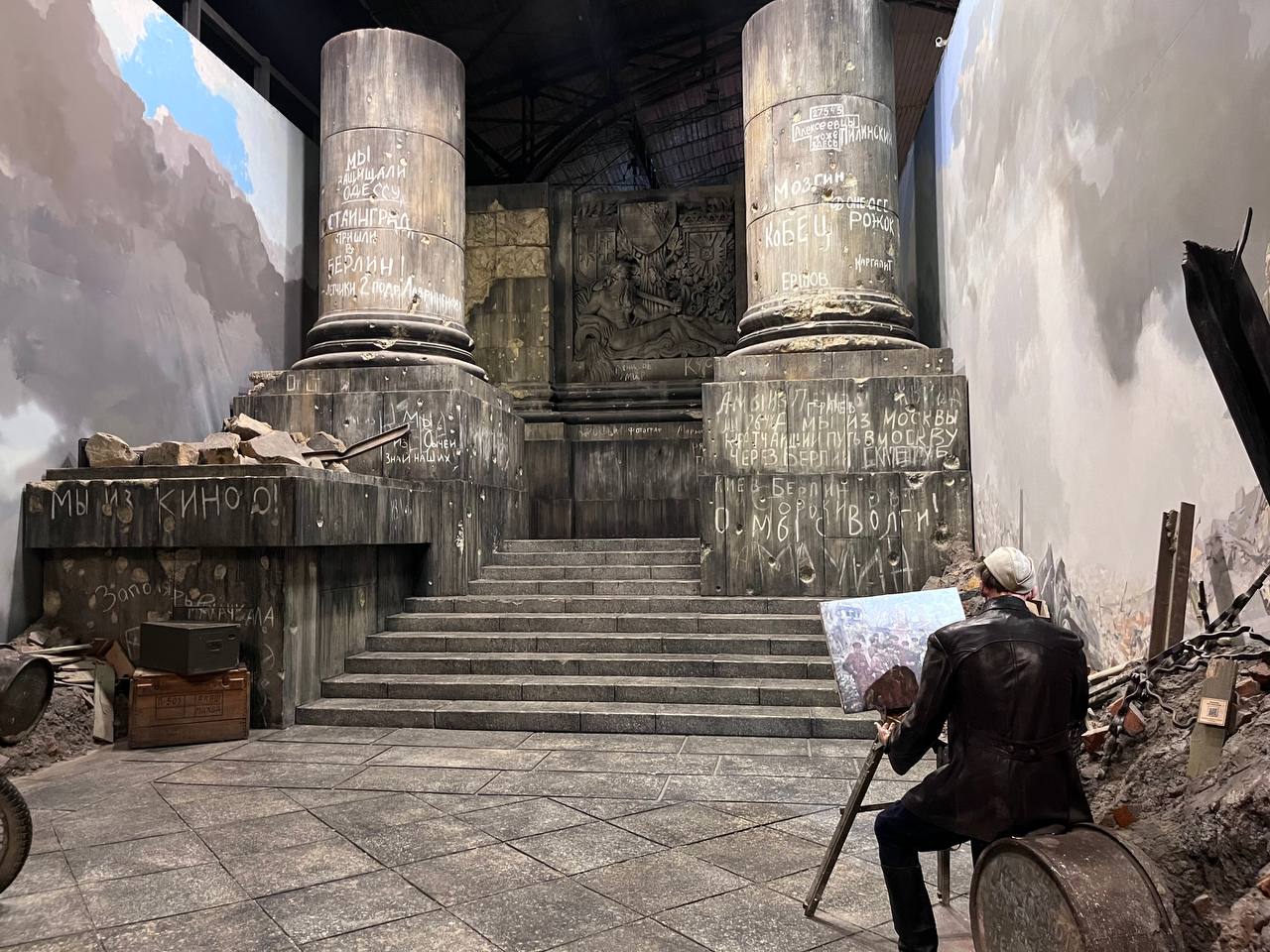 Вторую часть экспозиции отдали зданию Рейхстага. А точнее его колоннам, где красуется реально существующая надпись: «Мы из кинооо». Её, как и многие другие, запечатлели советские операторы, что вместе с войсками дошли до Берлина. К созданию правдоподобных колонн тоже подошли основательно.