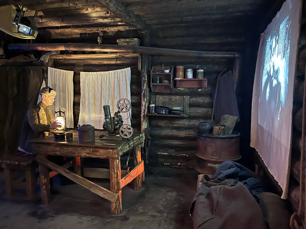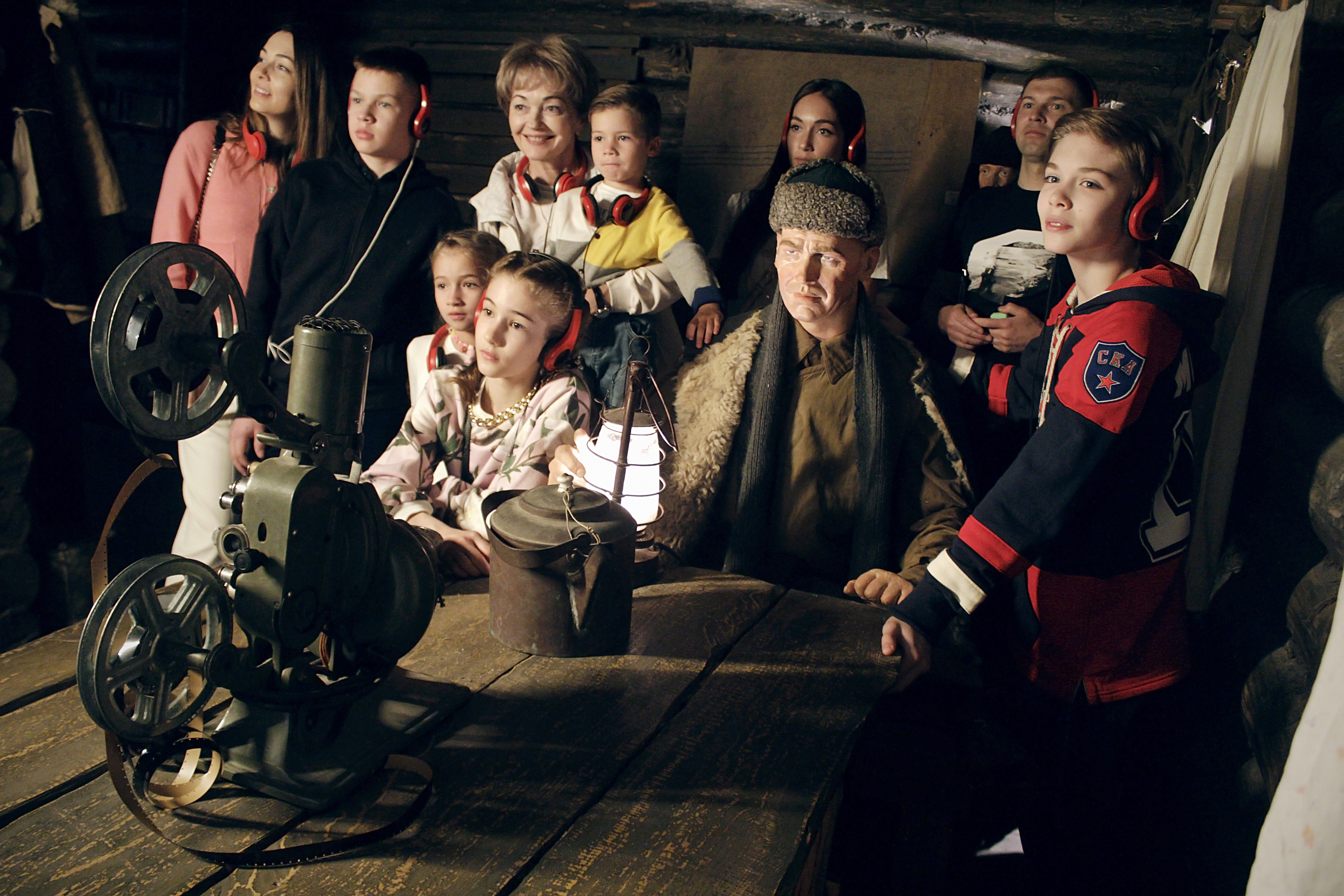 В соседнем зале заводские помещения сменяются землянкой. За столом возвышается генерал, на скамейках — пленные немцы. Все уставились в стену, где проектор крутит фильм «Антон Иванович сердится». Снявший его в 1941 году Евгением Шапиро ушёл добровольцем на фронт и пропустил премьеру своей картины. Впервые оценить свою работу ему довелось в особых обстоятельствах.