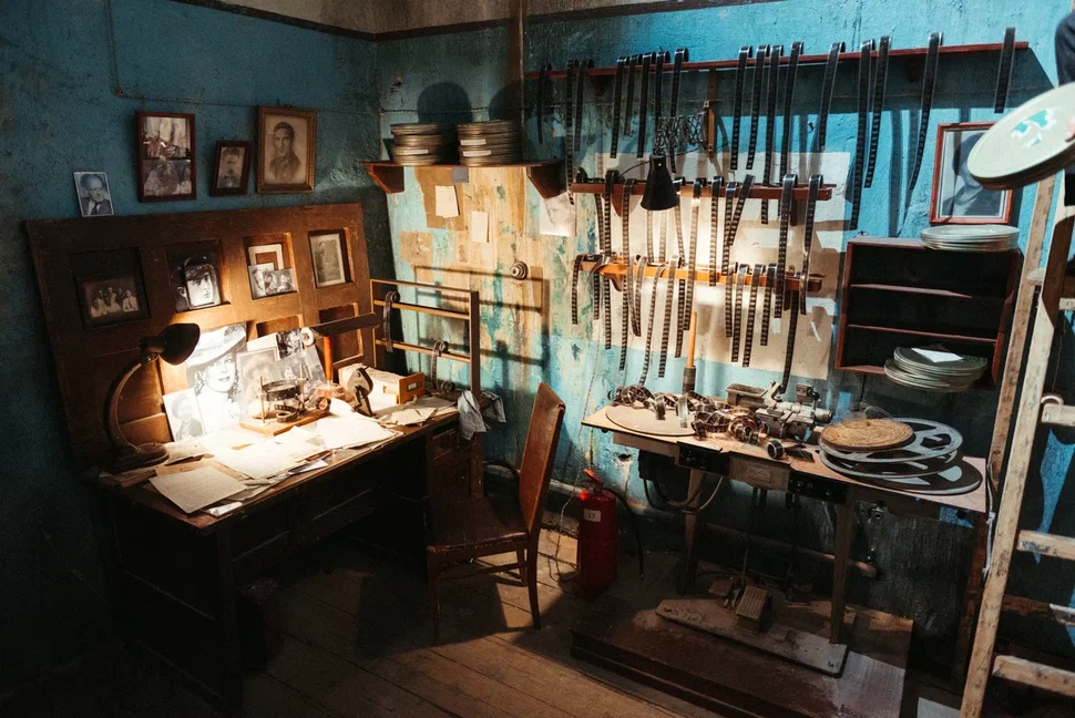 К слову, собирали фронтовые картины на Центральной студии документальных фильмов в Москве. Переместившись в следующий зал, видим её главную ценность — монтажный стол, где обрабатывали отснятый материал. Когда-то он принадлежал «Ленфильму». В окружении монтажных листов, плёнок и картотеки показывают фрагменты фильма «Фронтовой оператор» (1946) о Владимире Сущинском. Подробнее о его судьбе — в следующих комнатах.