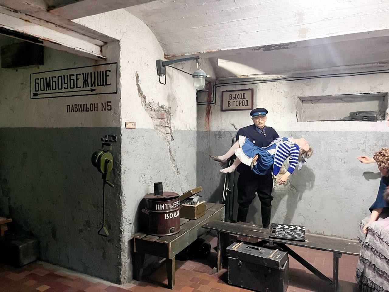 Кстати, а что тогда было с «Ленфильмом»? В августе 1941-го его эвакуировали в Алма-Аты, где продолжалась работа над военными лентами. Последним в стенах киностудии сняли «Маскарад» по драме Лермонтова. Съёмки завершили в ночь на 22 июня 1941 года, а затем практически сразу прозвучала воздушная тревога. Отсылка к этому моменту есть в зале «Бомбоубежище», где в летнем костюме запечатлён оператор «Маскарада» Валентин Горданов.
