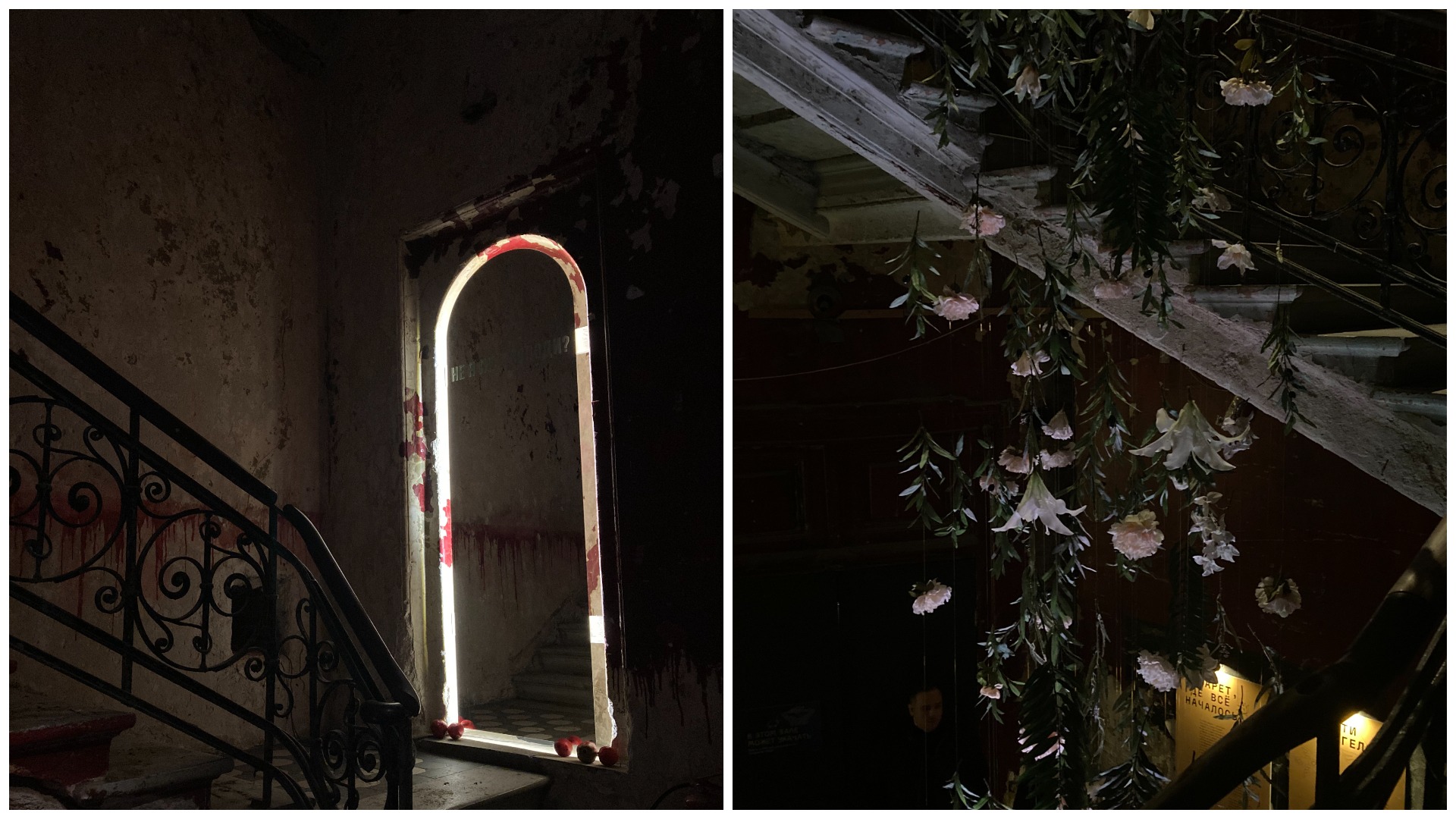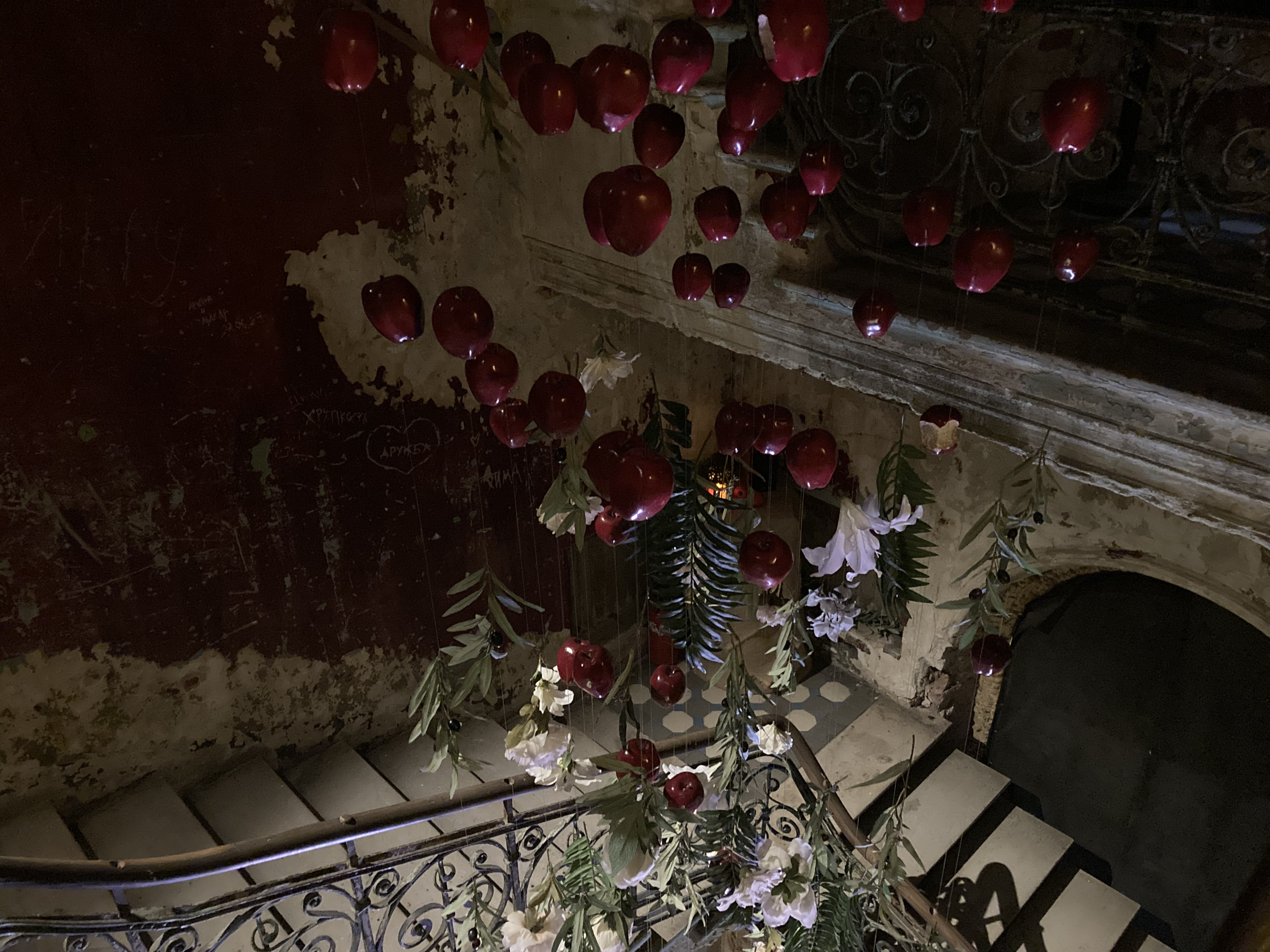 Ещё один экспонат на лестнице — камень, отсылающий к месту молитвы Иисуса Христа после Тайной вечери. Но по‑настоящему завораживает другая деталь: подвешенные цветы и яблоки, пронизывающие лестничные пролёты. Композиция отражает противопоставление двух садов: Гефсиманского, где как раз Иисус молился перед арестом и где начались его искупительные страдания, и Эдемского, в котором произошло грехопадение Адама и Евы.