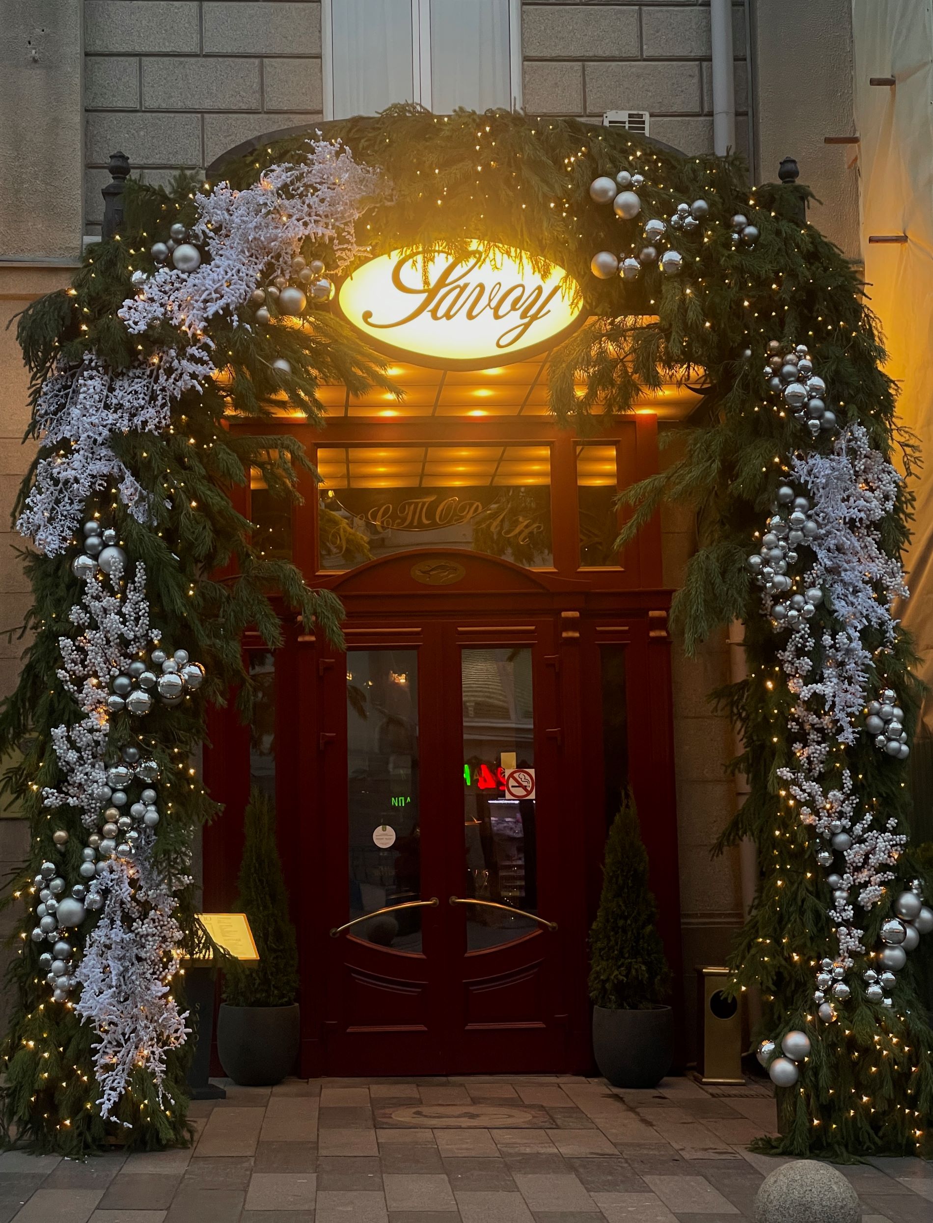Вход в исторический ресторан, открытый в 1913 году, декорировали большой хвойной гирляндой с белоснежными зимними узорами и серебряными шарами.