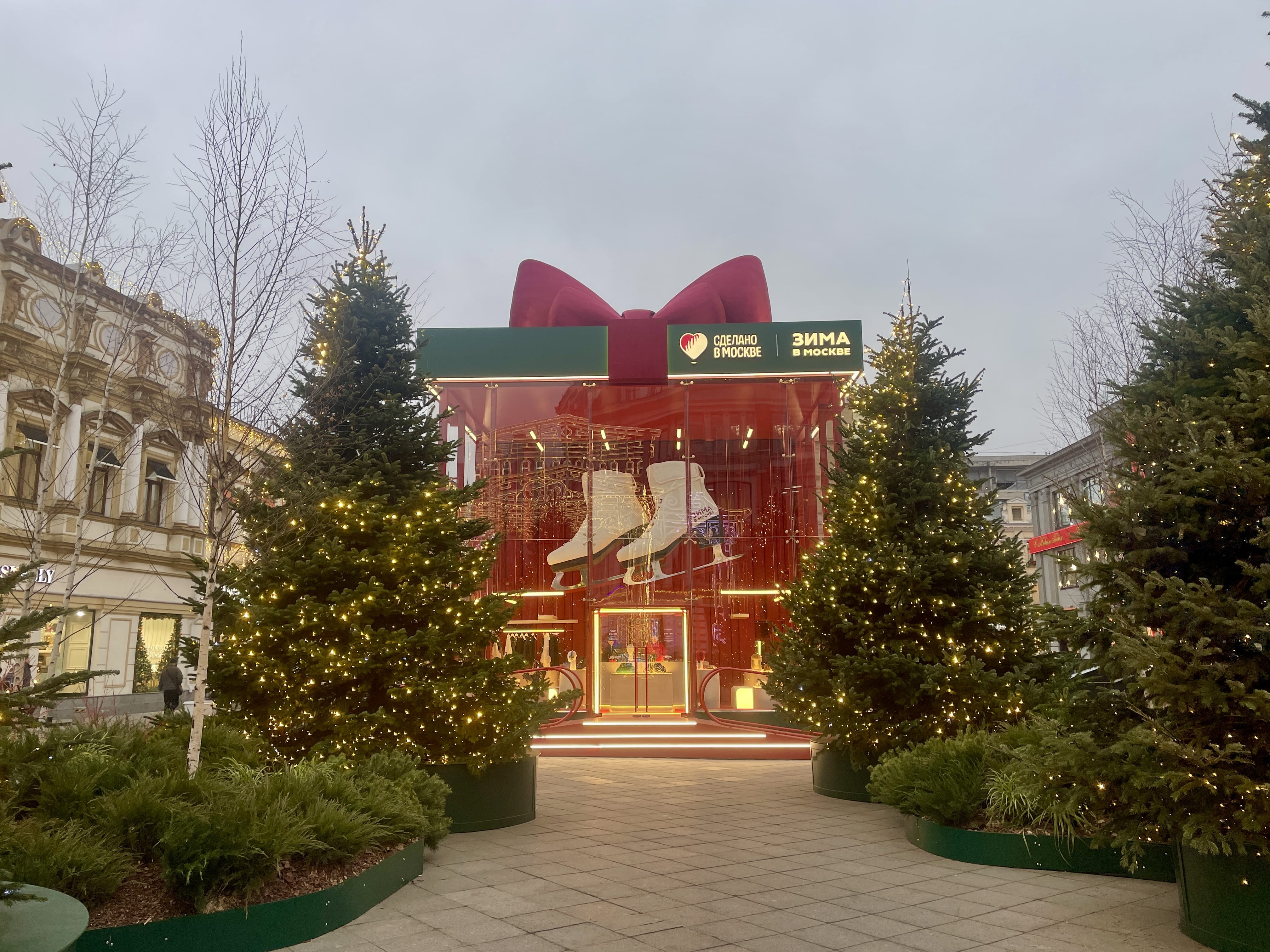 На Кузнецком мосту, напротив ЦУМа, разместились «Коньки» — большая прозрачная праздничная коробка, внутри которой находится магазин дизайнерской одежды и украшений.