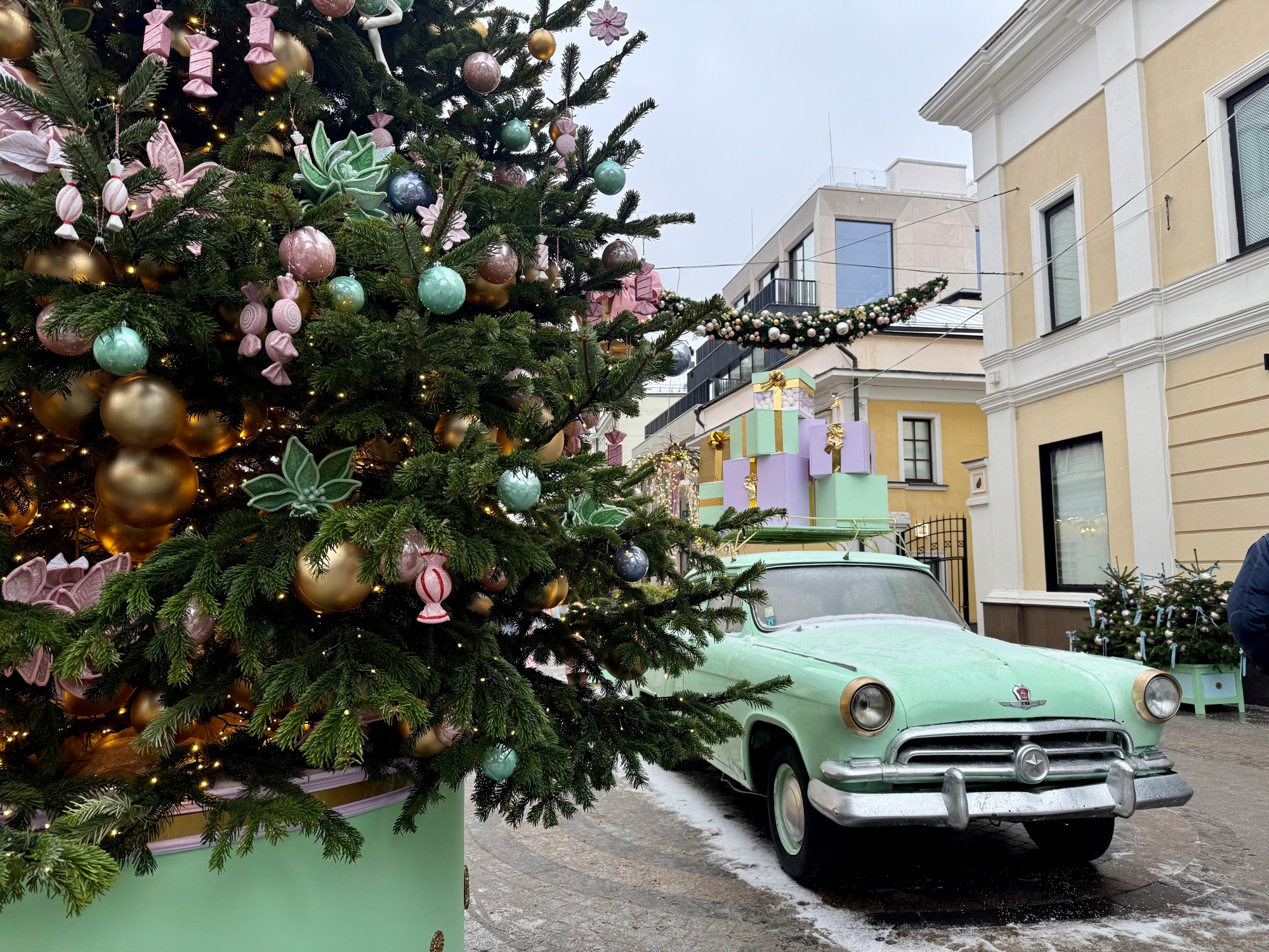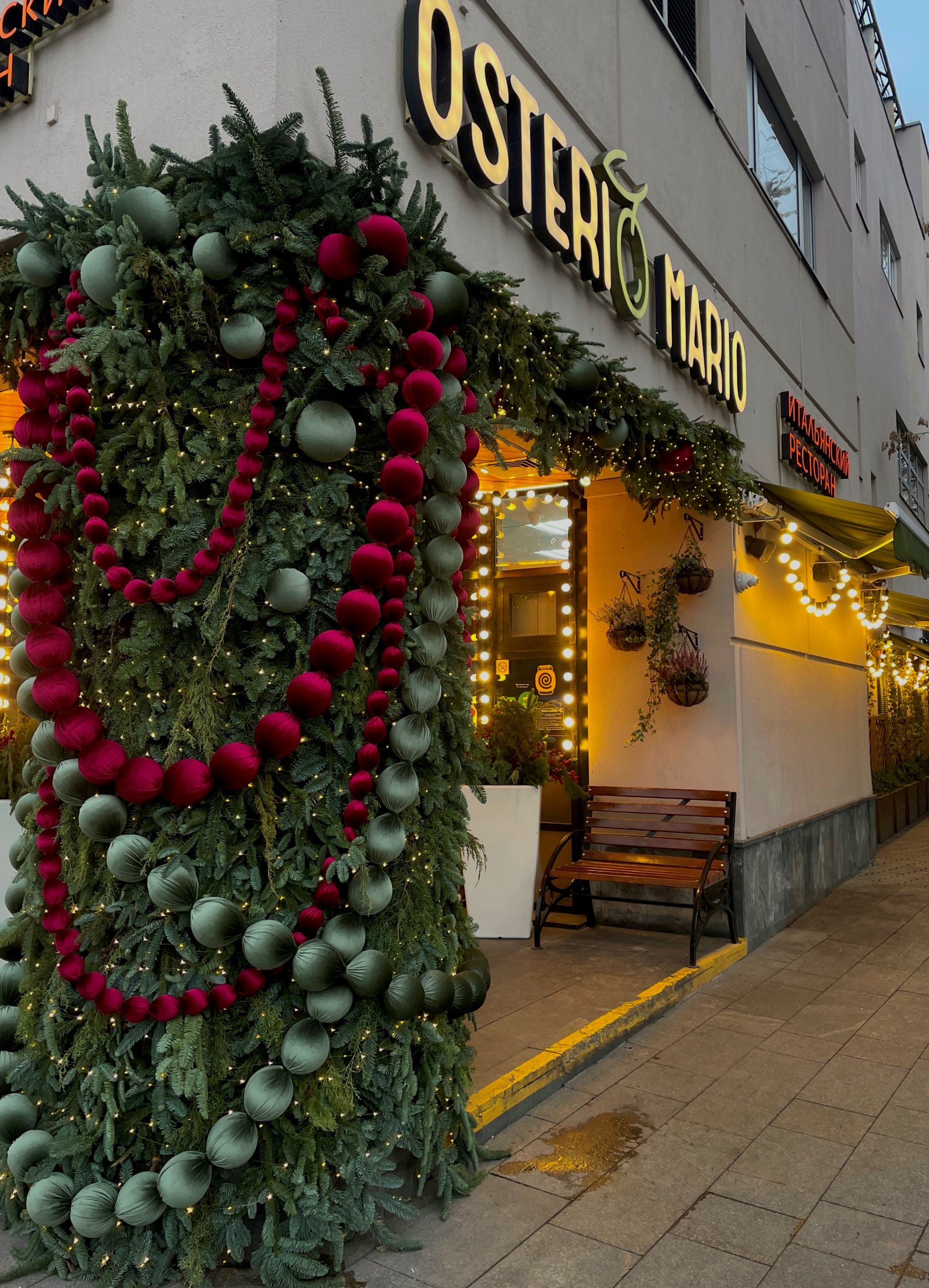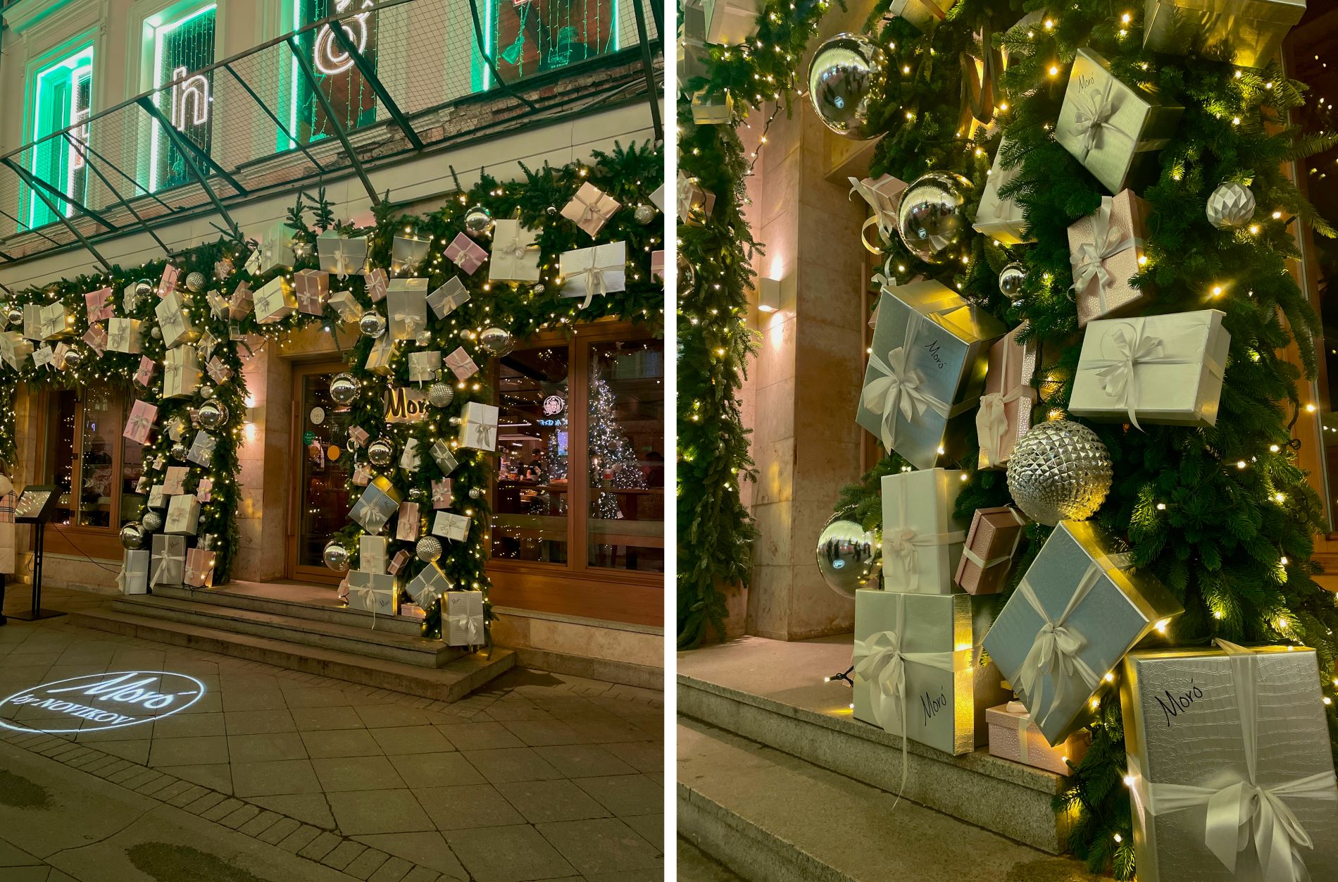 А ресторан Moró (Большая Дмитровка, 5/6с3) снаружи декорировали в пастельном стиле — объёмным хвойным венком, сверху на котором размещены подарочные коробки с фирменным леттерингом, диско-шары и светящиеся гирлянды.