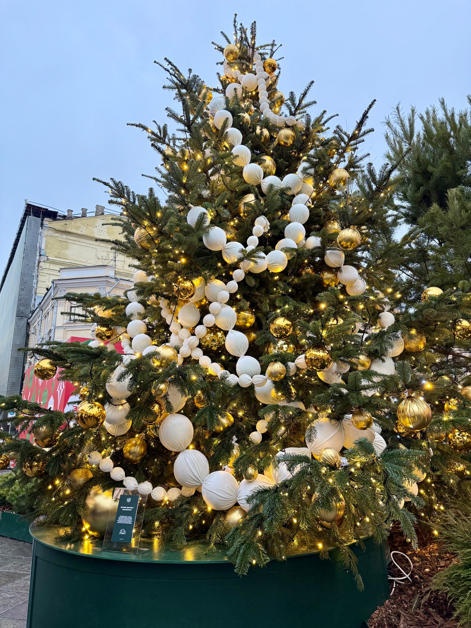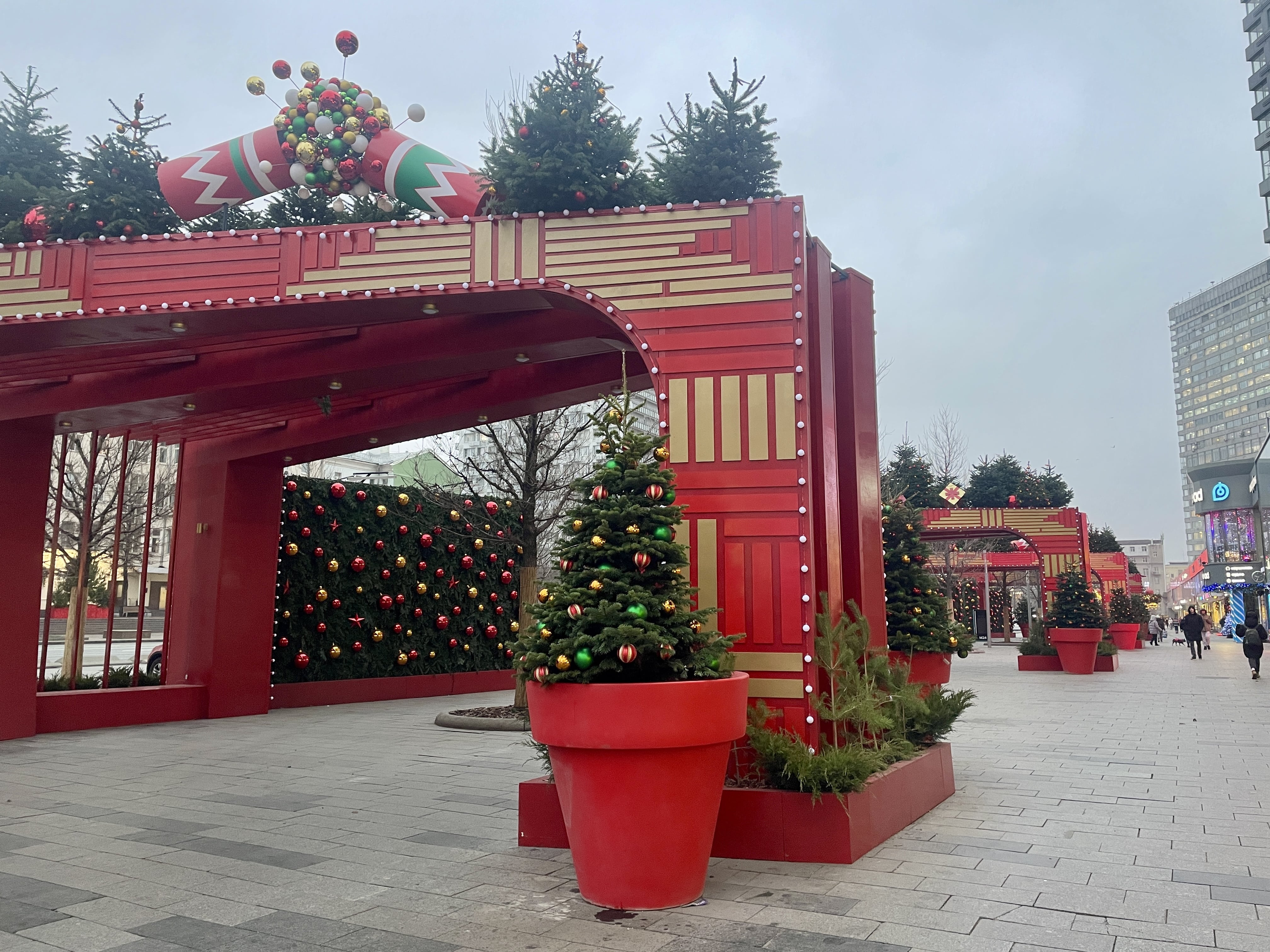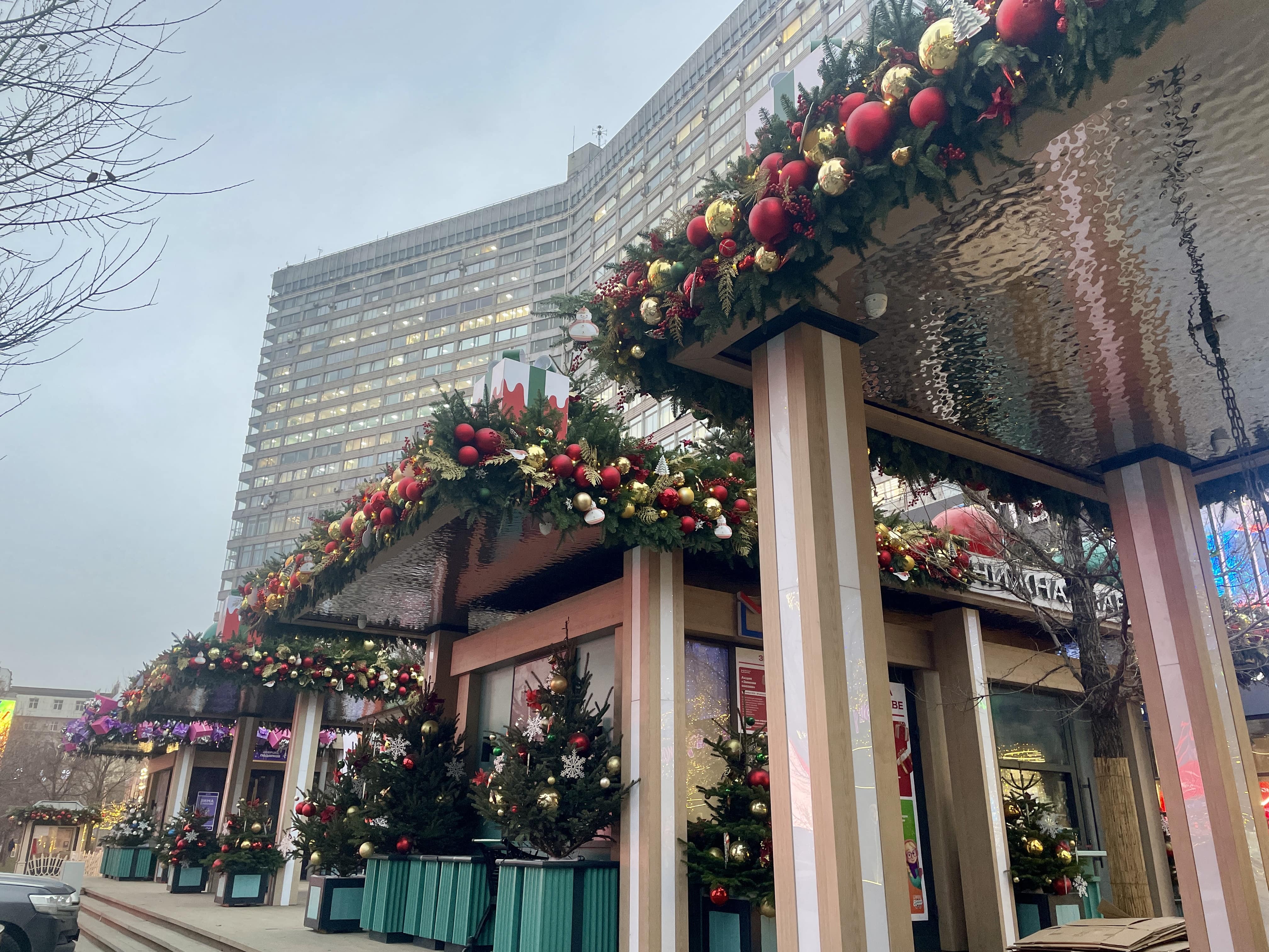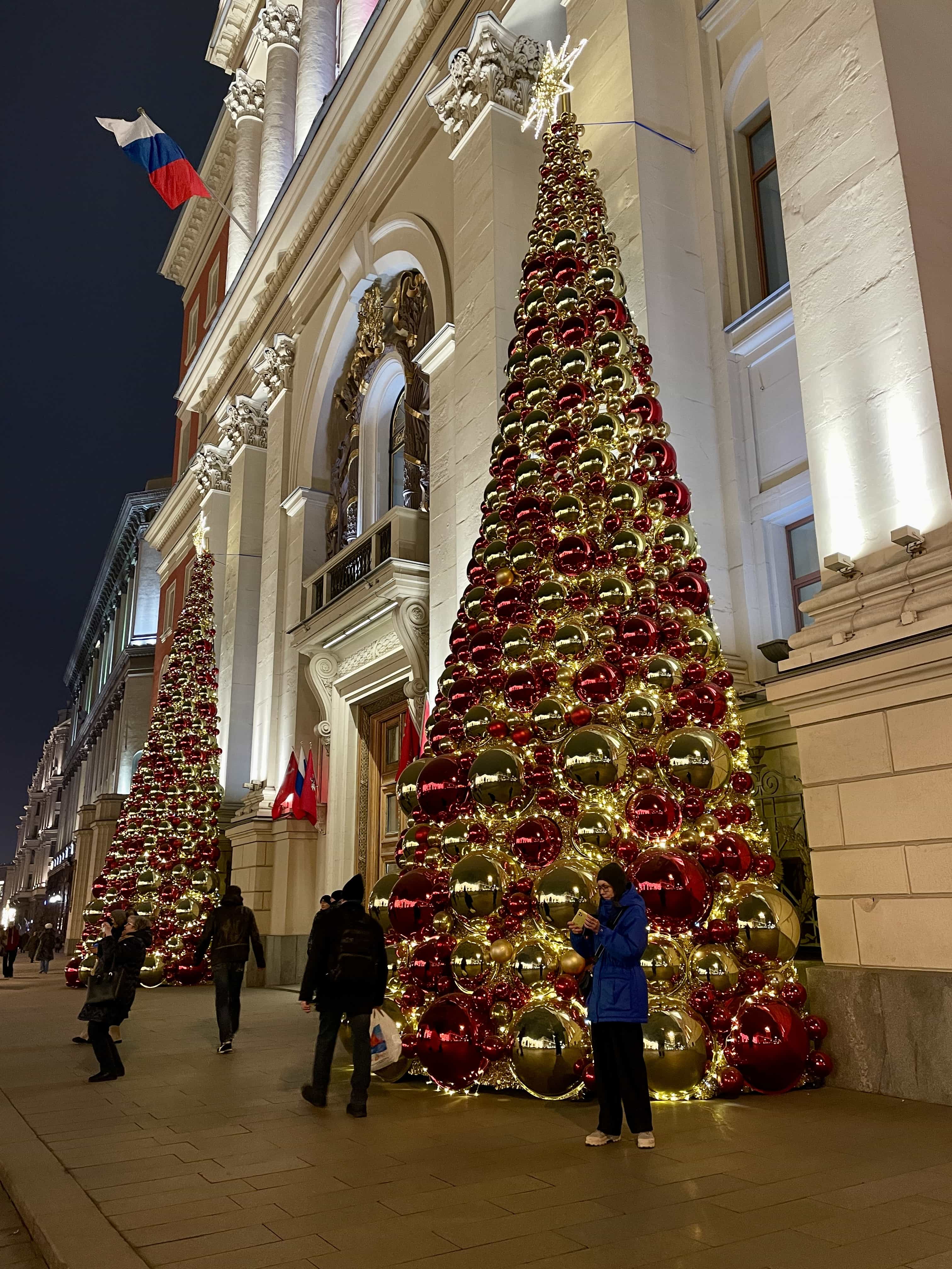 Соседние здания тоже преобразились к Новому году. Так, возле входа в Правительство Москвы можно сфотографироваться с двумя нарядными ёлками из красных и золотистых шаров.