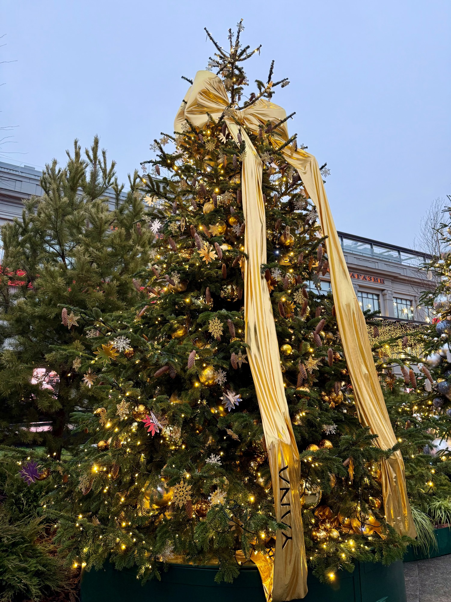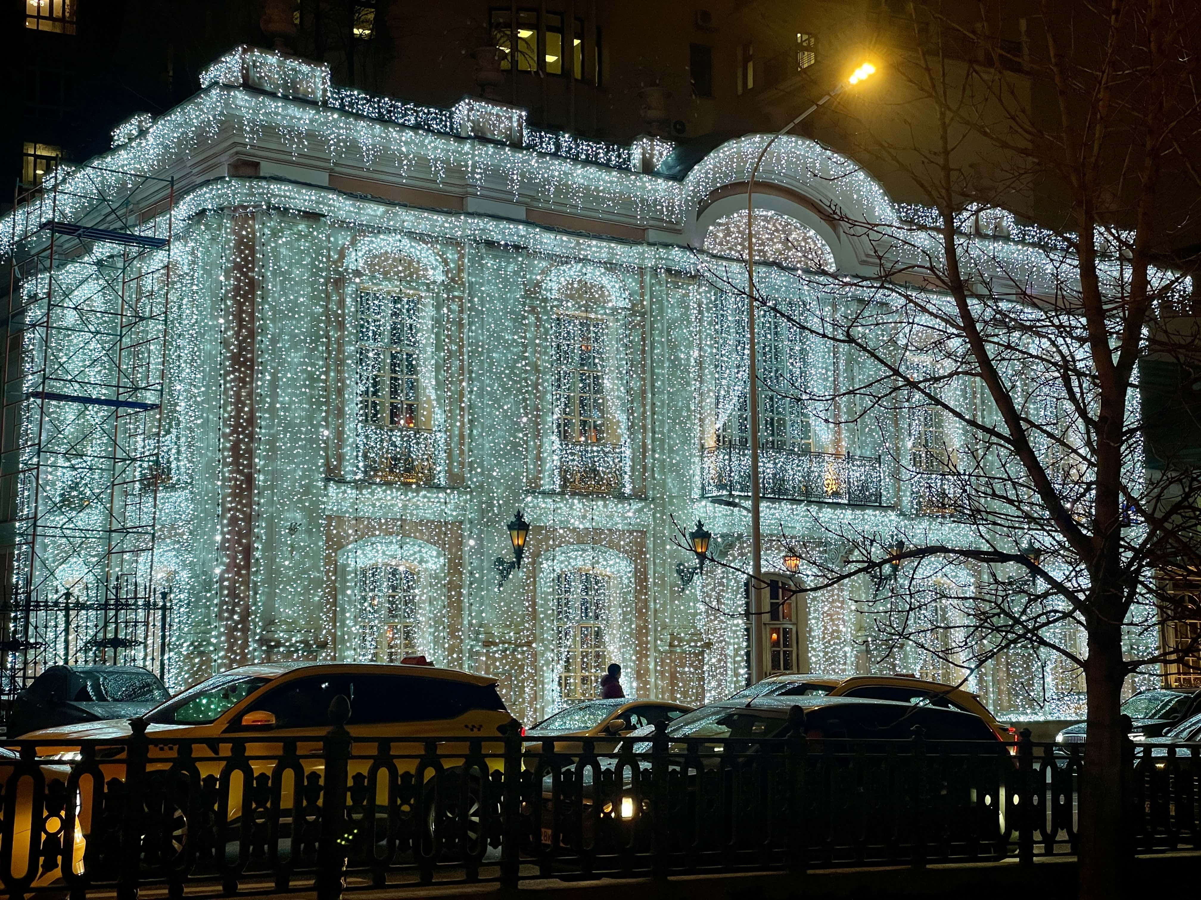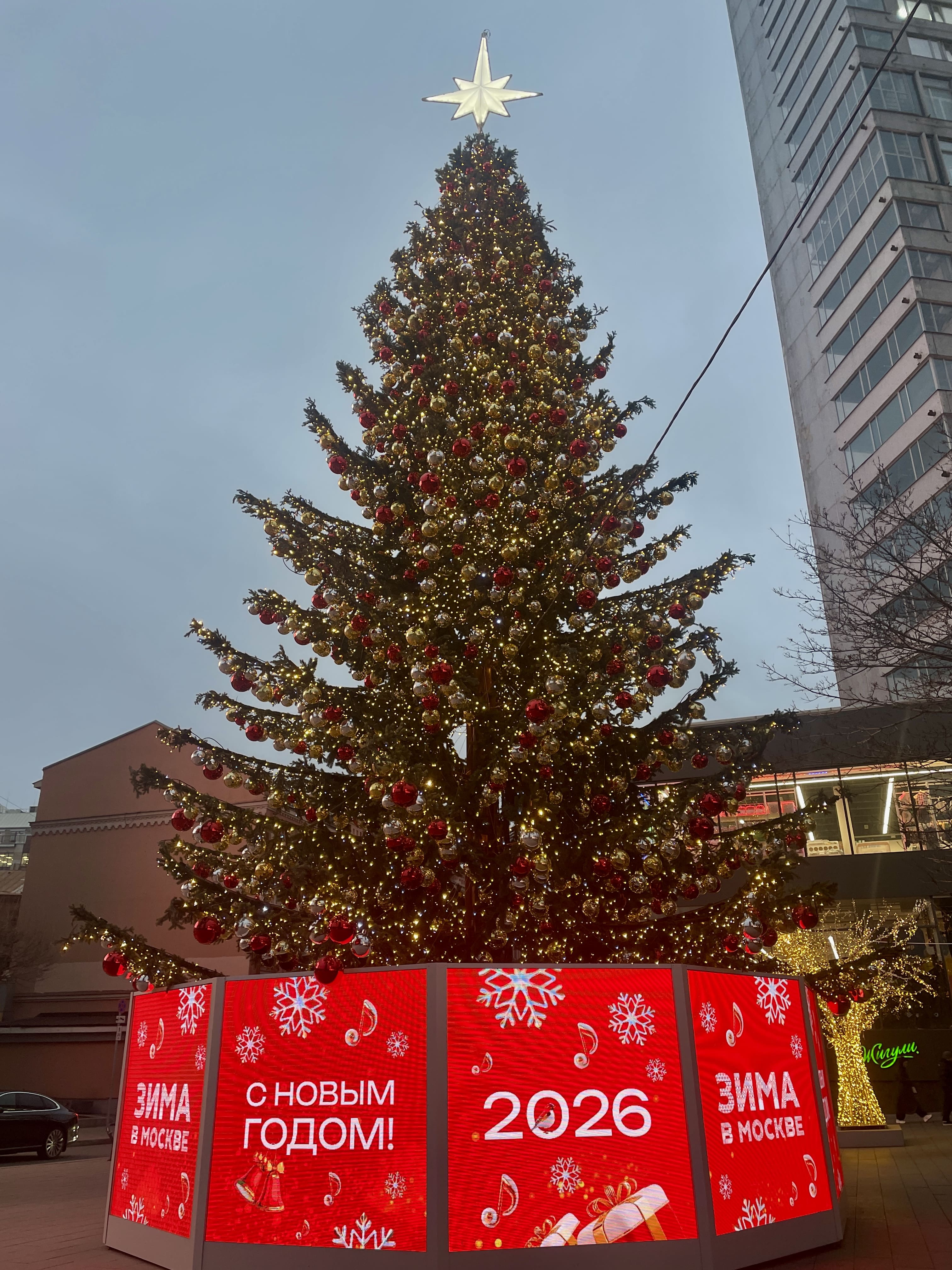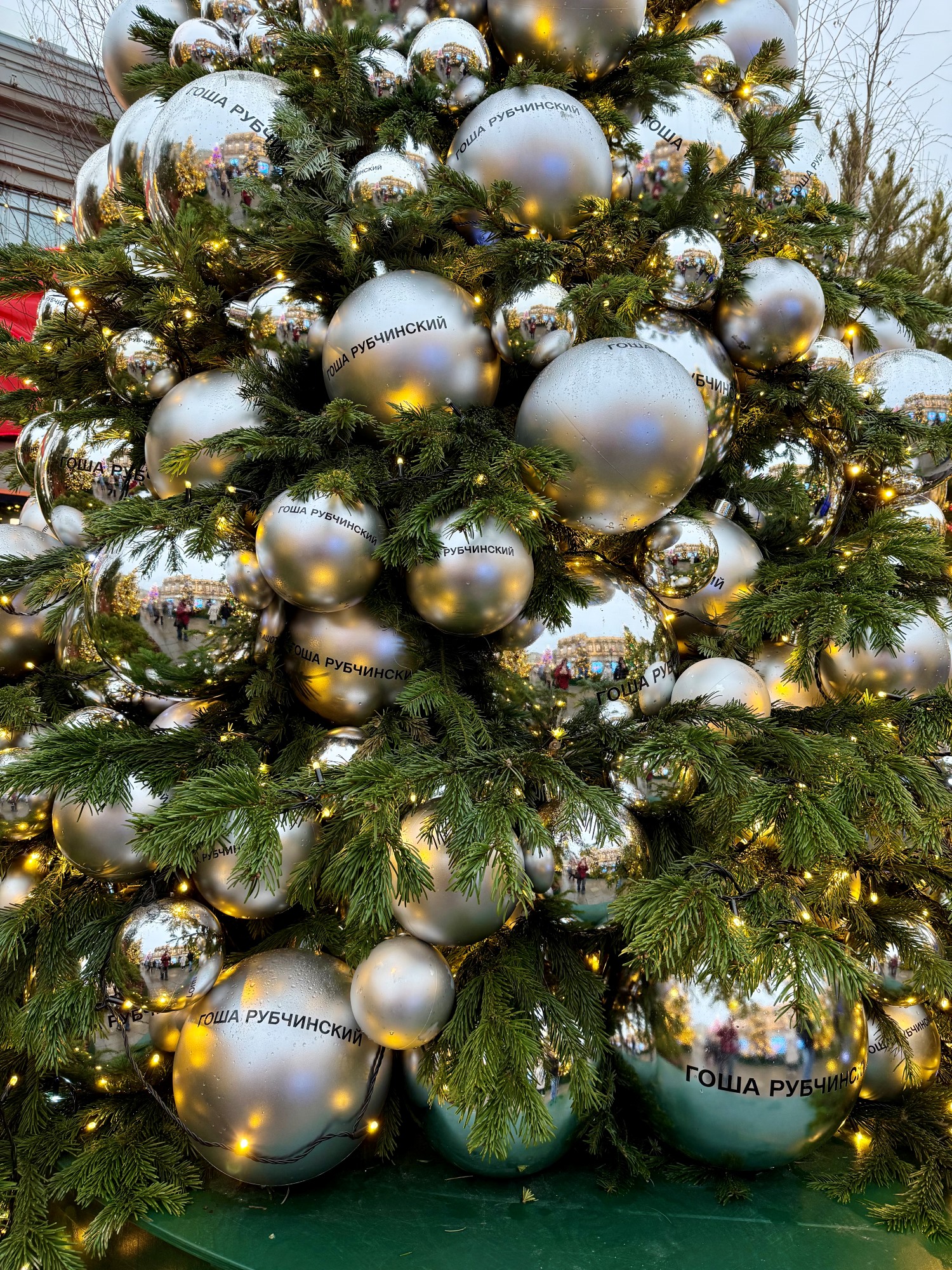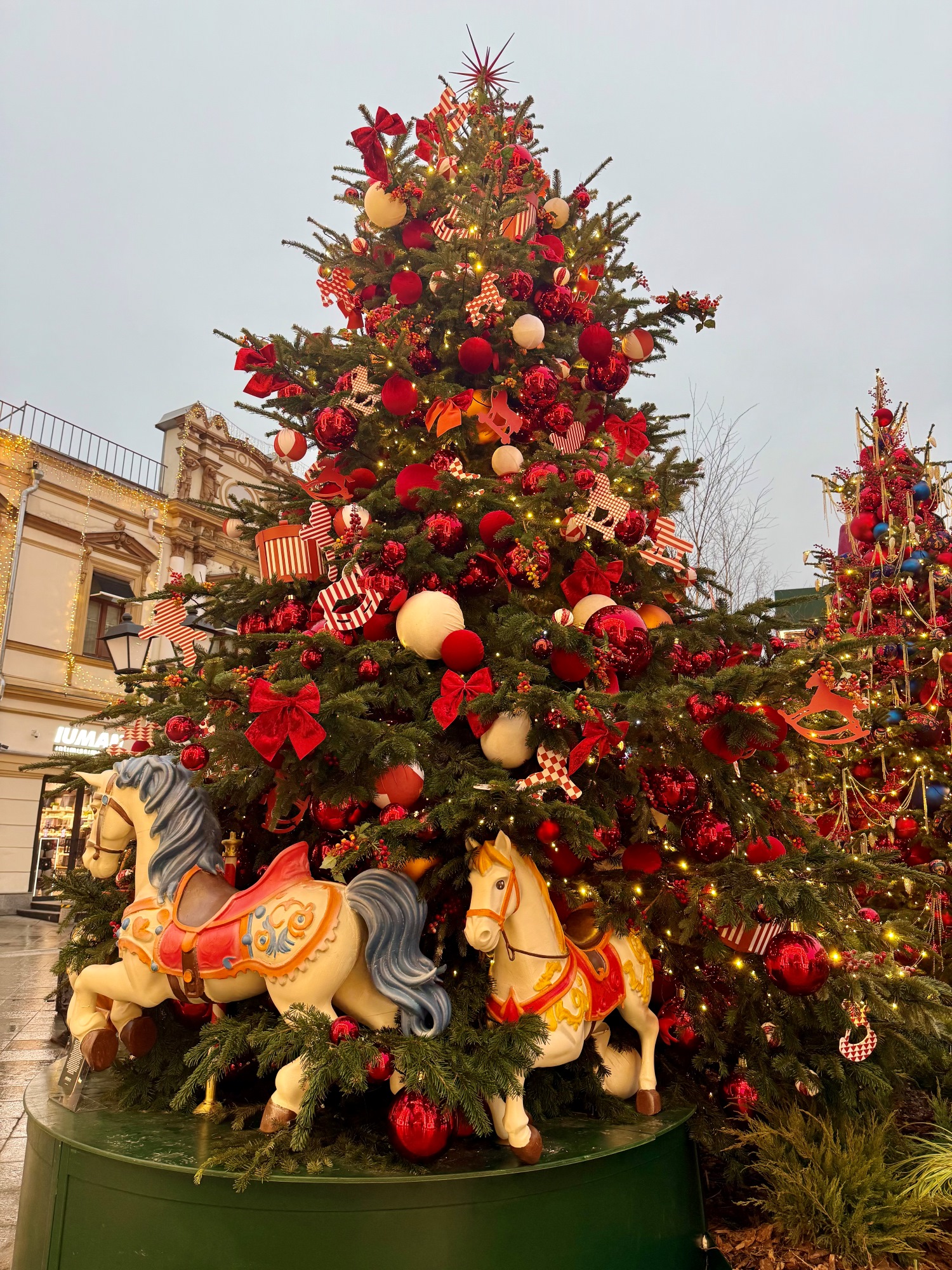 Соседние здания тоже преобразились к Новому году. Так, возле входа в Правительство Москвы можно сфотографироваться с двумя нарядными ёлками из красных и золотистых шаров.