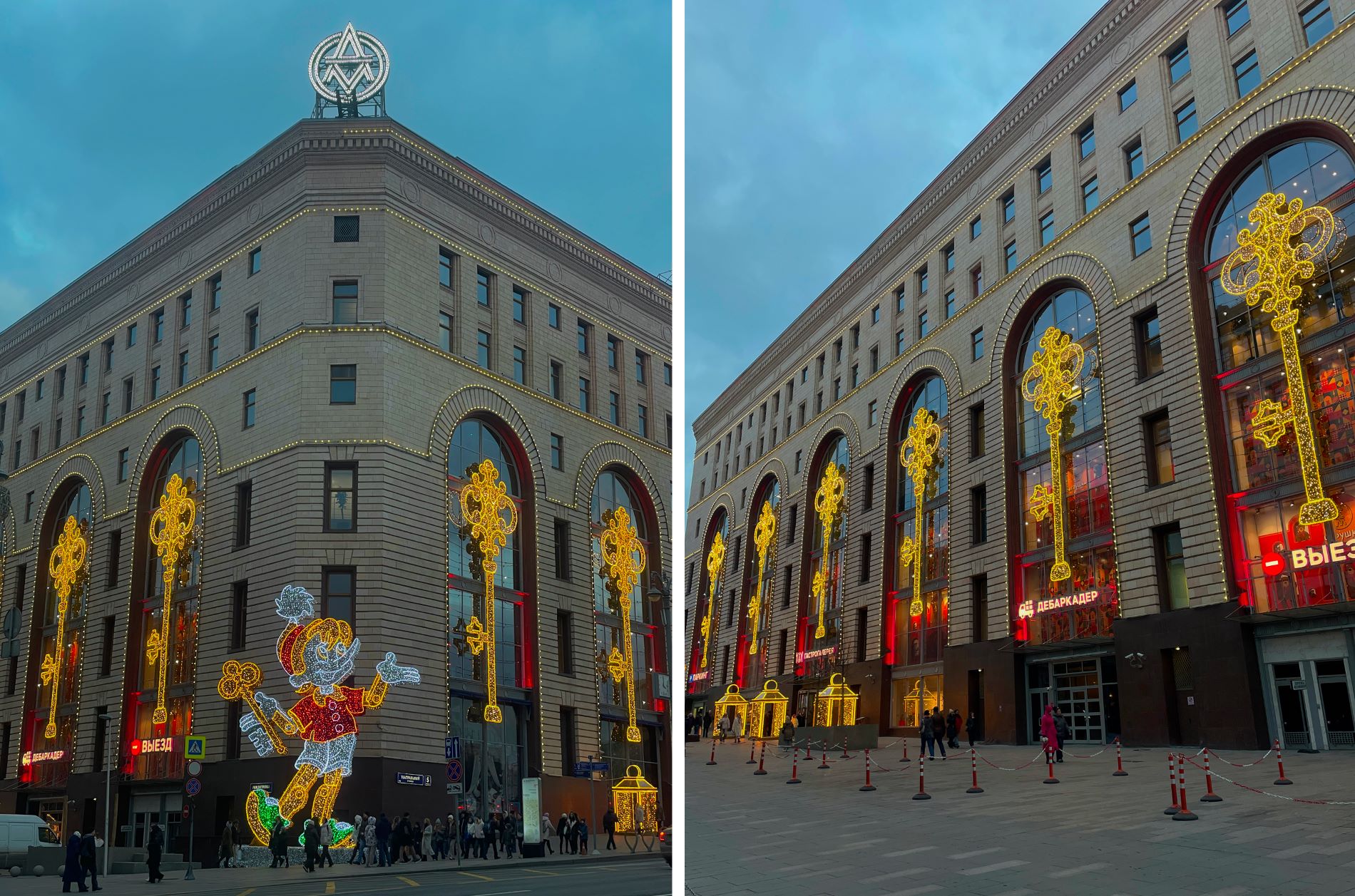 Фасад магазина на Лубянке оформили в стиле «Приключений Буратино». Светящуюся статую главного героя сказки Алексея Толстого установили возле входа, а на окнах разместили огромные золотые ключи.