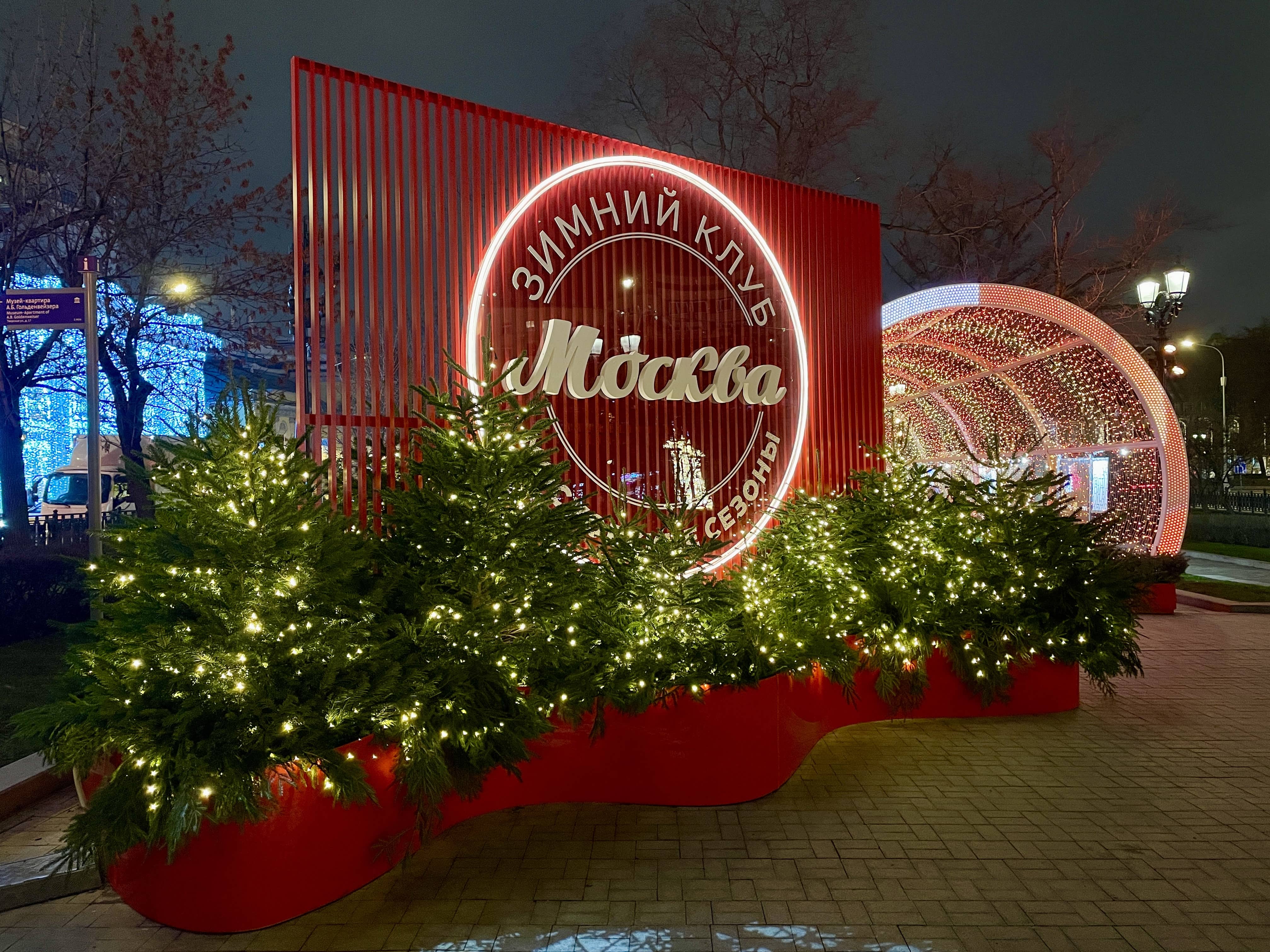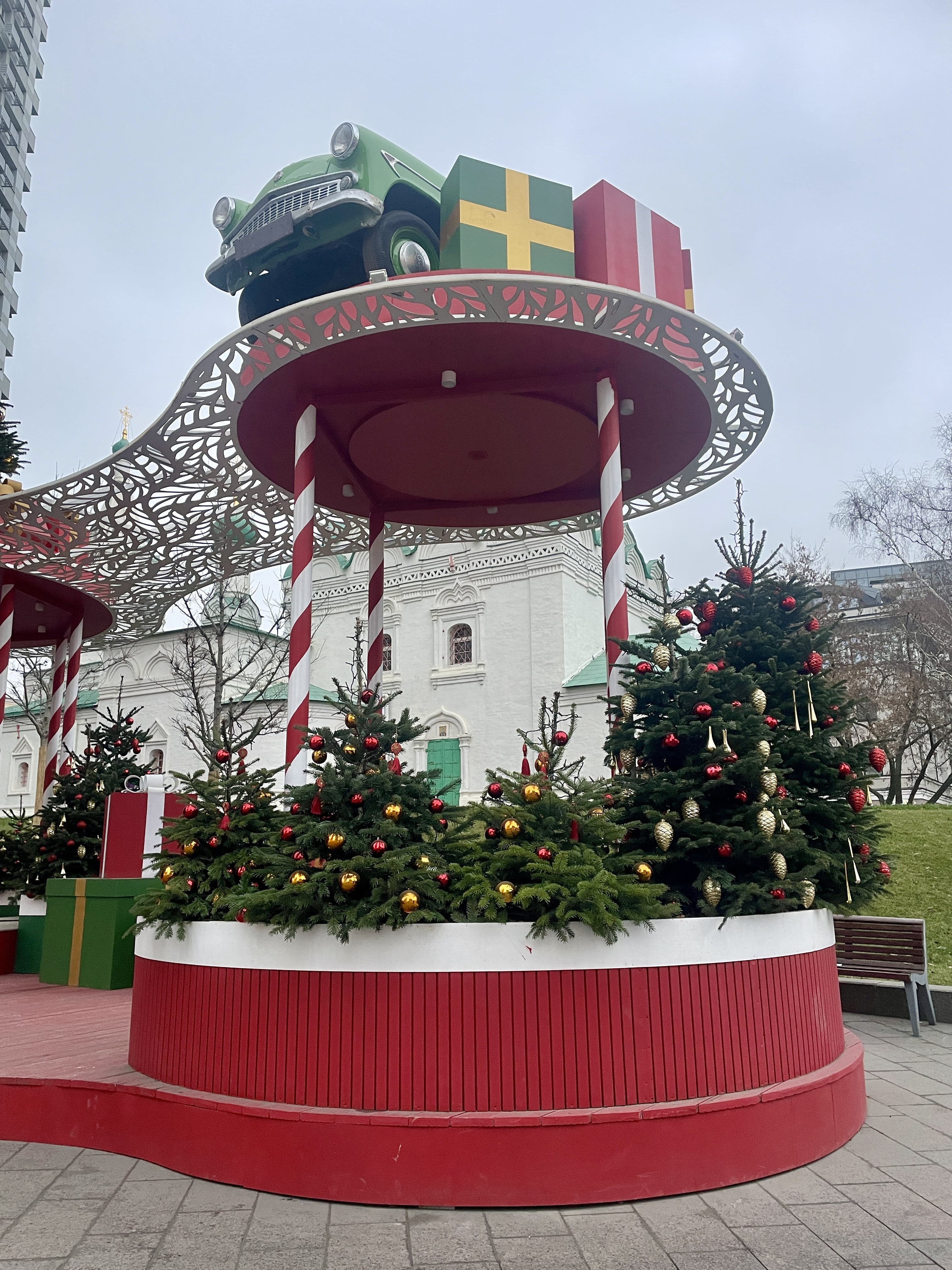 Все уличные павильоны тоже преобразили к Новому году — развесили гирлянды. Красивую фотозону на Новом Арбате обустроили в виде площадки с навесом, на котором установили миниатюрный «Москвич» и подарочные коробки.