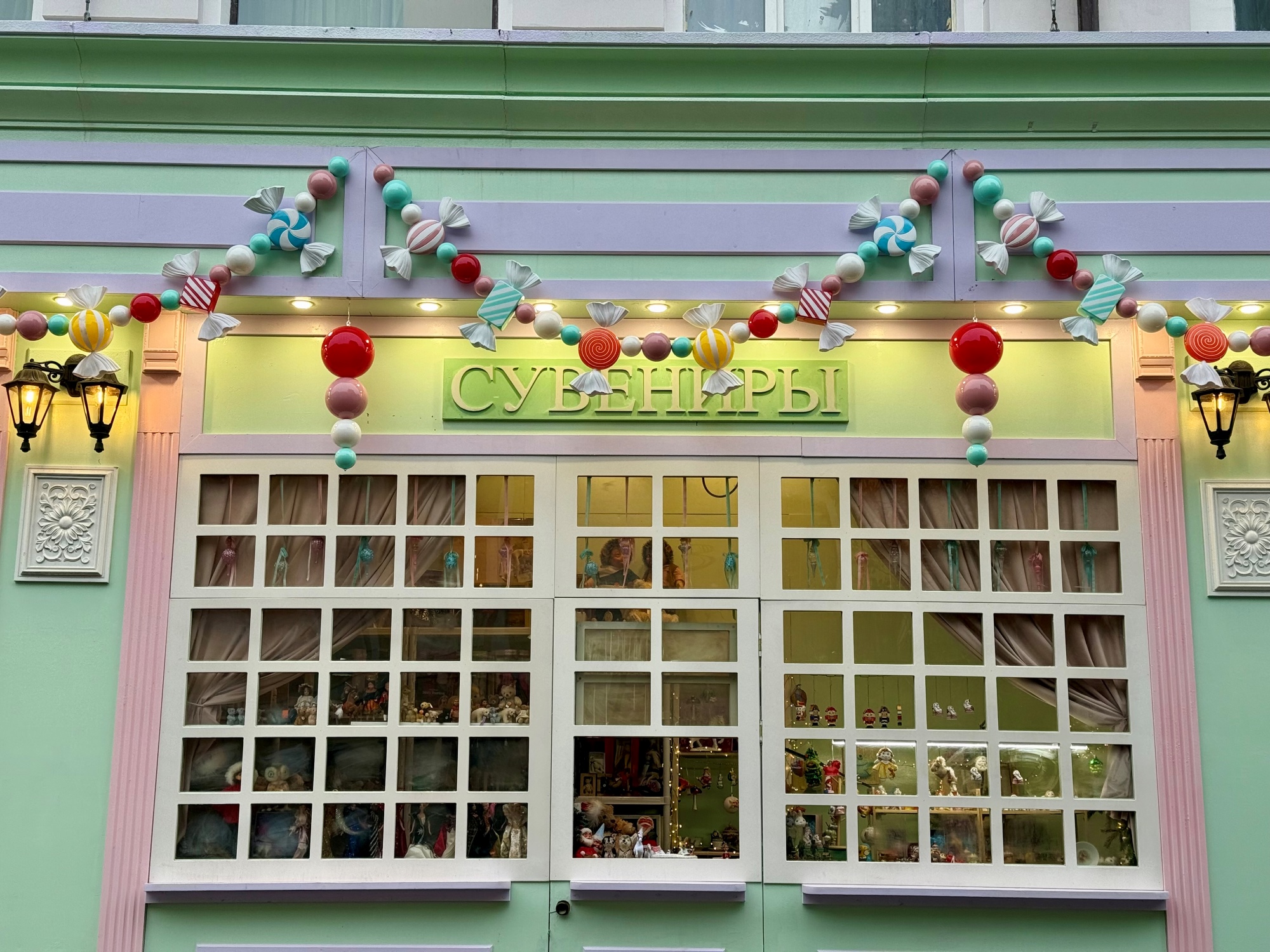 Тему сладостей продолжили и в Столешниковом переулке. Большую арку, ёлки и соседние сувенирные магазины украсили зефиром и конфетами. Идеальная фотозона для ценителей пастельных оттенков!