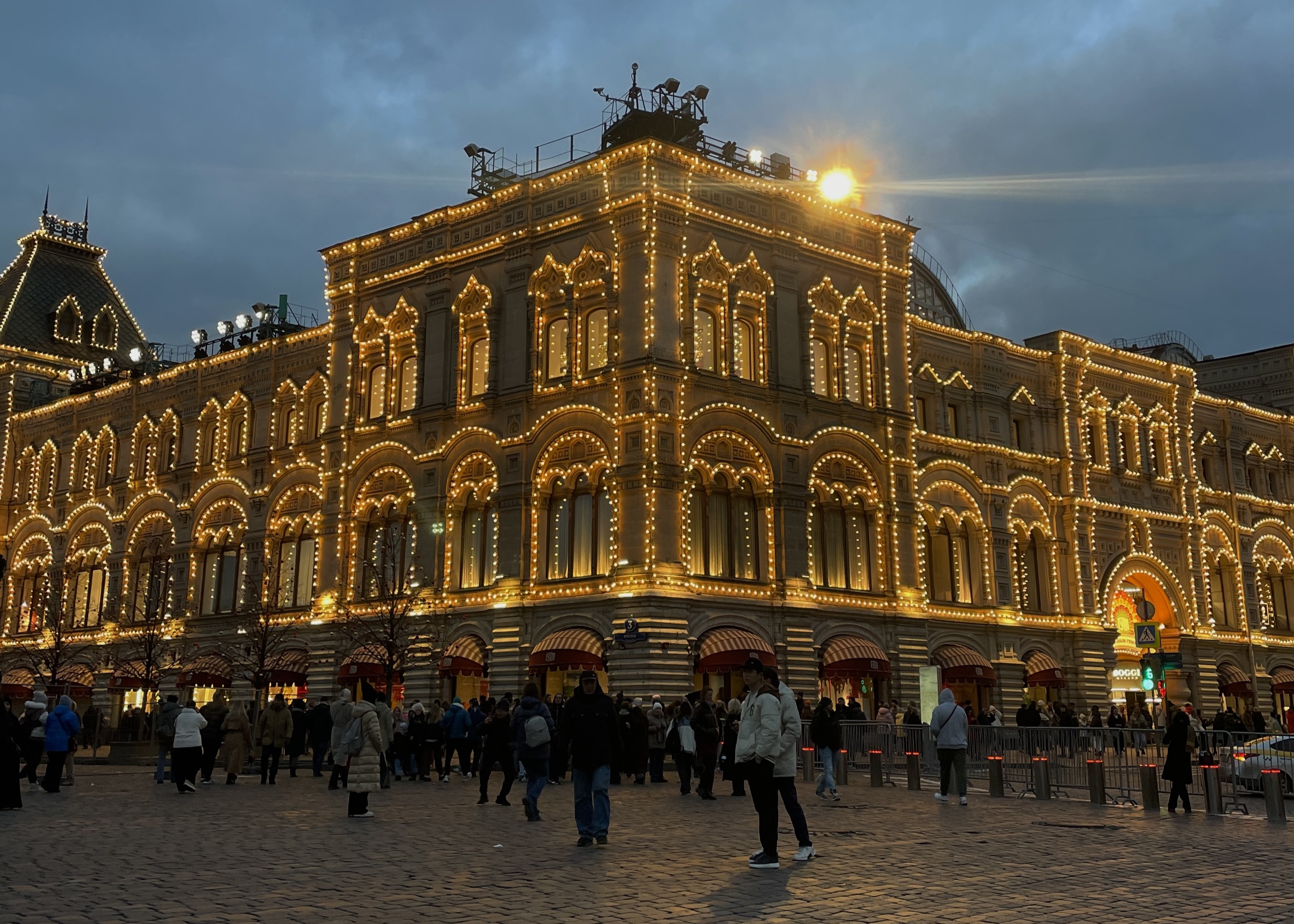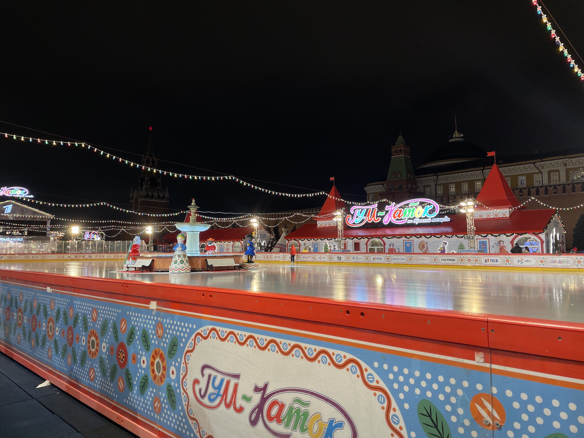 Снаружи фасад подсветили гирляндами, а на площади перед ГУМом 1 декабря открылись каток и ярмарка. Там же стоит украшенная ёлка.