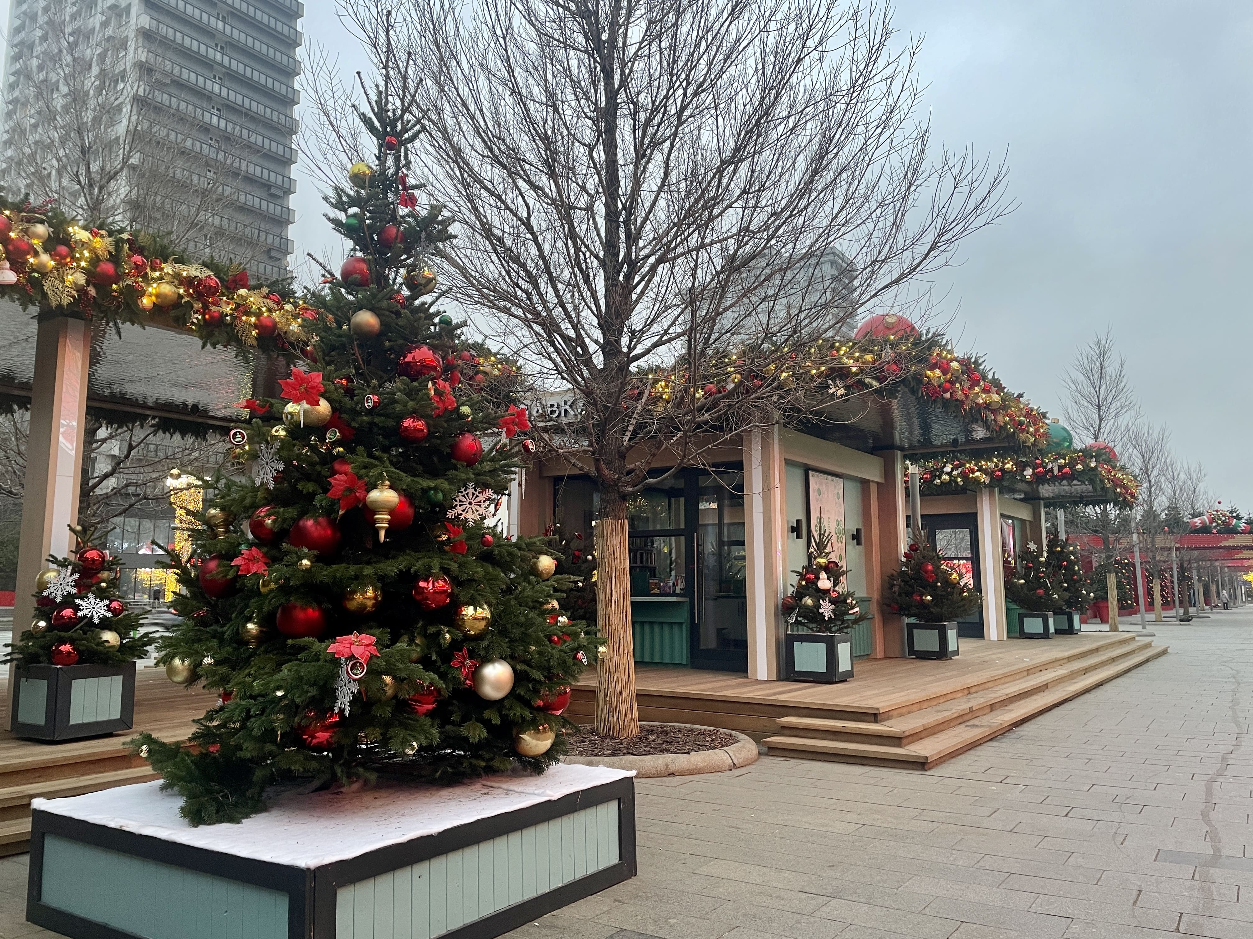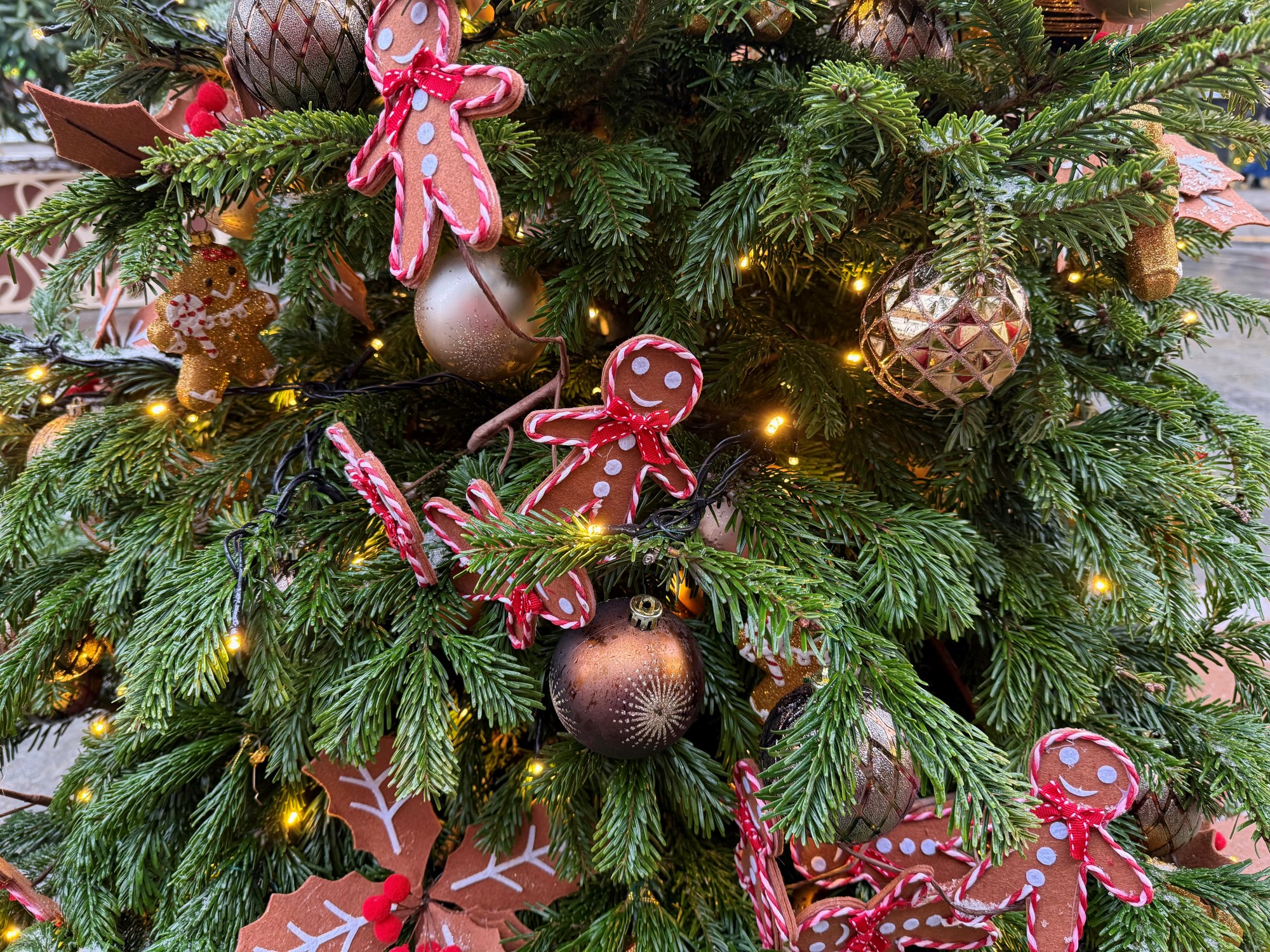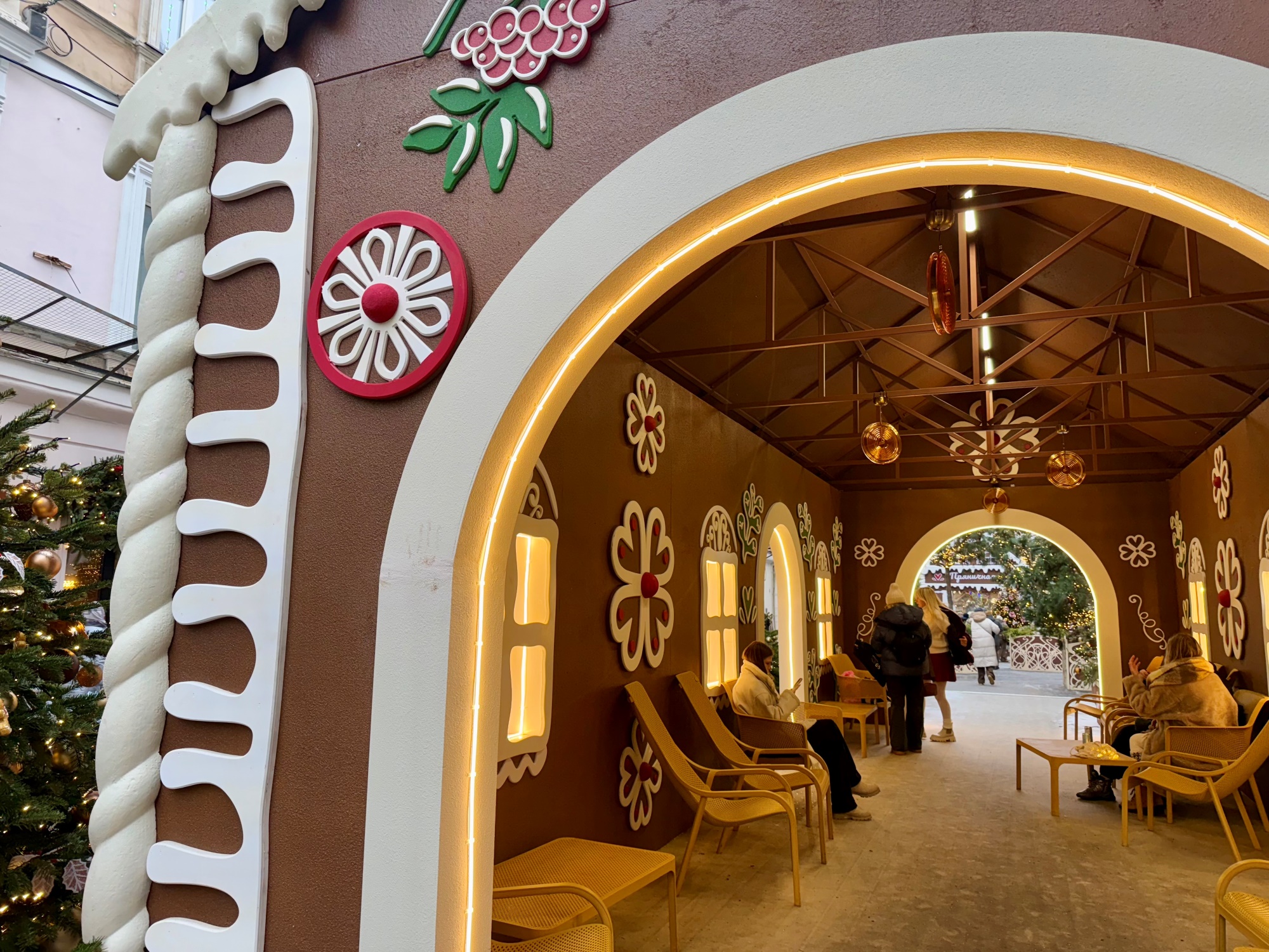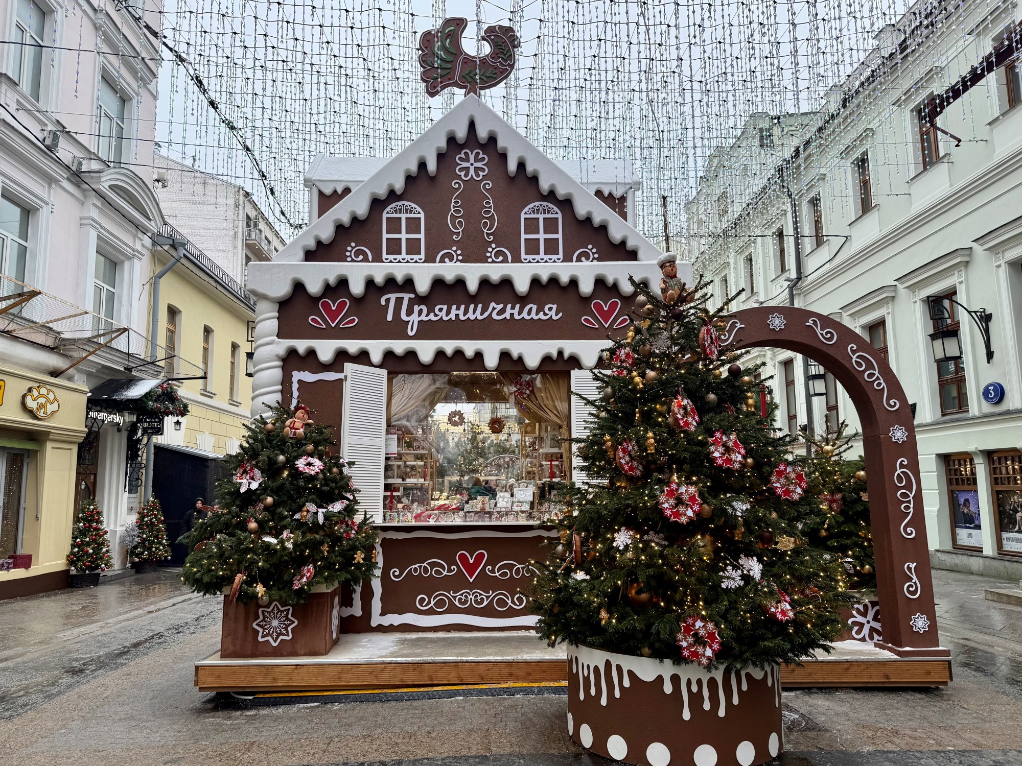 Или Переулок Пряничных домиков, как его называют в эти праздники. По центру расположился большой дом из сладкого теста (увы, несъедобный), в который можно зайти и сфотографироваться. А по соседству — лавка, в которой можно купить настоящие пряники. Даже ёлки здесь украсили имбирными человечками (но игрушечными).
