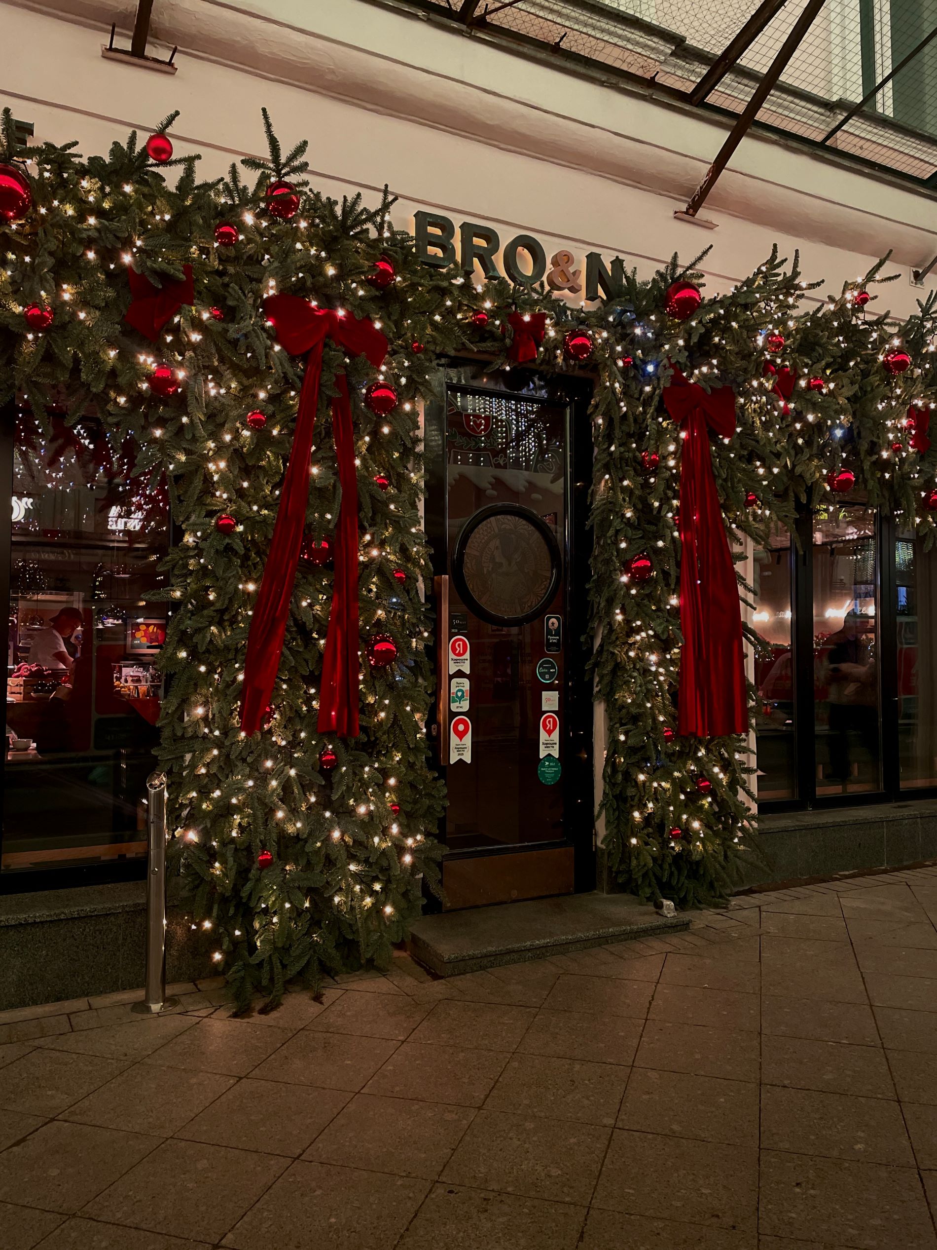 На одной из центральных улиц к Новому году преобразились рестораны. Фасад пиццерии Bro&N (Большая Дмитровка, 5/6с3) обильно украсили ветками хвои, светящимися гирляндами, красными шарами и большими бантами.