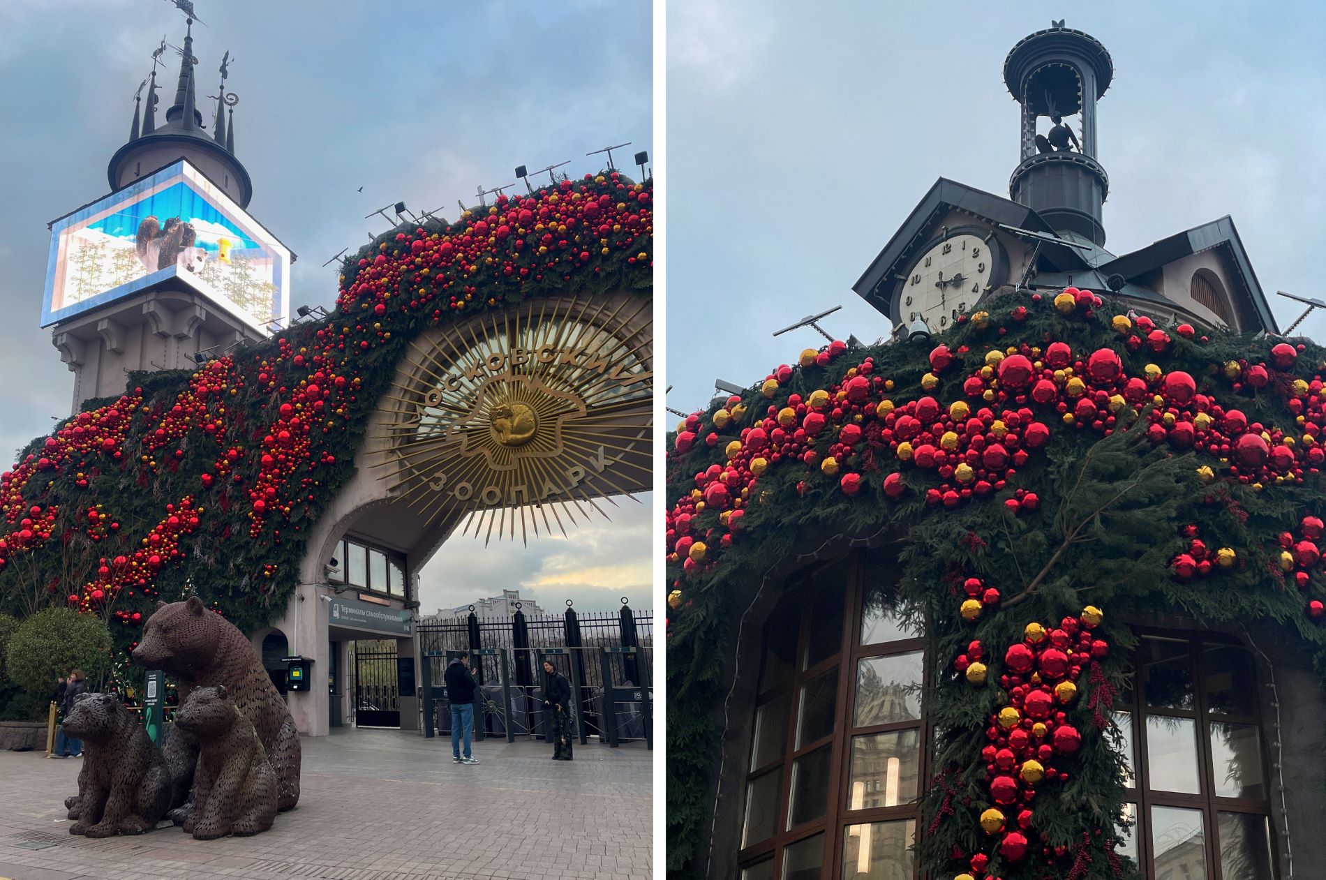 Главный вход в зоопарк превартили в пышный хвойный покров с красными и золотистыми шариками.