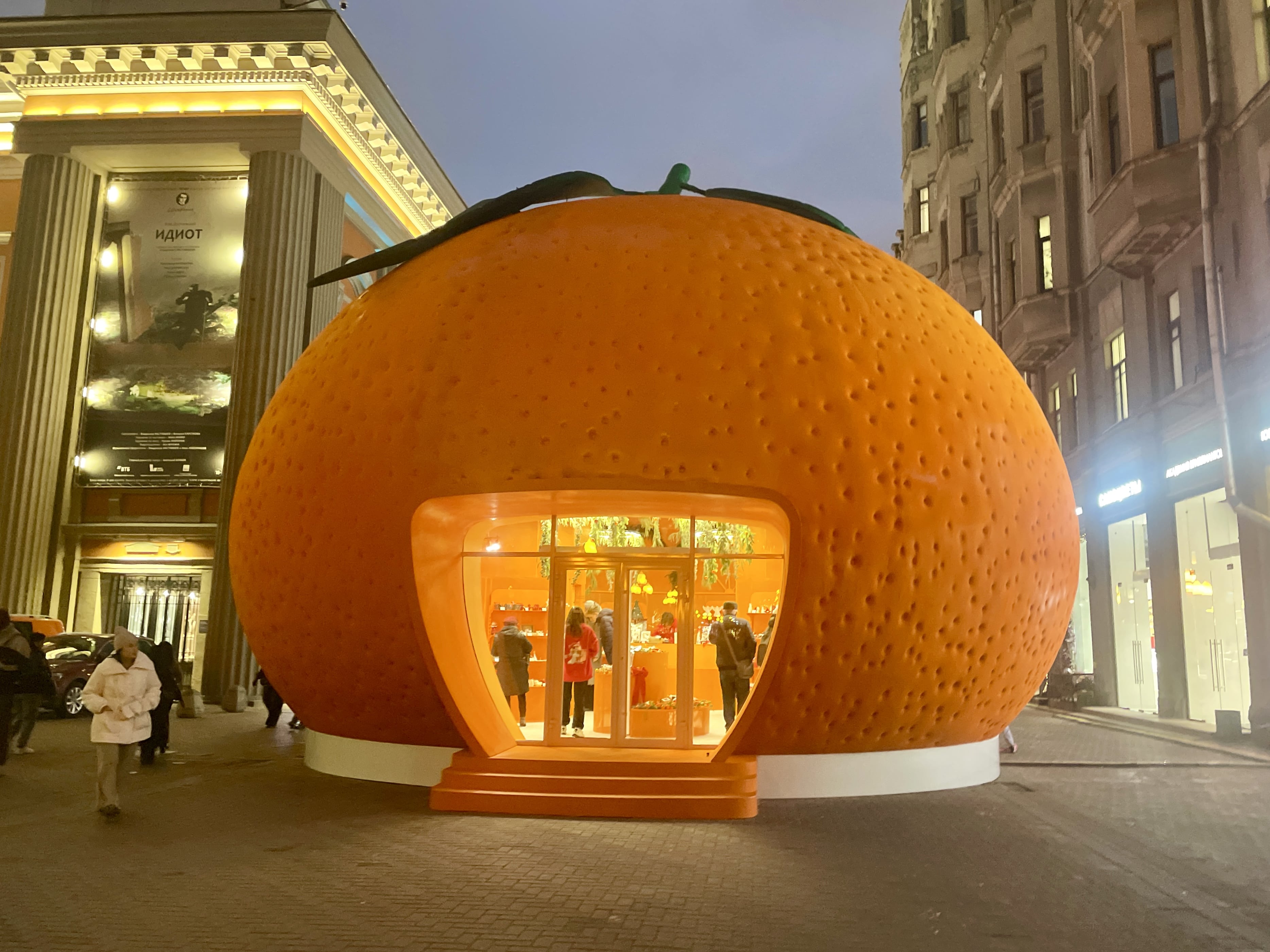 Ярко-оранжевый «Мандарин» установили на старом Арбате. В «витаминном» павильоне продают товары для дома, ёлочные игрушки и новогодние сувениры.