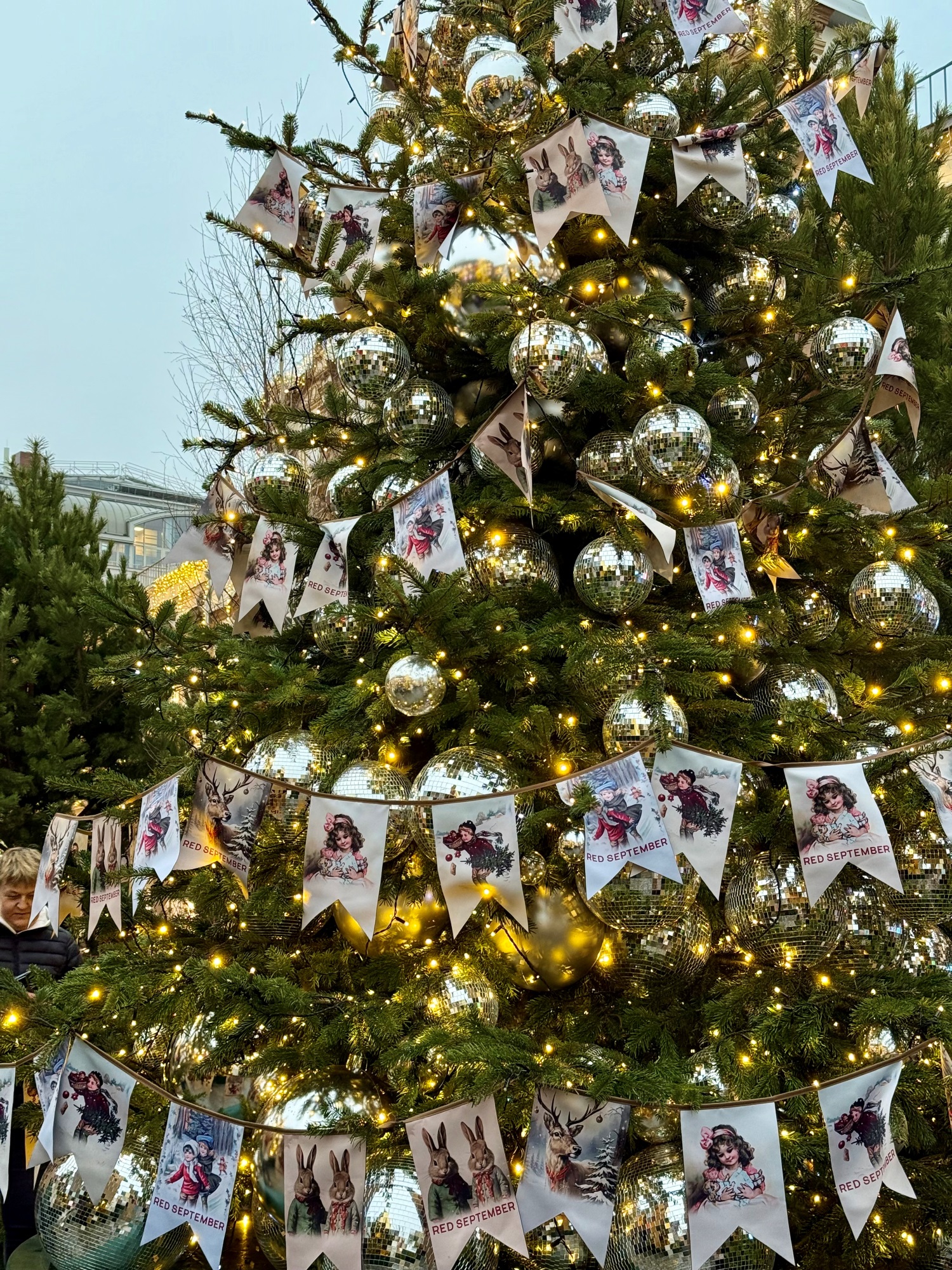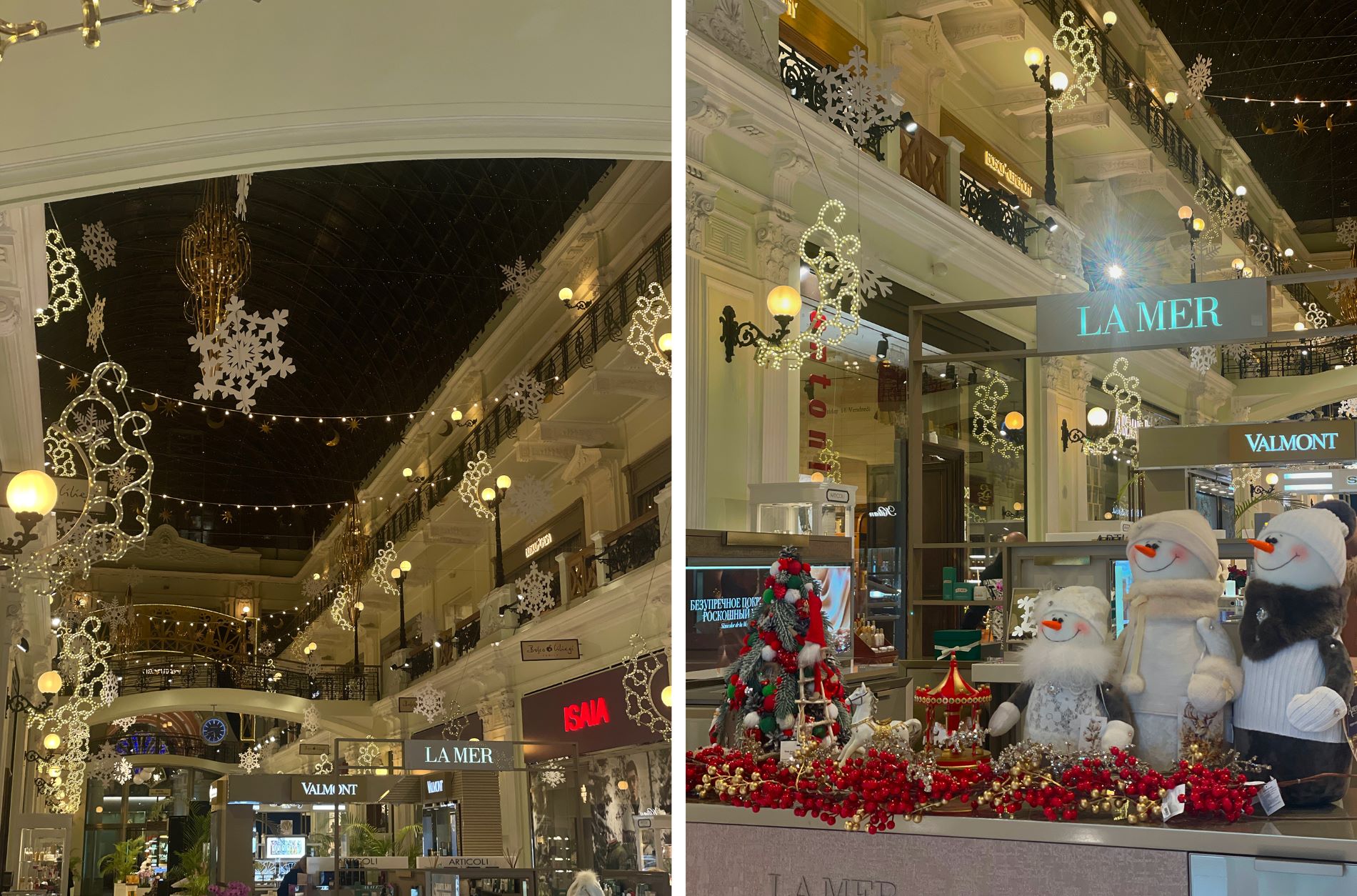Под стеклянным потолком элитного универмага развесили классические золотистые и белые гирлянды со снежинками, солнцем и луной. Сбоку на галереях появились светящиеся композиции в виде зимних узоров. Стенды магазинов галереи украсили снеговики, лошадки, искусственные ветки остролиста и настоящие пуансеттии.