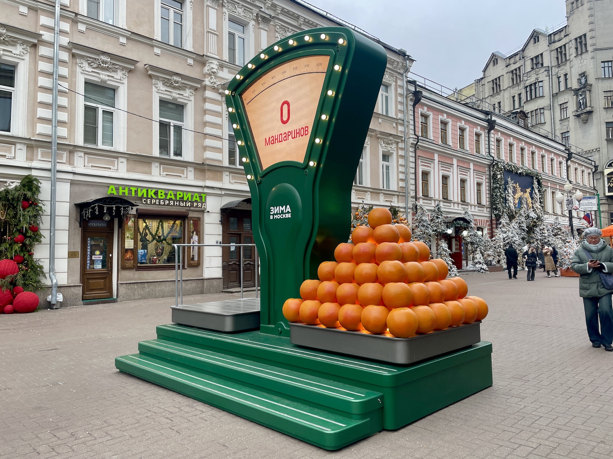 Мандариновые весы на Старом Арбате, пожалуй, одна из самых необычных фотолокаций в этом сезоне. Ведь узнавать свой вес в цитрусовых намного приятнее, чем в килограммах (особенно после съеденных салатов). К тому же, прямо на месте можно проверить: изменится ли значение, если съесть пару-тройку мандаринов?