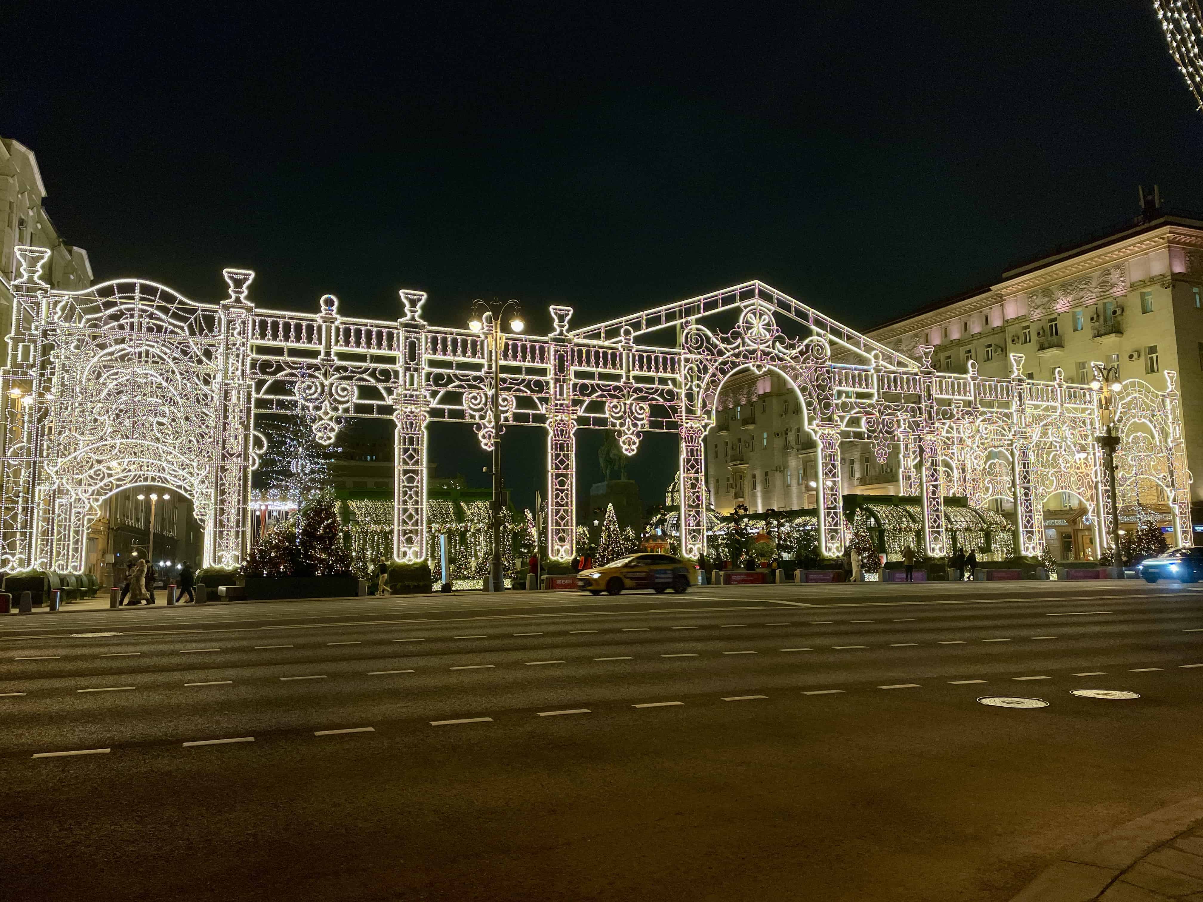 На одной из главных площадок «Зимы в Москве» появилось множество световых инсталляций, в том числе макеты московских достопримечательностей и арки с гирляндами. Там же установили украшенные ёлки, венецианскую карусель и павильоны, где можно купить еду и напитки.