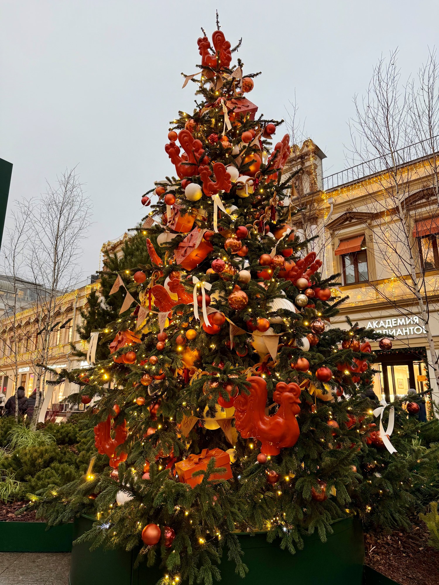 Здесь можно увидеть гирлянды из сушек и бусин жемчуга (главные тренды этого года!), гигантских петушков, игрушечных коней и даже балерину, выступающую на сцене Большого театра!