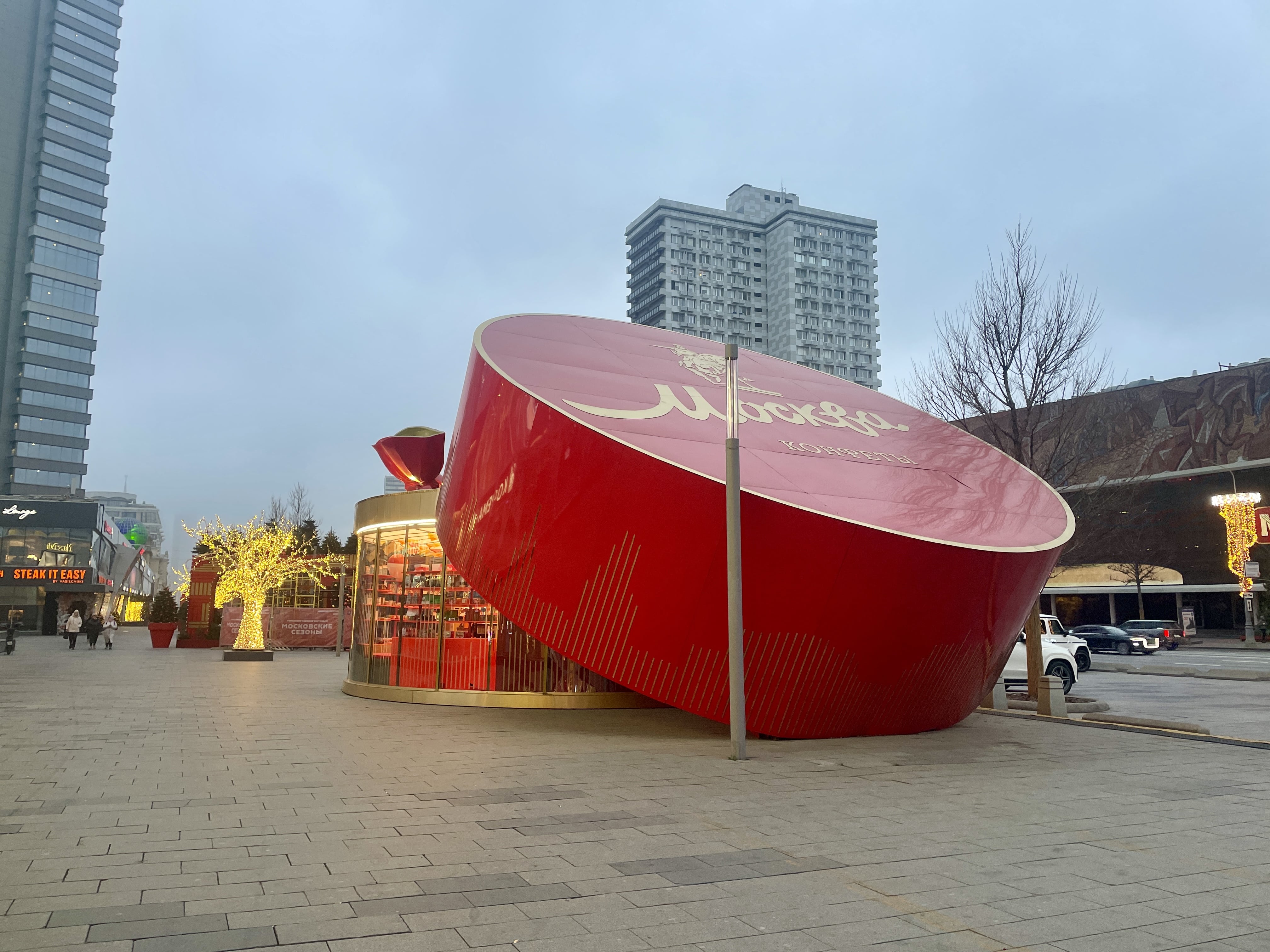 Неподалёку раудет уже знакомый москвичам золотистый «Самовар», который этой зимой приодели в шарф с орнаментом а-ля рюс. За дверью найдутся сувениры с символикой города, чай, сервизы и варенье «Московского чаепития».