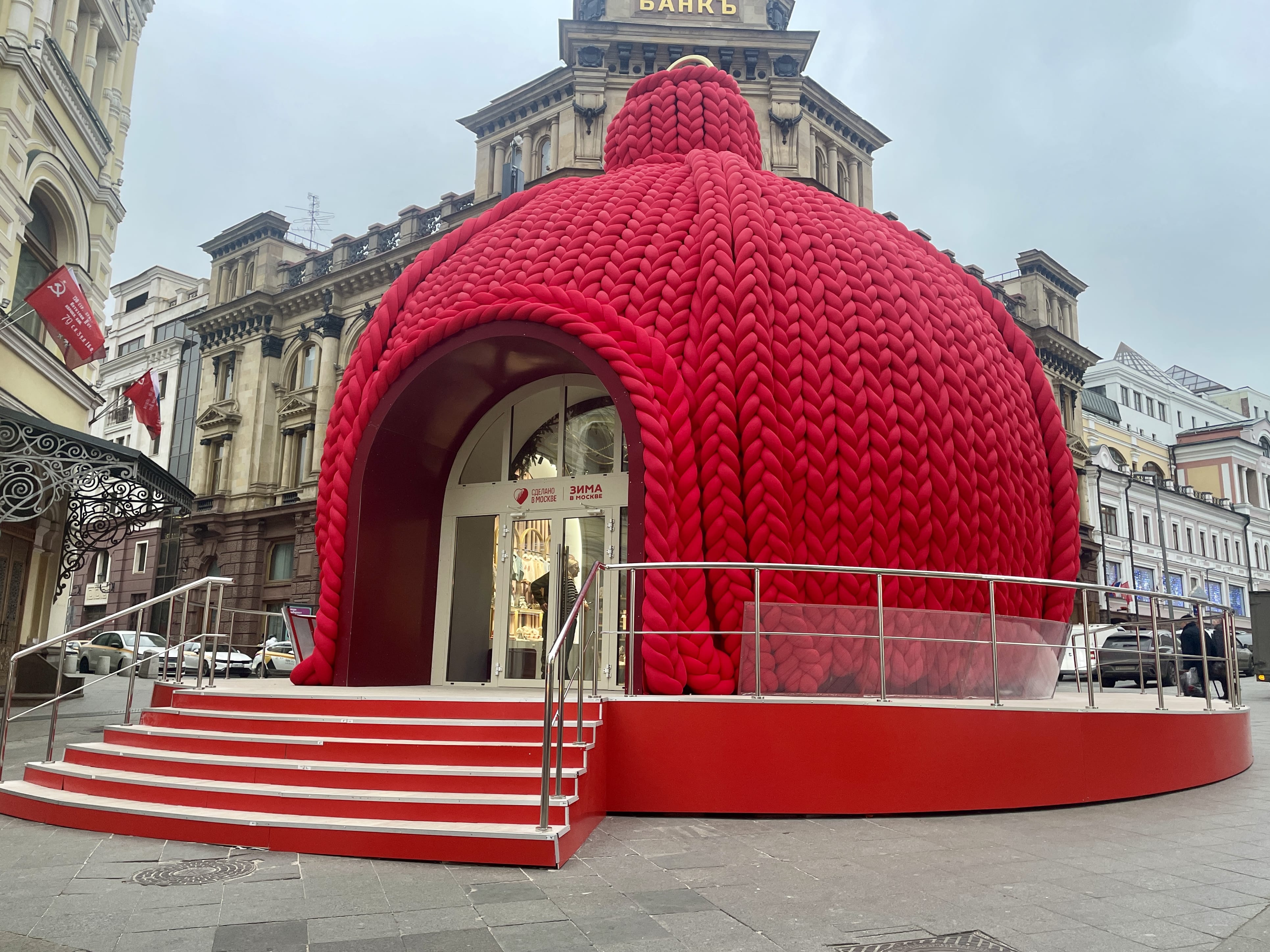 В центре столицы установили девять праздничных павильонов «Сделано в Москве». Внутри каждого можно что-нибудь купить. Так, на Рождественке появился вязаный «Красный шар», где продаются детские игрушки и одежда, книги, а также косметика.