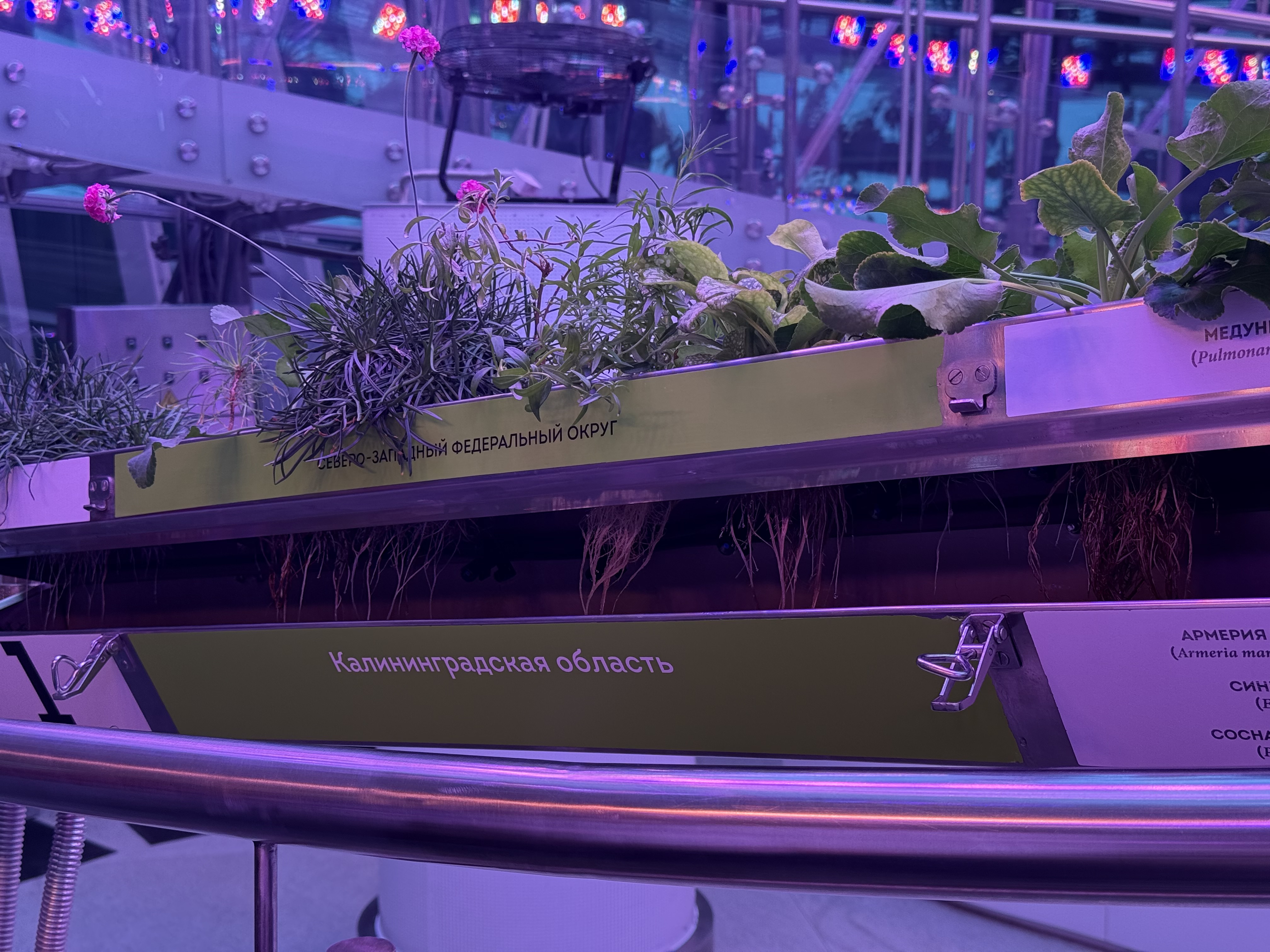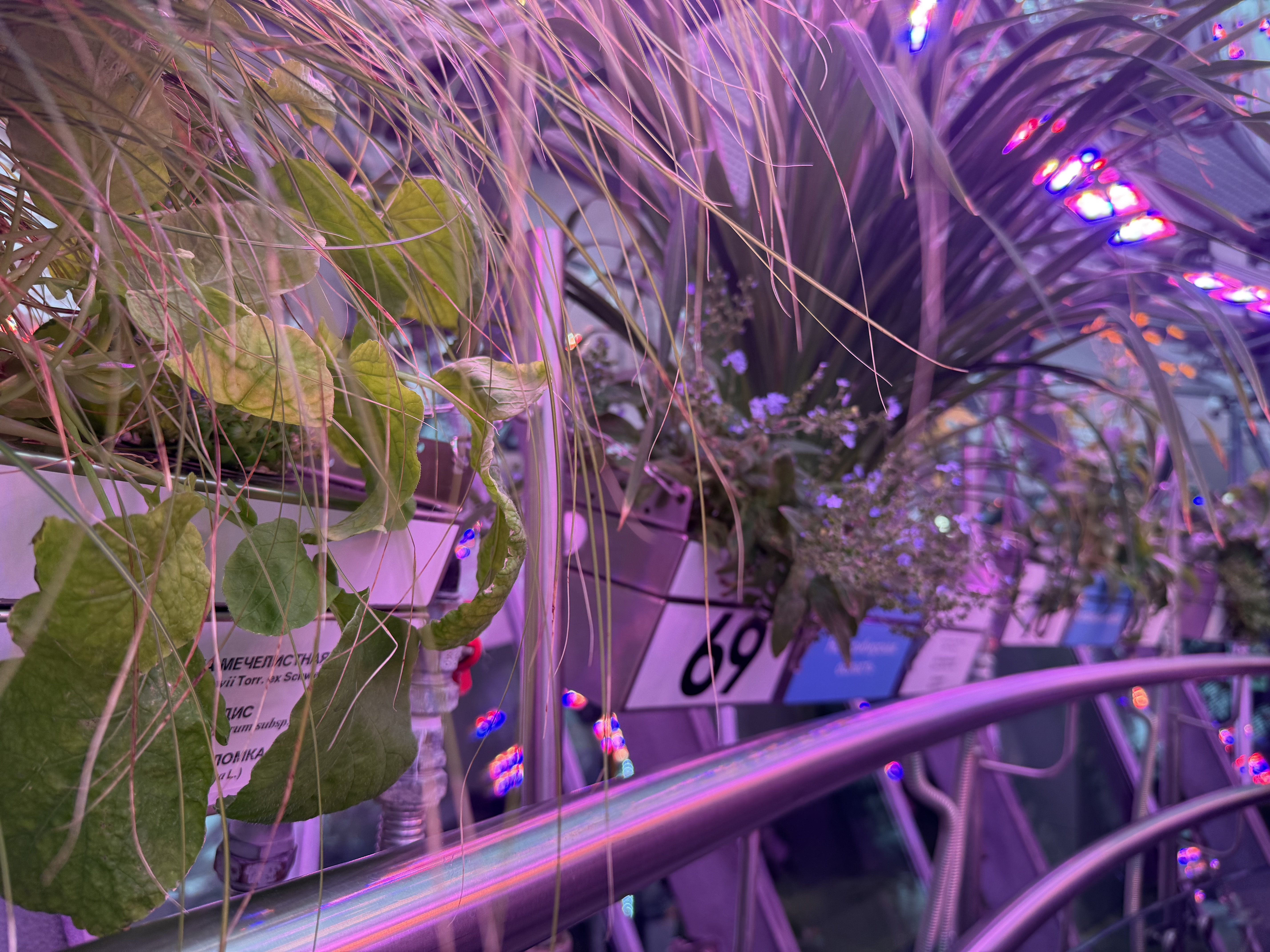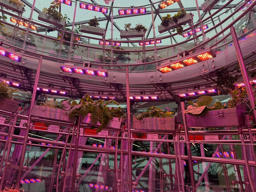 Главное чудо флорариума в том, что все эти растения — от скромной земляники до внушительного лимона — растут без почвы. Технология аэропоники доставляет питательные вещества прямо к корням в виде мелкодисперсного аэрозоля . Благодаря этому экспонаты не просто зеленеют, а регулярно цветут и плодоносят. Сотрудники флорариума даже опыляют растения вручную — маленькими кисточками, заменяя отсутствующих пчёл. А в центре экспозиции часто можно увидеть натюрморты из собранного урожая: выращенные здесь же подсолнухи, лимоны, тыквы, арбузы и момордику — всё это можно рассмотреть вблизи и сфотографировать.