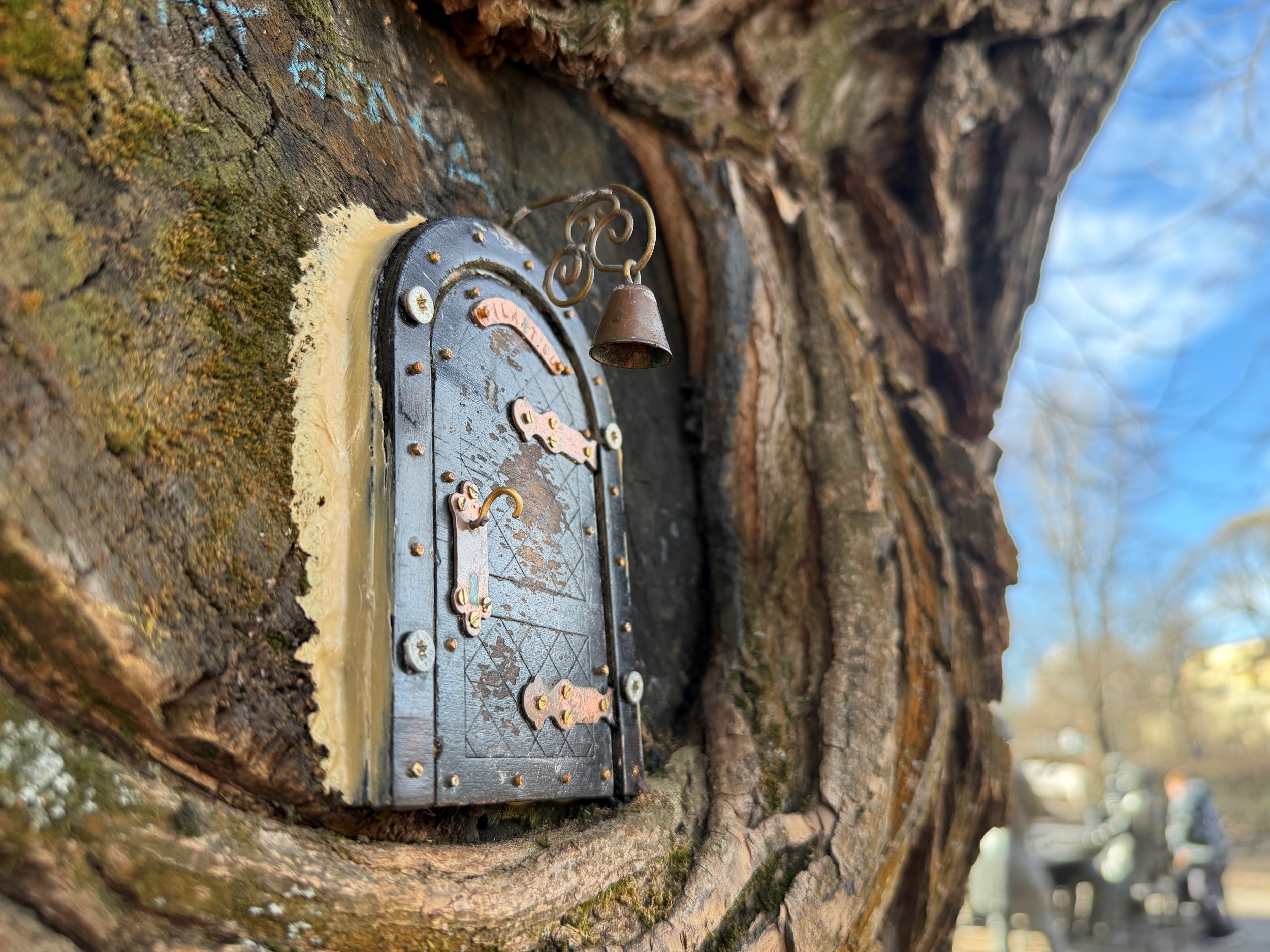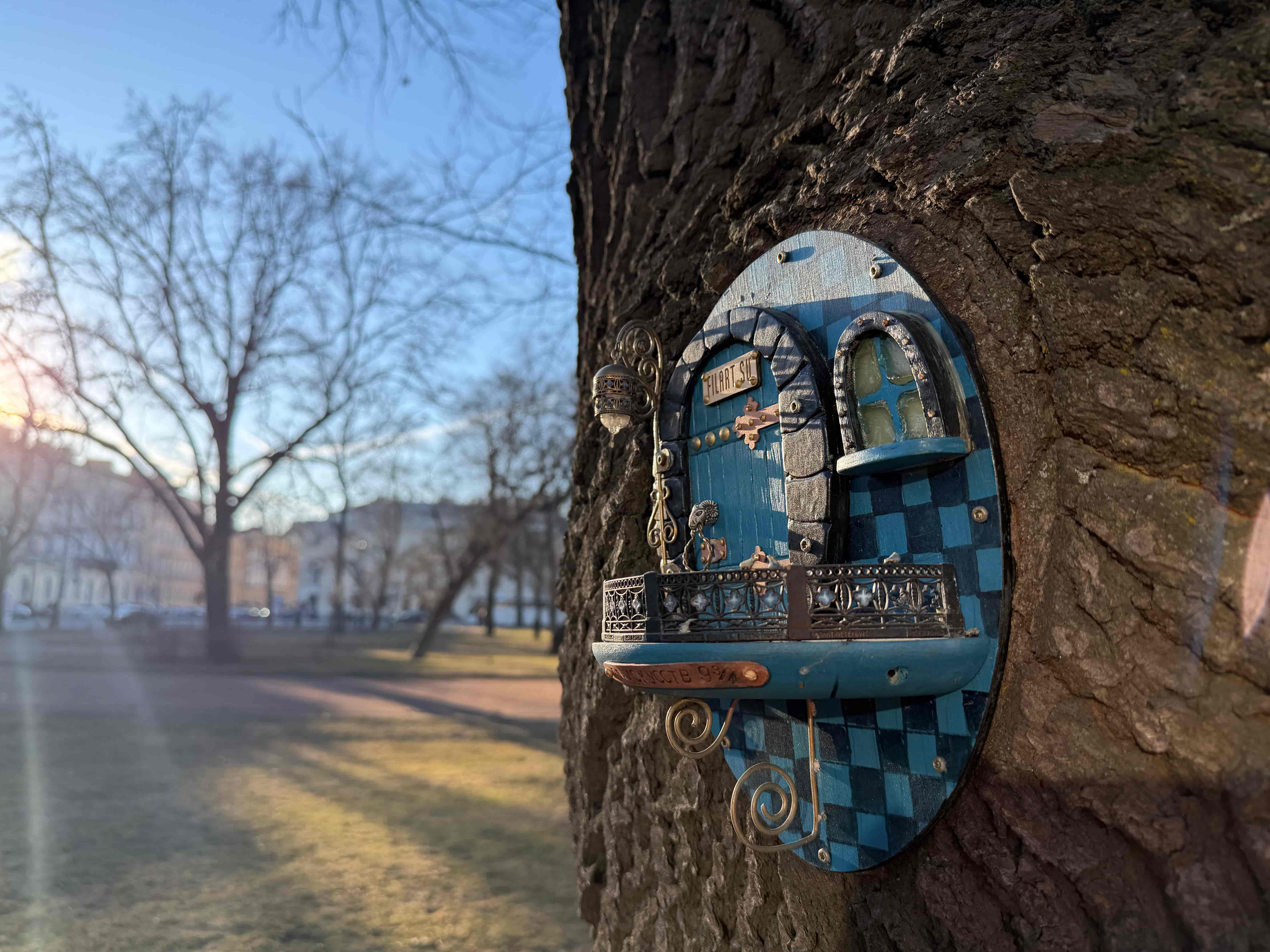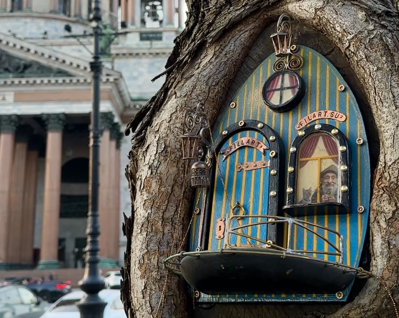 Каждая из дверок оформлена в особом стиле. Некоторые напоминают дубовые, самая яркая находится на Площади Искусств — небесно-голубая в шашечку, с дверной ручкой в форме бараньей головы и резным светильником. А у дверцы в дереве Александровского сада два окошка, из одного выглядывают «местные жители» — гном и его кот. Показываем, как выглядят некоторые инсталляции.