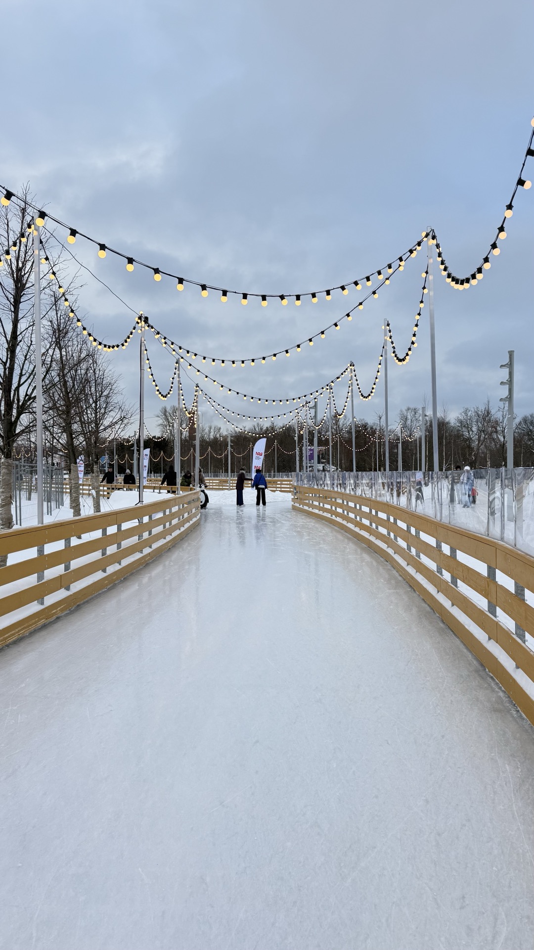 Каток с панорамным видом на Финский залив и вантовый мост. Деревья вокруг украшены гирляндами, отовсюду льётся мягкий свет. Глаз радуют оформление в экостиле и яркий мурал на стене. Рядом с ледовой ареной открыт фудкорт, где есть зимний корнер от сети петербургских пекарен «Слой» со специальным меню горячих напитков и уличной еды.