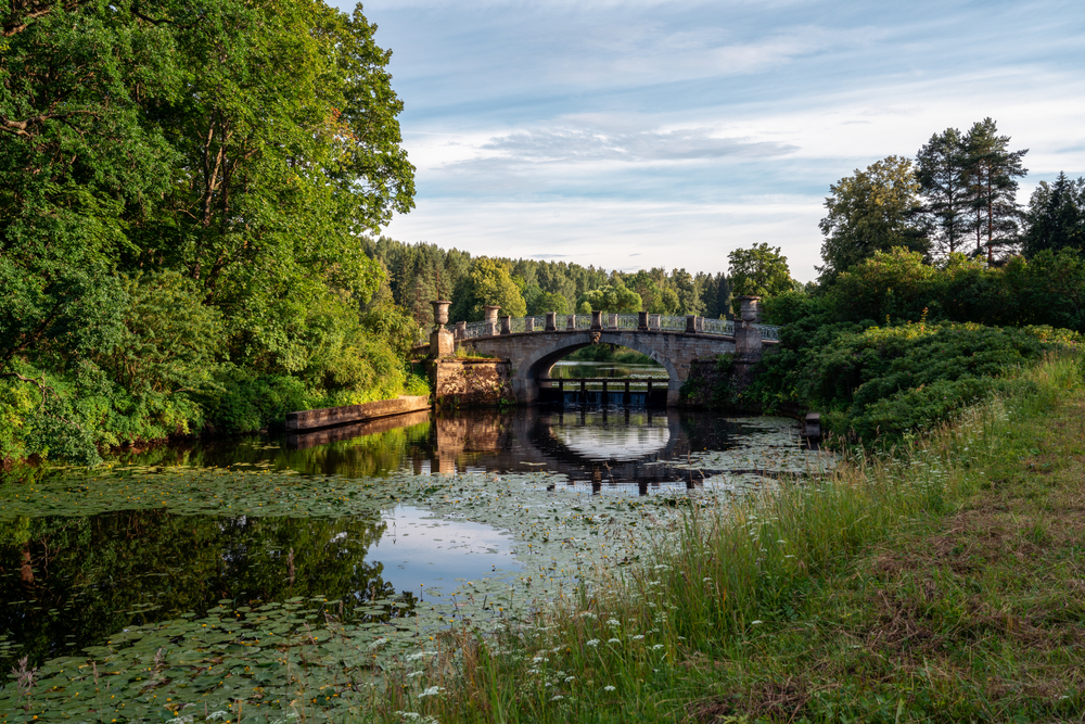 Чудесный пейзаж открывается с Висконтиева моста. Это одна из красивейших переправ в долине реки Славянки с широким водным разливом перед ним. Мост из пудостского известняка построен около 1803 года «каменных дел мастером» Карлом Висконти. Насладиться красотами парка рекомендуем на экскурсии, в которую также включены билеты в Павловский дворец.