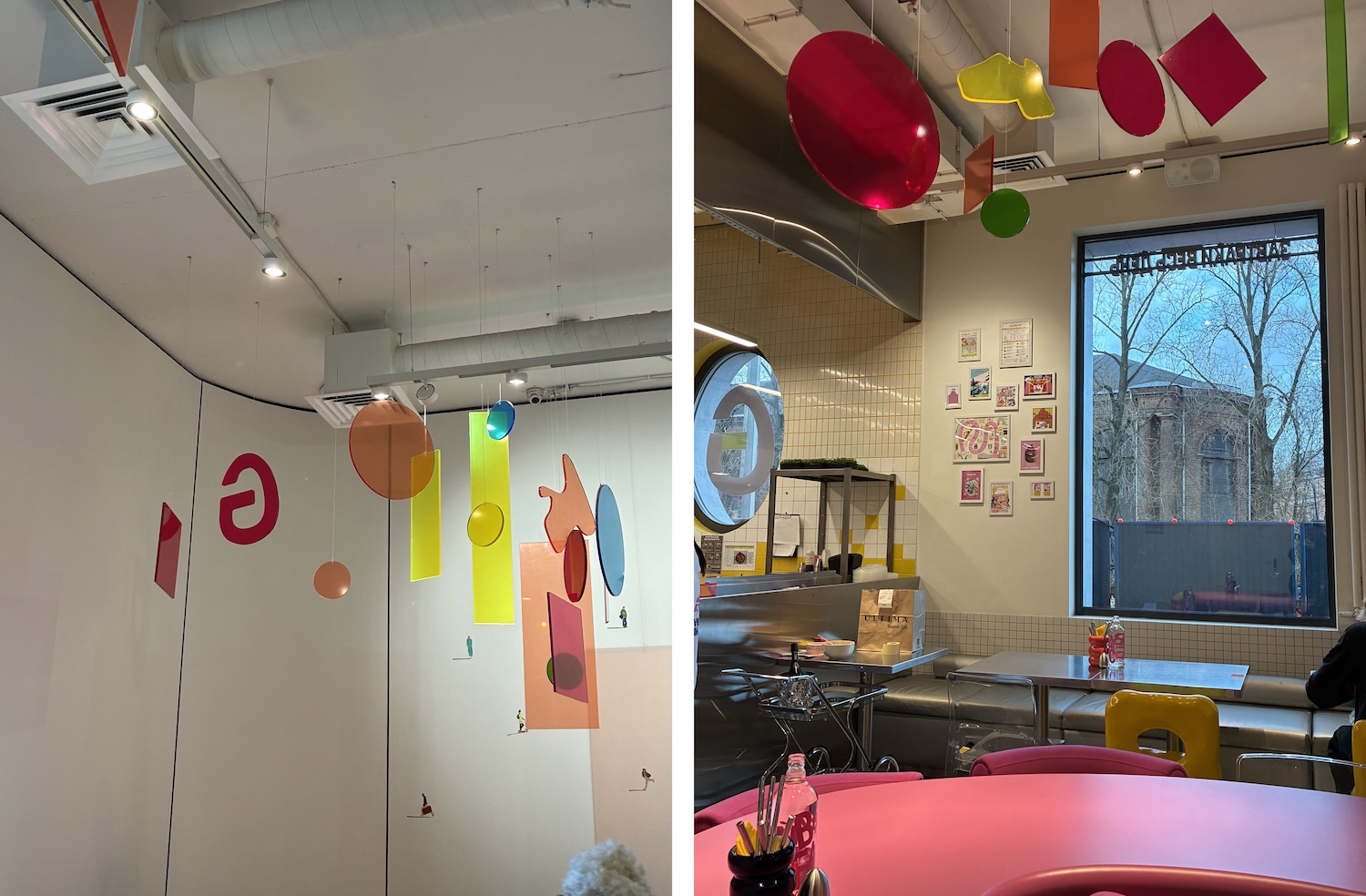 Один из петербургских адресов московской сети, которая специализируется на эстетичных завтраках. Дофаминовый интерьер с розовыми и жёлтыми акцентами намекает на фирменное блюдо — яичницу с беконом.