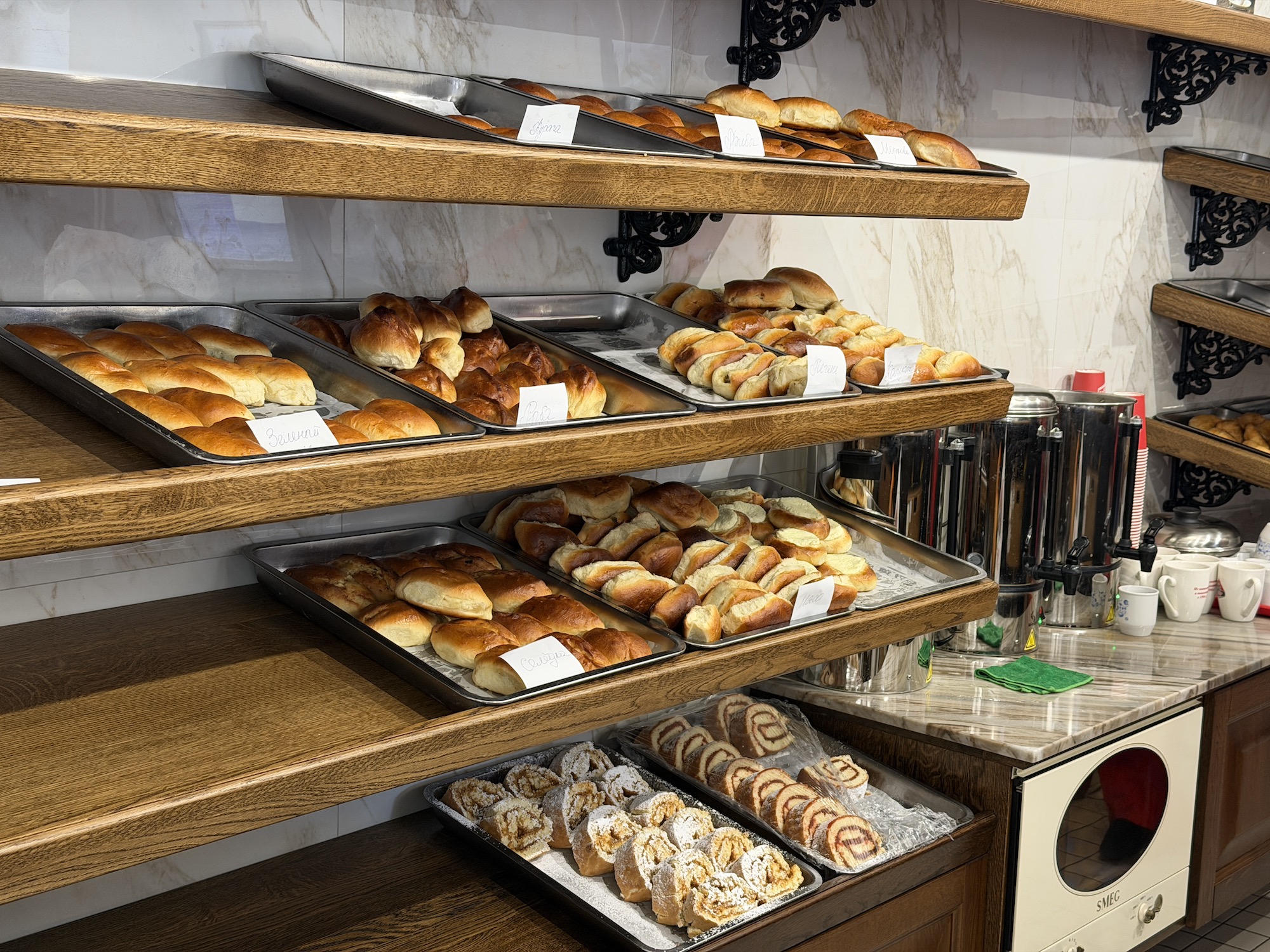 Интерьер соответствует времени открытия первой точки — гостей встречает минималистичный советский шик с гигантскими люстрами и добротной деревянной мебелью. На прилавке ждут разнообразные выпечные пирожки: сытные с мясом или капустой и яйцом, сладкие с яблоками или повидлом. Есть и жареная сдоба — беляш, сосиска в тесте и не только.