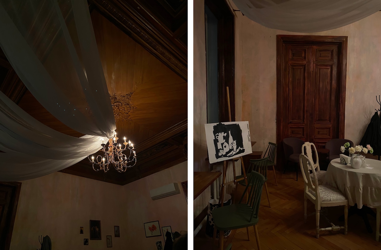 Камерная кофейня в одном из красивейших залов особняка Половцова. Атмосферу элегантного французского шика (над меню работала команда «Опетит» / Ôpetit) поддерживает деревянный потолок с резными элементами, витиеватая люстра, камин, свечи и множество произведений искусства.