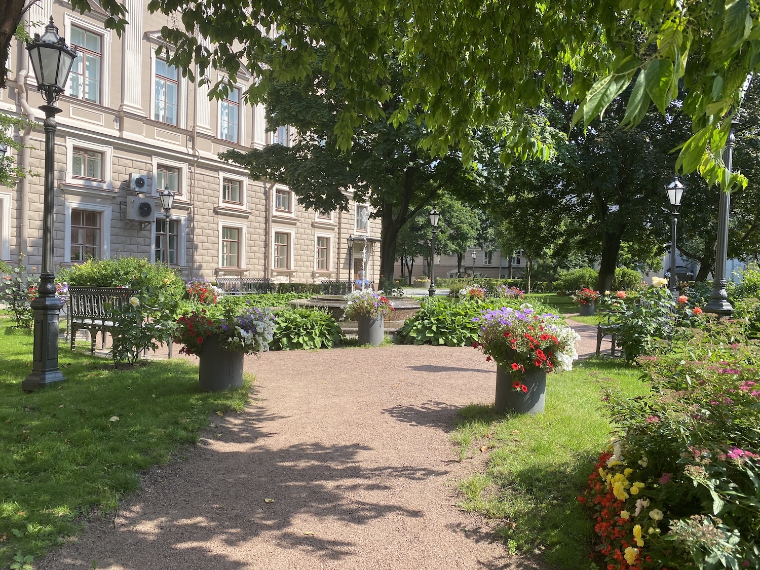 Через дорогу со стороны набережной реки Мойки — вход в Летний сад. Памятник садово-паркового искусства занимает отдельный остров. Изначально место было частью летней резиденции Петра I. Царю хотелось, чтобы его любимый сад ни в чём не уступал паркам европейских монархов. Поэтому Летний внимательно декорировали: украшали мраморными статуями и бюстами, разбивали пышные клумбы, создавали затейливые фонтаны. Прекрасна даже ограда сада. Воздушная, «лучшая в мире», как называла её Анна Ахматова в знаменитом стихотворении.