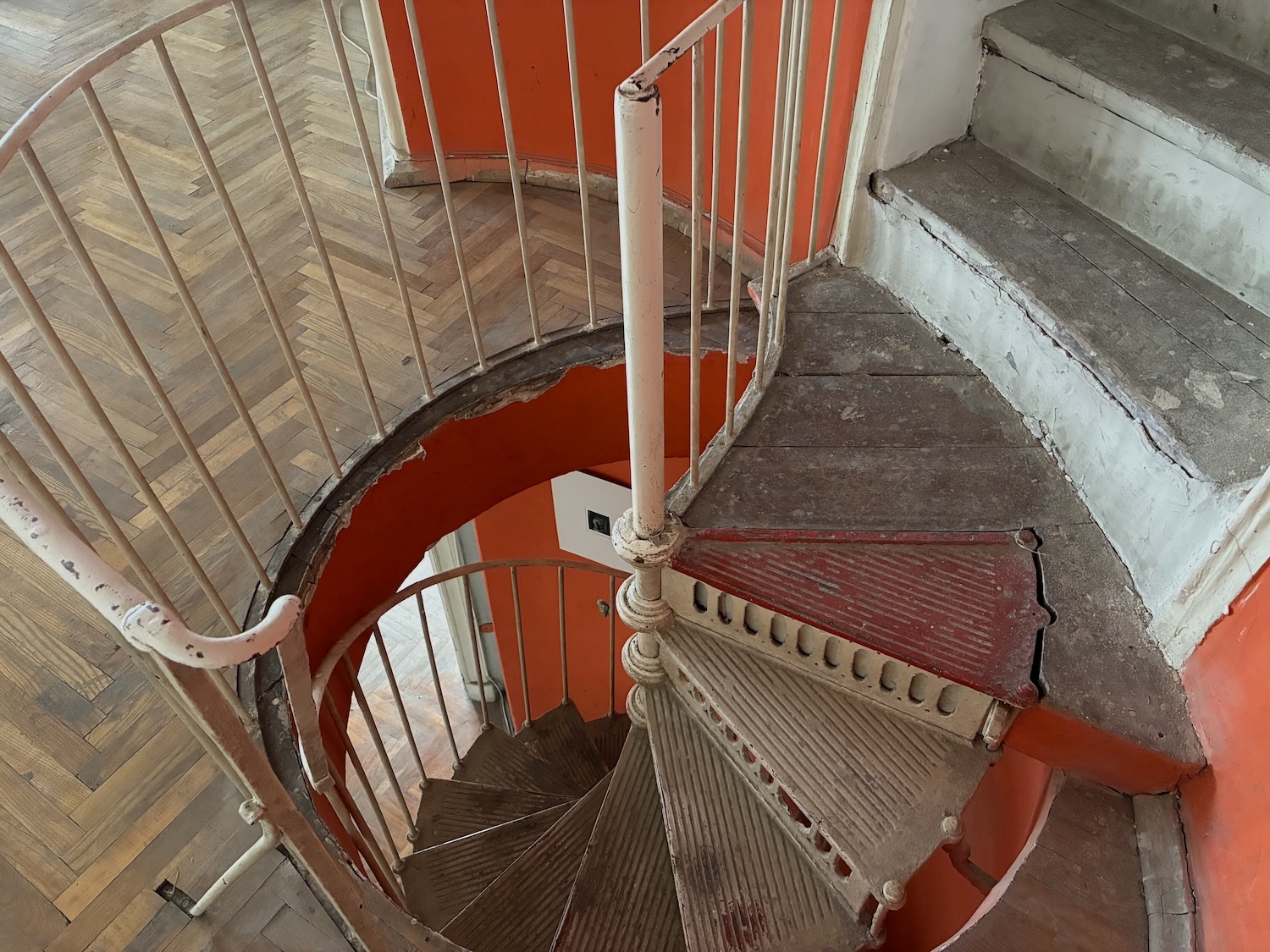 Один из объектов в комнате внутри башни — деревянная приставная лестница. Поднявшись по ней можно было оказаться на вершине дома, наблюдать городские улицы из круглых окон. Для безопасности гостей сейчас проход закрыт: можно лишь заглянуть в отверстие и увидеть своды, над которыми находится шпиль.