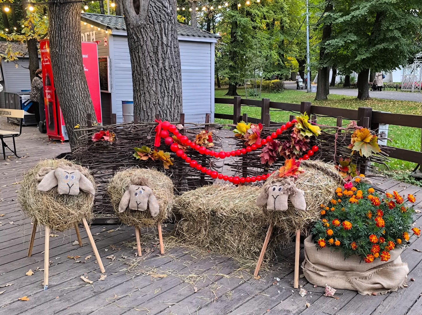 Да и сами по себе аллеи, прямые или причудливо изгибающиеся, застланные ковром из листьев, служат прекрасным природным фотофоном. А кроме того, в парке регулярно обновляют сезонный декор и создают необычные ландшафтные композиции. Например, в этом году, посетителей встречают пушистые овечки из сена.
