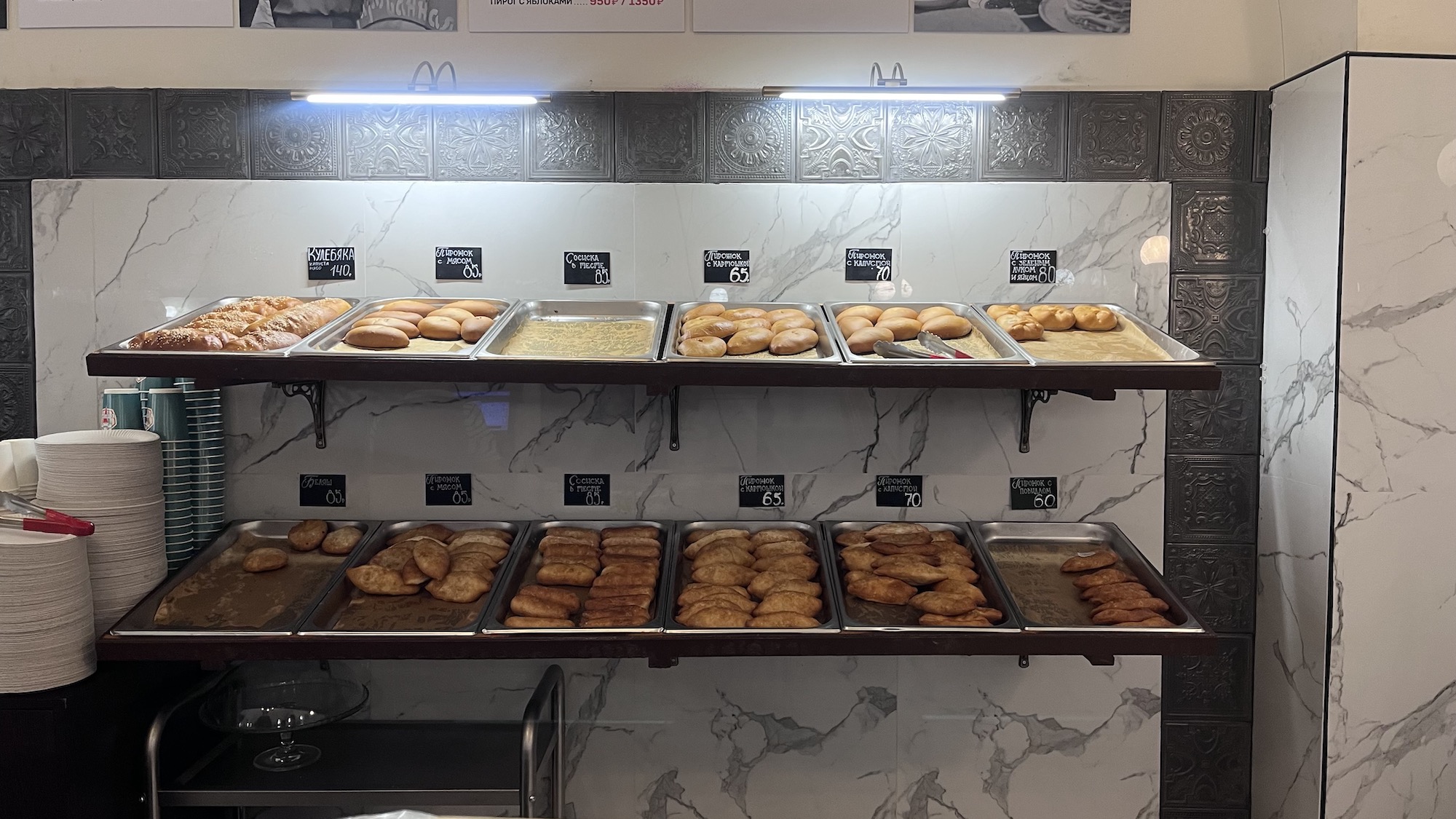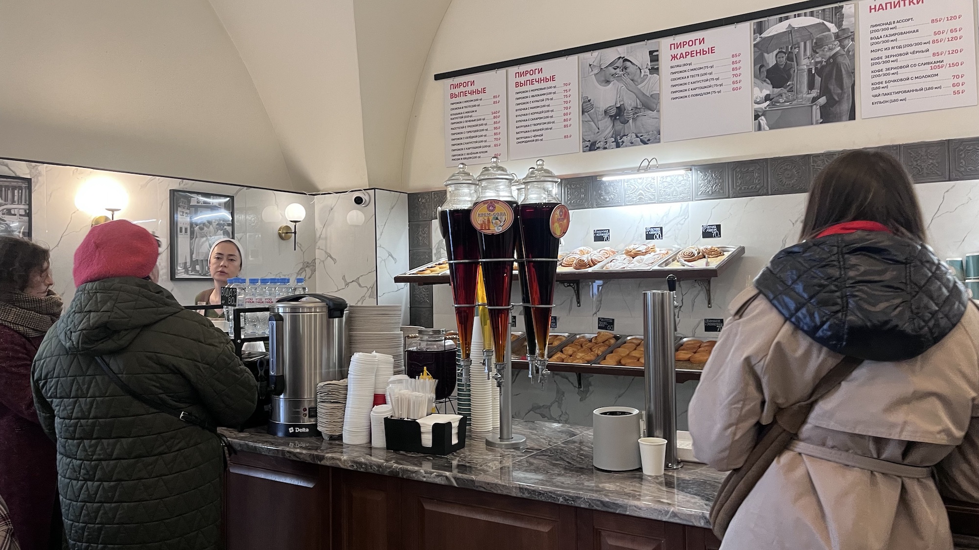 Говорят, что блюда здесь готовят по рецептам 1955 года. Локация действительно напоминает советский буфет: белая плитка в чёрном обрамлении на полу, высокие столики с барными стульями, кассиры в накрахмаленных чепцах и куча народу в очереди за пирожками. Заказывают не только, чтобы оперативно утолить голод на месте: пирожки уносят с собой — вдоволь насытиться и угостить домашних. Например, популярны варианты с горбушей, повидлом или луком, рисом и яйцом.