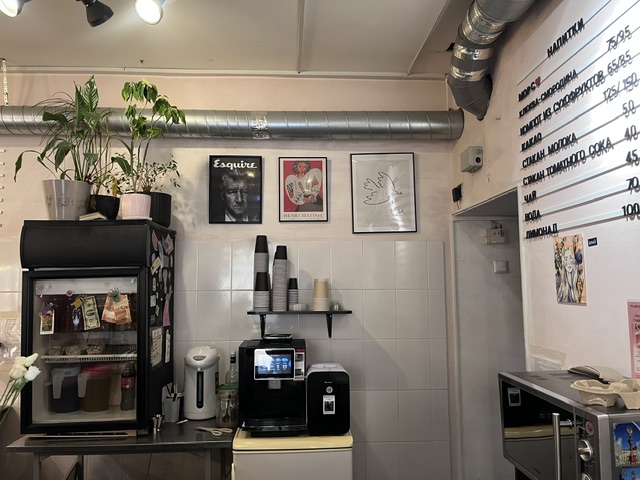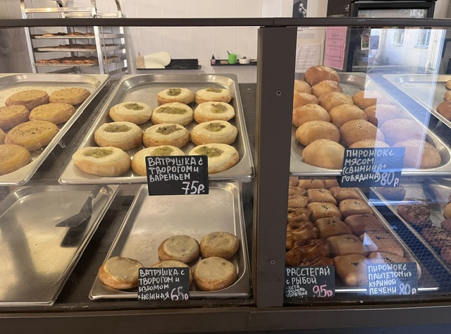 Зал миниатюрный — всего четыре столика. Витрина с выпечкой не кажется большой, но выбор есть: для любителей мяса, овощей и сладкого. Представлены классические позиции вроде пирожков с капустой, открытого пирожка-жульена или пирожка с луком и яйцом. Но, по словам сотрудников, популярностью пользуются и неординарные начинки: например, паштет из куриной печени в сливках или со свекольной ботвой, творогом и кинзой. Последний, кстати, действительно очень хорош: соотношение теста и начинки приближено к идеальному, сочный творог в сочетании с зеленью даже напомнил сибирские вареники.