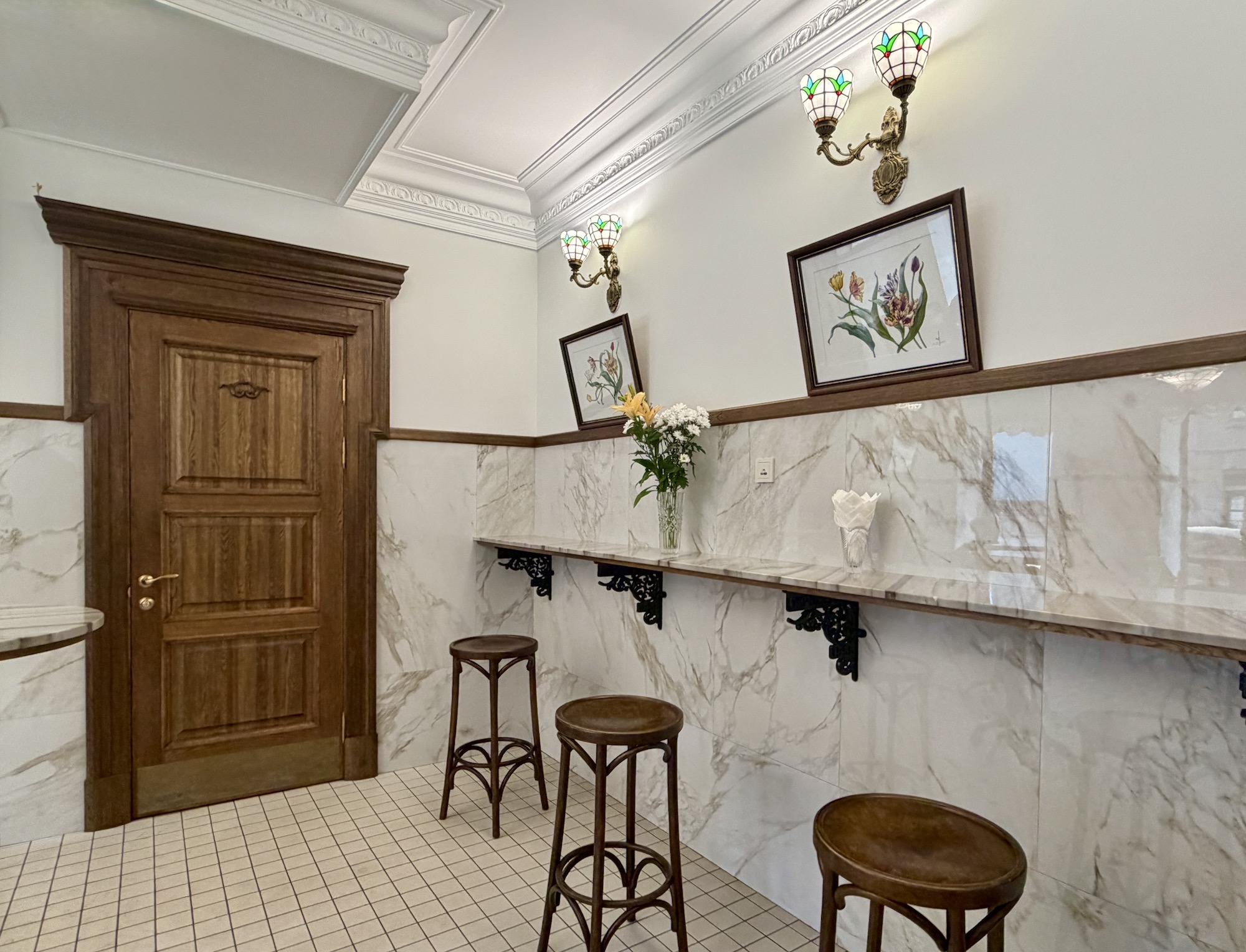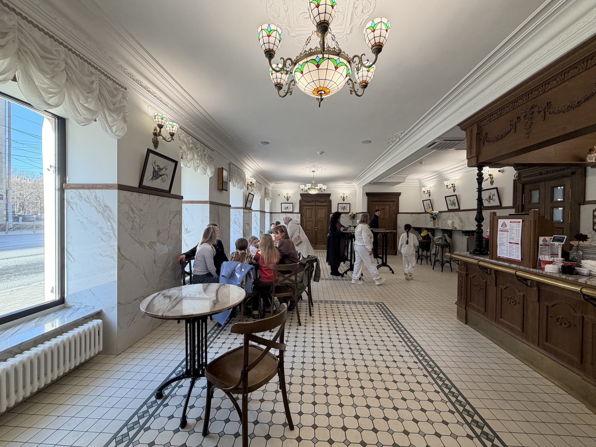 Придя сюда, гости будто оказываются в машине времени. Во-первых, из-за интерьера с элементами советской роскоши: мраморные стены, тяжелые деревянные двери, элегантные витражные люстры. Эдакий люкс СССР.