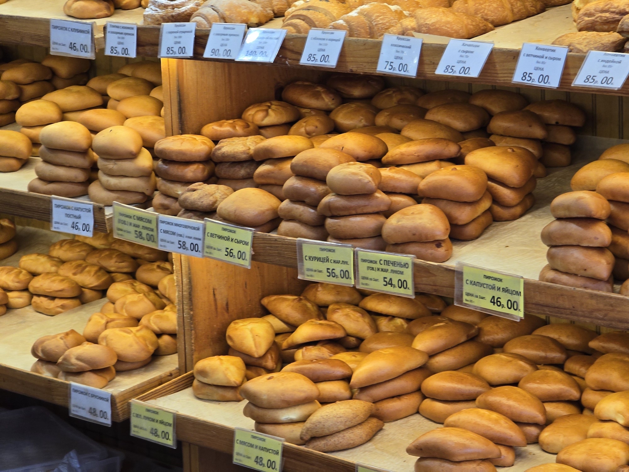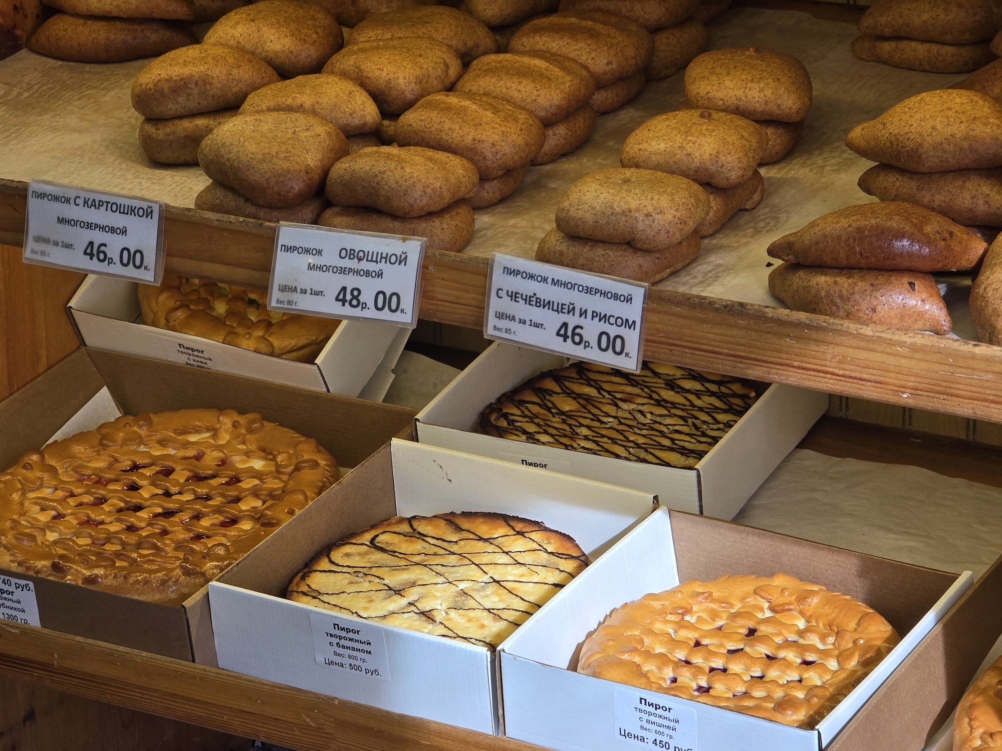 Тут часто покупают церковный хлеб: морковно-свекольный, луковый, с отрубями. Его готовят на закваске по старорусским рецептам. Мы же идём за пирожками: всегда свежими и аппетитными. С ветчиной и сыром — на завтрак, с печенью и жареным луком — к обеду, с лимоном или клубникой — к вечернему чаю.