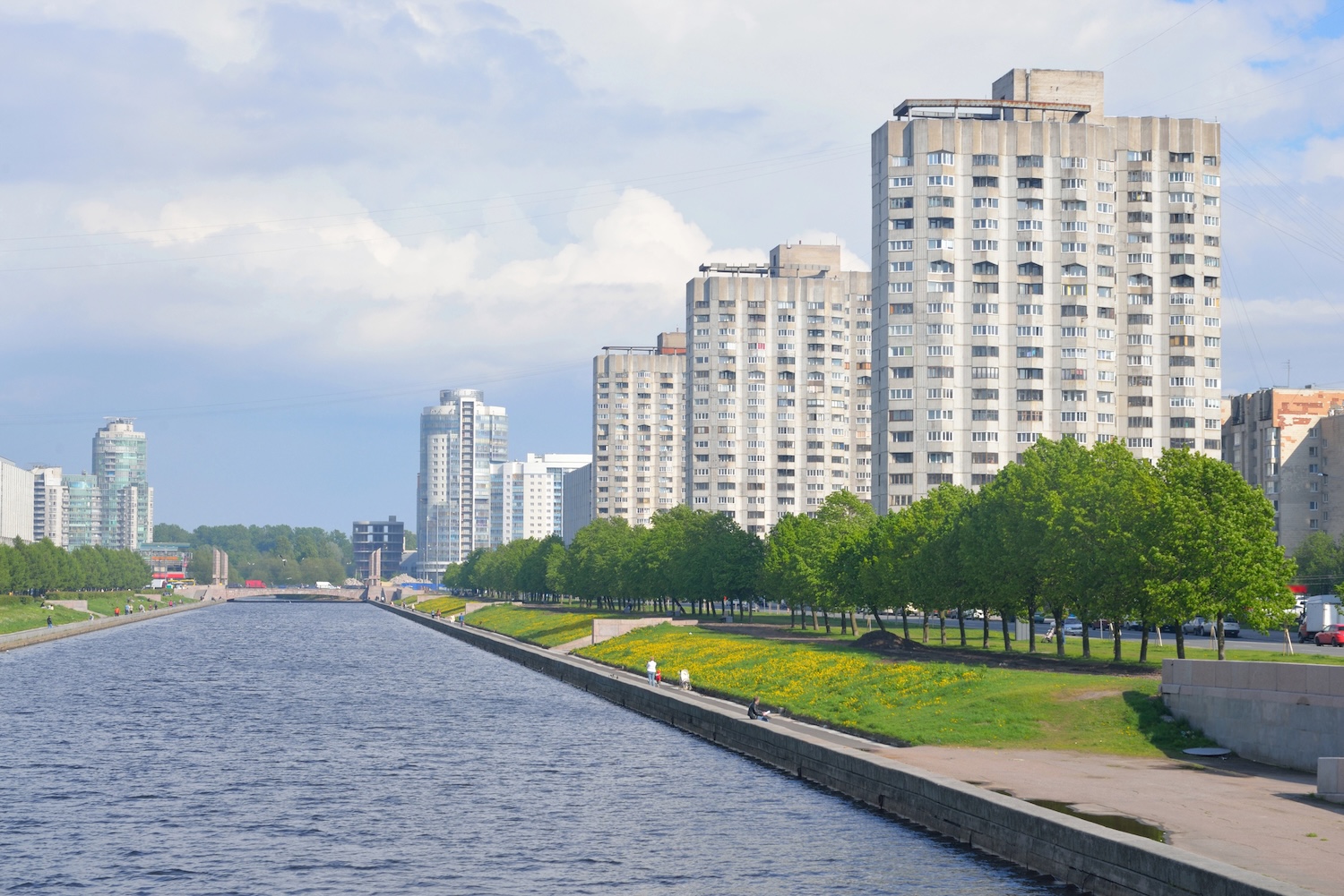Сейчас, следуя по извилистому берегу Смоленки, можно пройти укромной дорогой мимо кладбища и выйти на Новосмоленскую набережную. Там сохранились архитектурные памятники советского модернизма и позднего брутализма — знаменитые «дома на курьих ножках» с одной стороны, а с другой — самый длинный дом в Петербурге с исполинскими арками.