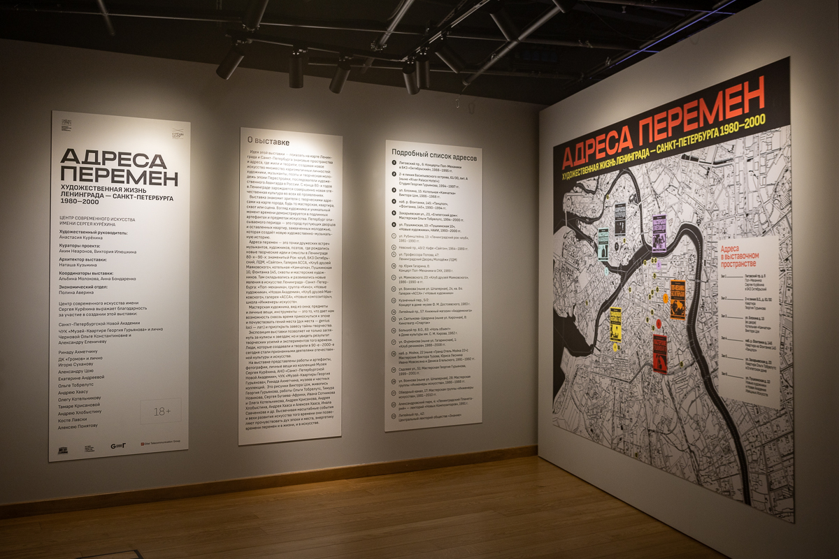 Другое пространство — для временных экспозиций — поместили на подземном, минус первом этаже. Сейчас его занимает проект «Адреса перемен». «Выставка рассказывает об адресах в Ленинграде и Санкт-Петербурге с 1980 по 2000 годы, по которым жили, творили, создавали новое искусство харизматичные личности, художники, музыканты. Многие из них сейчас известны и в коллекциях Государственного Русского музея и Эрмитажа», — пояснил куратор выставки Аким Неаронов.