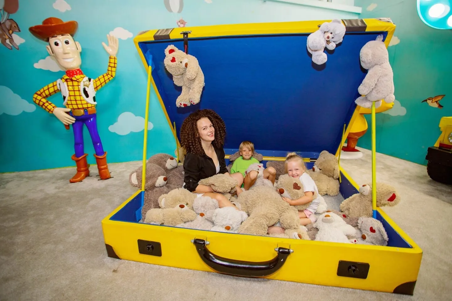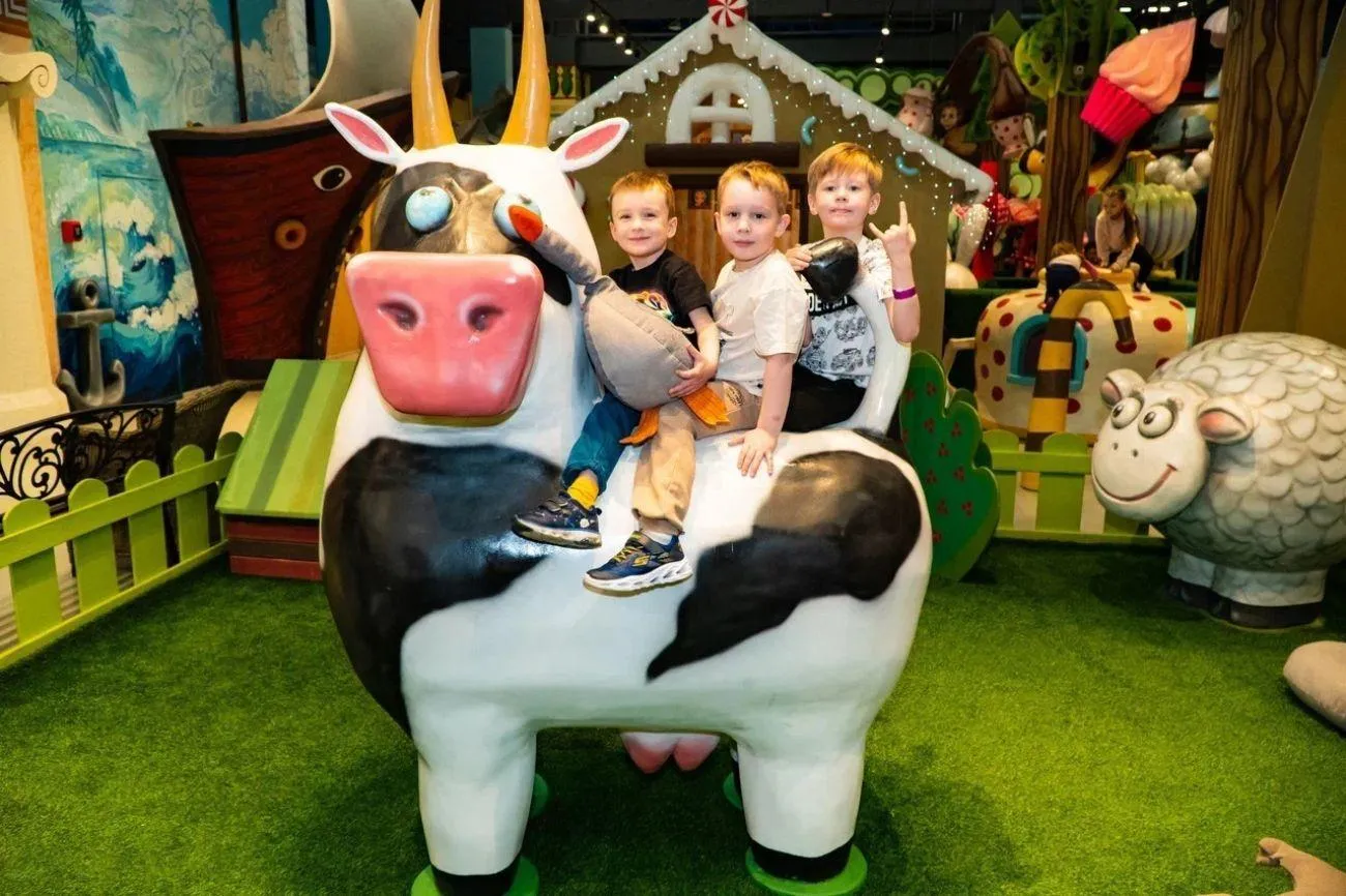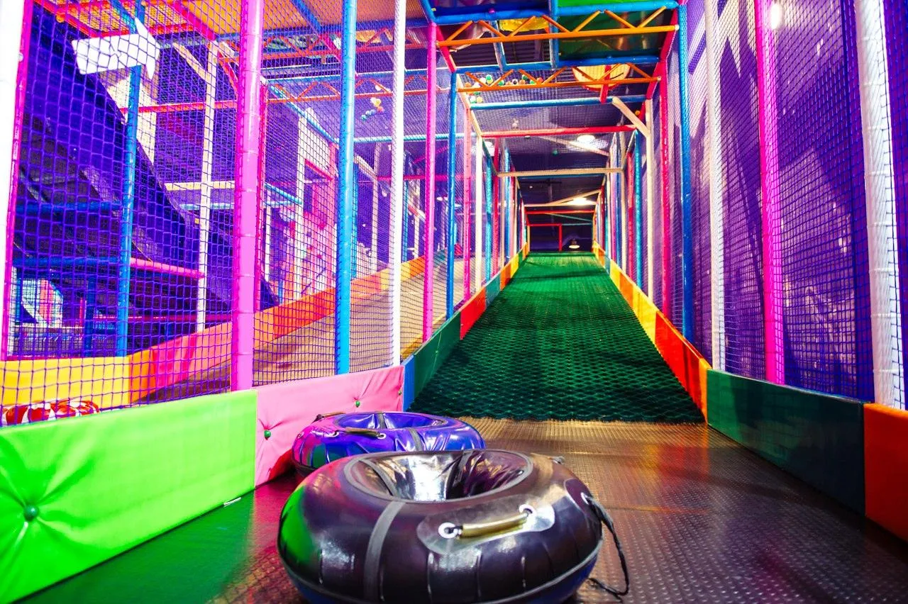 Огромная игровая площадка с большим выбором активностей: есть лабиринт с горками, пневматические подушки, скалодром, тарзанка, батуты, футбольное и баскетбольное поле, горки с ватрушками, поролоновый бассейн, аэрохоккей и аквагрим. Отдохнуть и перекусить можно в семейном кафе. А самые яркие моменты дня запечатлят профессиональные фотографы, которые работают на площадке.