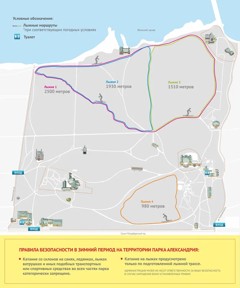 Важно обратить внимание, что в парке нет камер хранения и проката. Также посетителей предупреждают, что посещение лыжни с животными запрещено.